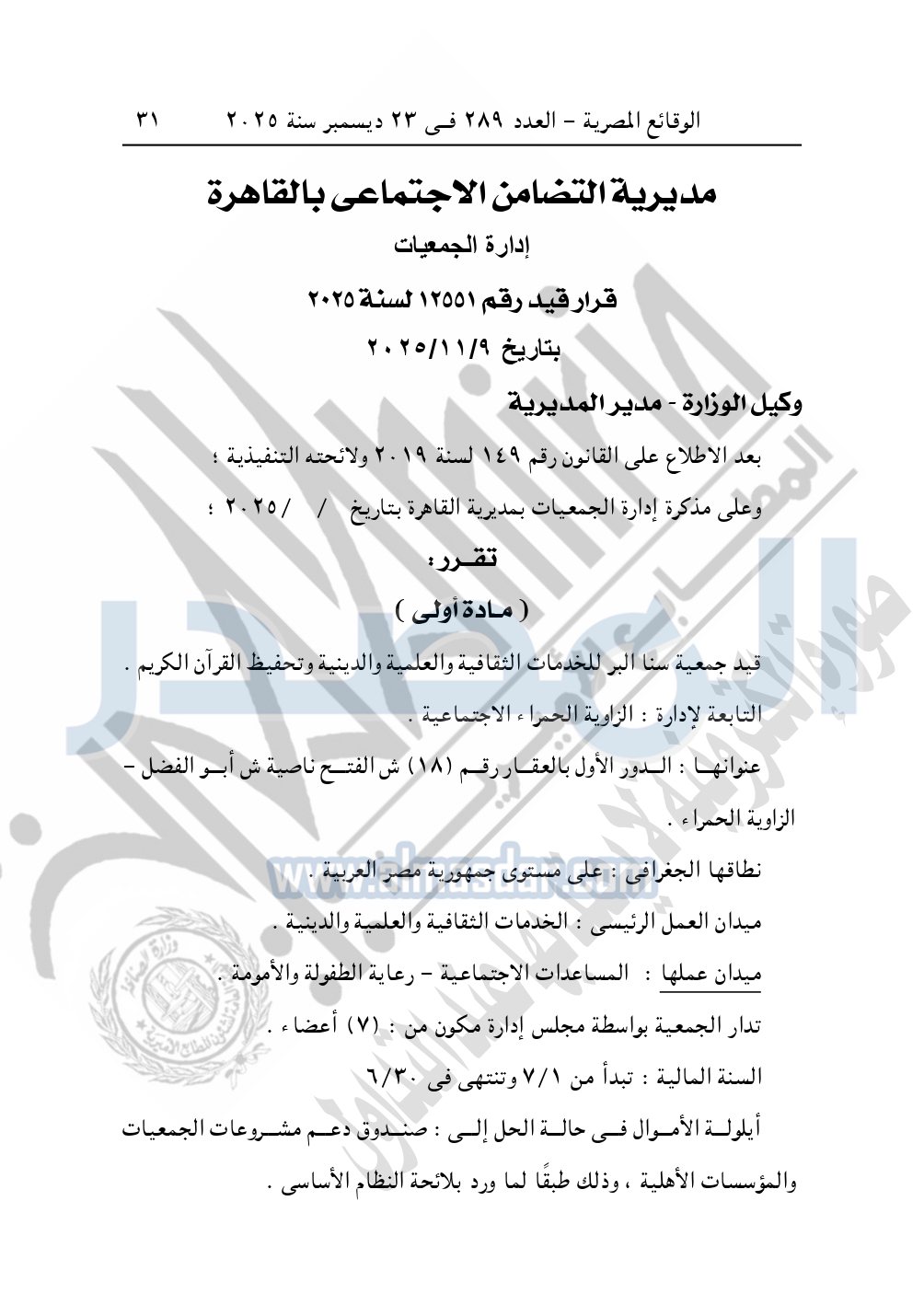 وأيضا نشرت الوقائع المصرية في العدد 289، بتاريخ 23 ديسمبر 2025، قرار مديرية التضامن الاجتماعي بالقاهرة، قيد 12551 لسنة 2025، بتاريخ 9-11-2025، بشأن قيد جمعية سنا البر للخدمات الثقافية والعلمية والدينية وتحفيظ القرآن الكريم.