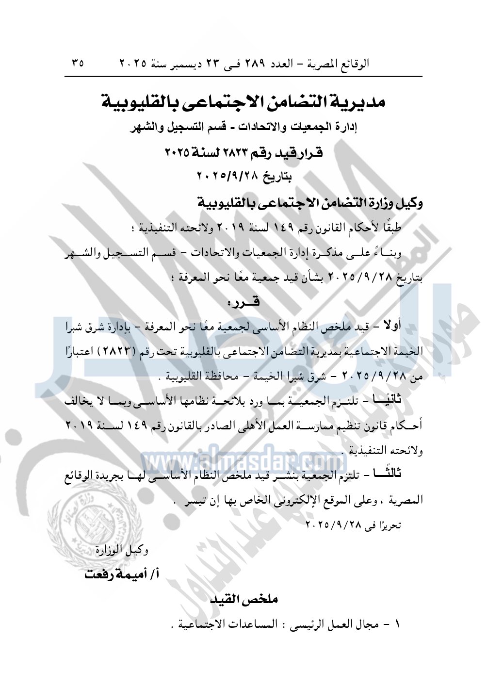 ونشرت الوقائع المصرية في العدد 289، بتاريخ 23 ديسمبر 2025، قرار مديرية التضامن الاجتماعي بالقليوبية، قيد 2823 لسنة 2025، بتاريخ 28-9-2025، بشأن قيد جمعية معاً نحو المعرفة.