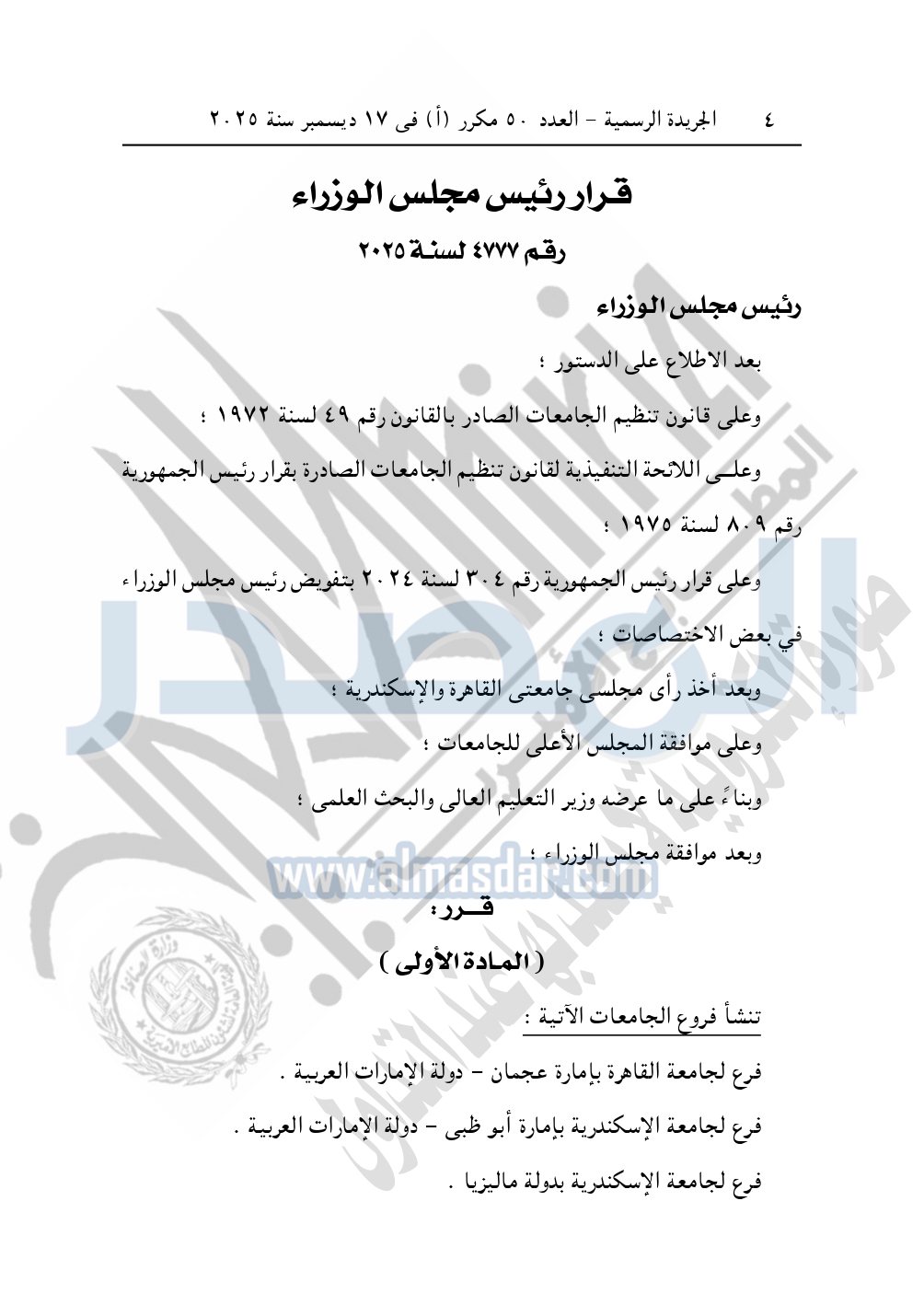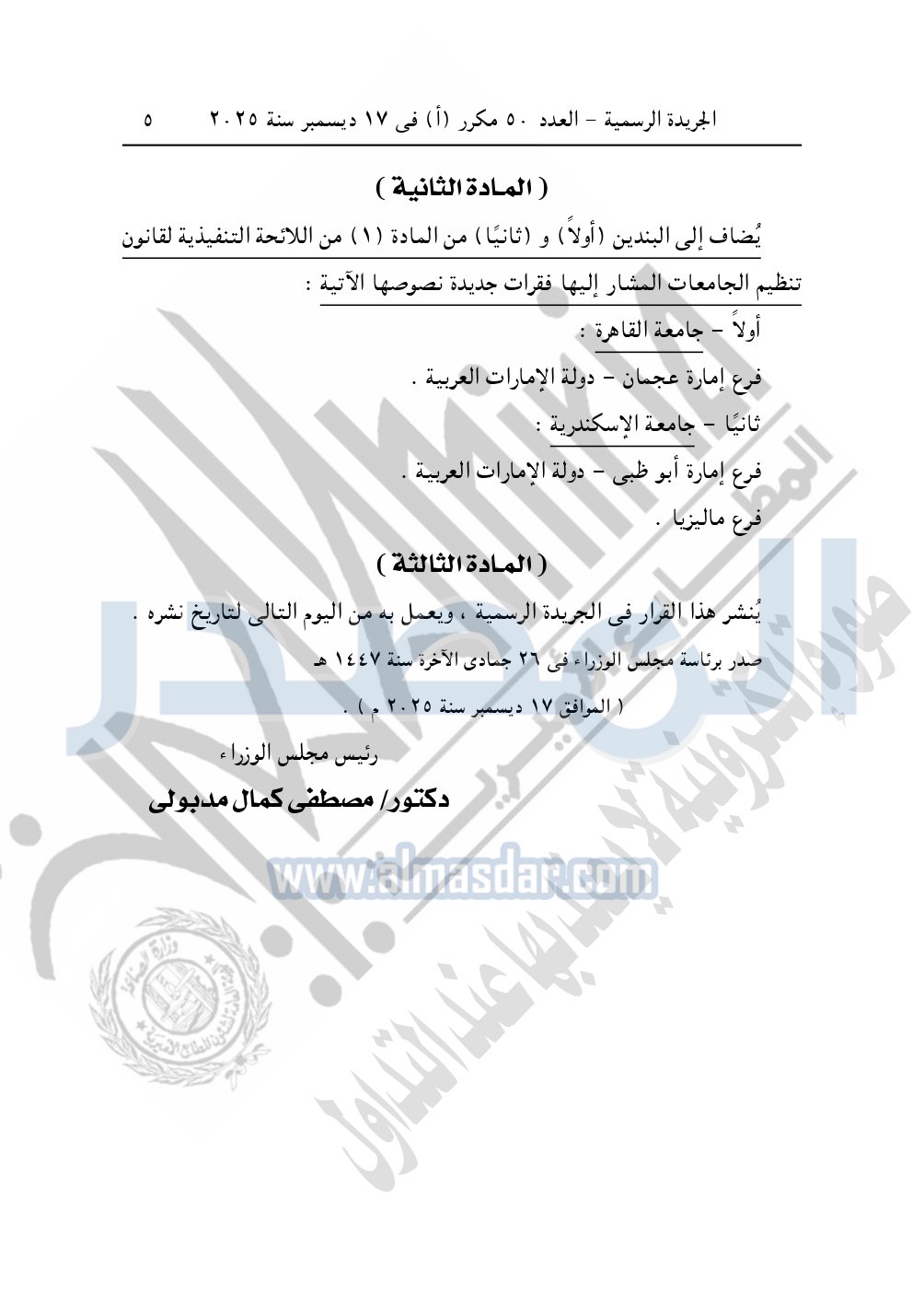 نشرت الجريدة الرسمية، في العدد 50 مكرر "أ"، الصادر في 17 ديسمبر سنة 2025، قرار رئيس مجلس الوزراء، رقم 4777 لسنة 2025، بشأن إنشاء فروع للجامعات المصرية بالإمارات وماليزيا.