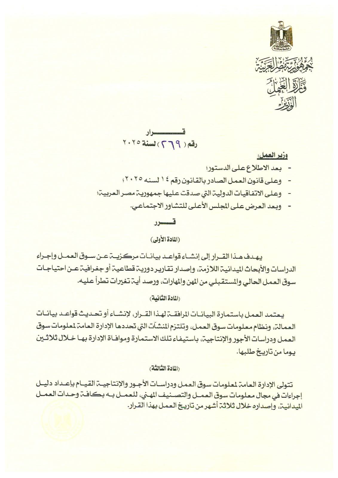وأوضح الوزير، أن القرار يُمثّل خطوة محورية نحو التخطيط القائم على الأدلة، من خلال رصد تطورات سوق العمل، واحتياجاته القطاعية والجغرافية، ودراسة الأجور والإنتاجية، والتغيرات التي تطرأ على المهن والمهارات المطلوبة، بما يدعم سياسات التشغيل، ويعزز فرص العمل اللائق، ويخدم أهداف التنمية الاقتصادية والاجتماعية.