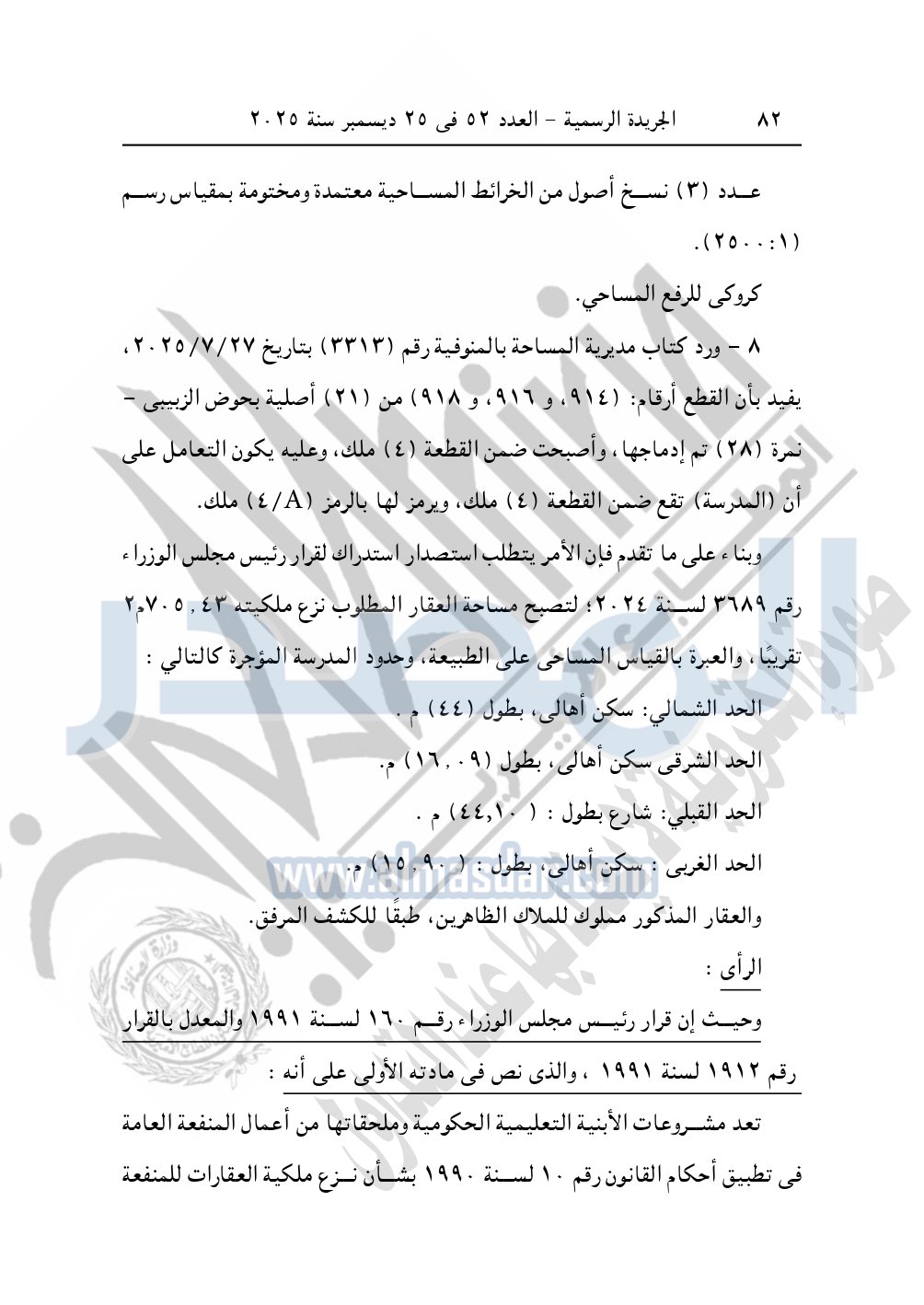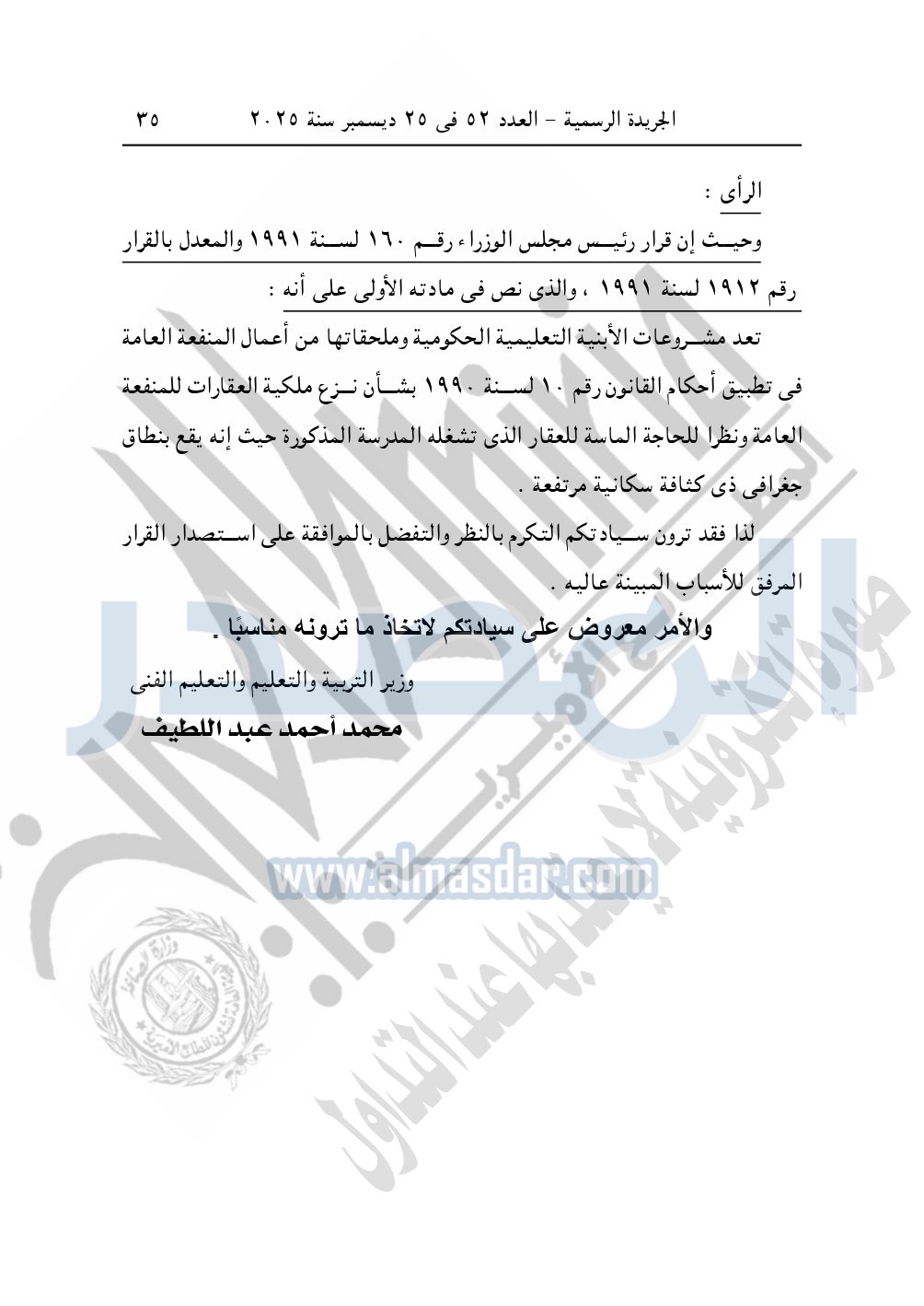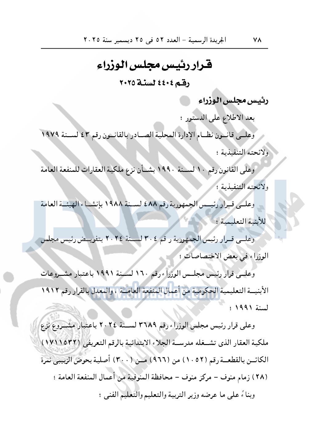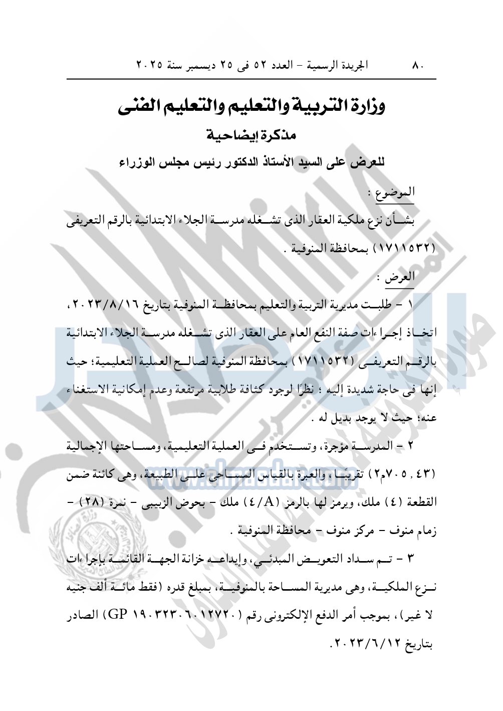 كما نشرت الجريدة الرسمية، في العدد 52 بتاريخ 25 ديسمبر 2025، قرار رئيس مجلس الوزراء، رقم 4404 لسنة 2025، بشأن نزع ملكية العقار الذي تشغله مدرسة الجلاء الابتدائية.