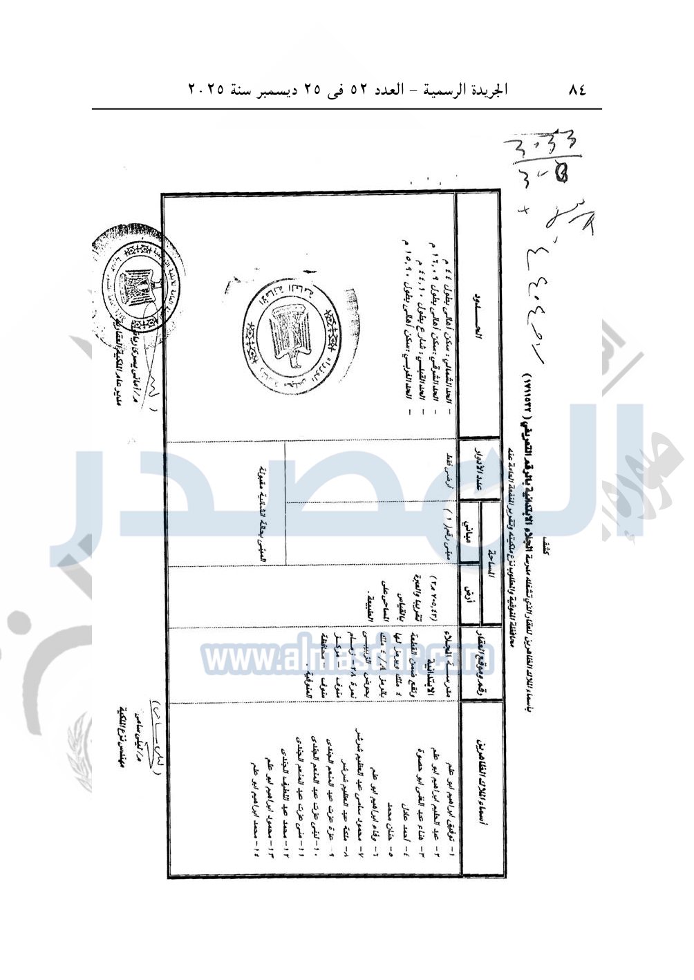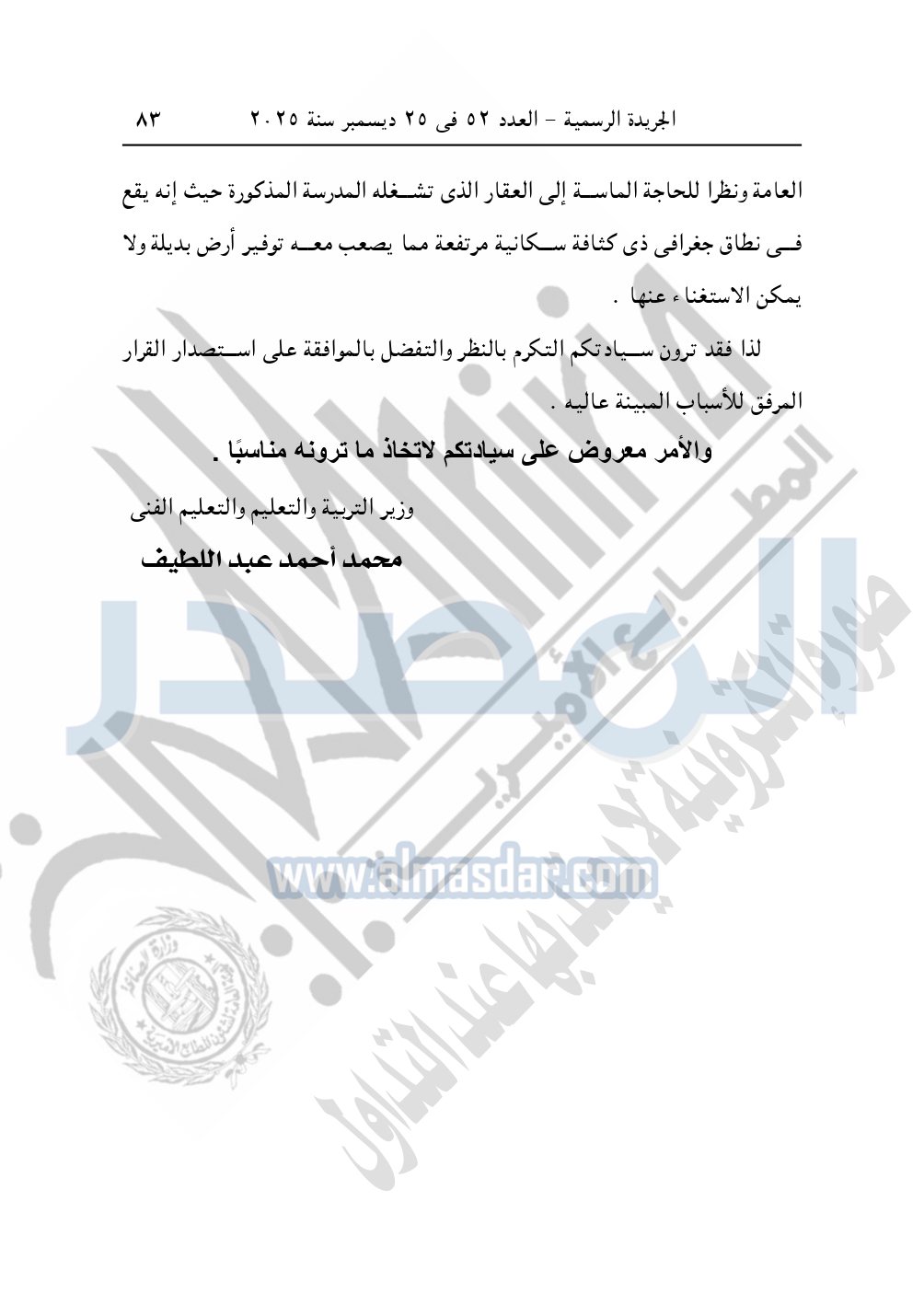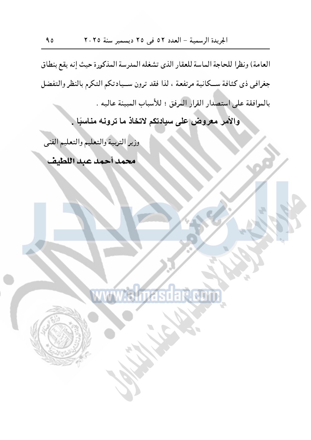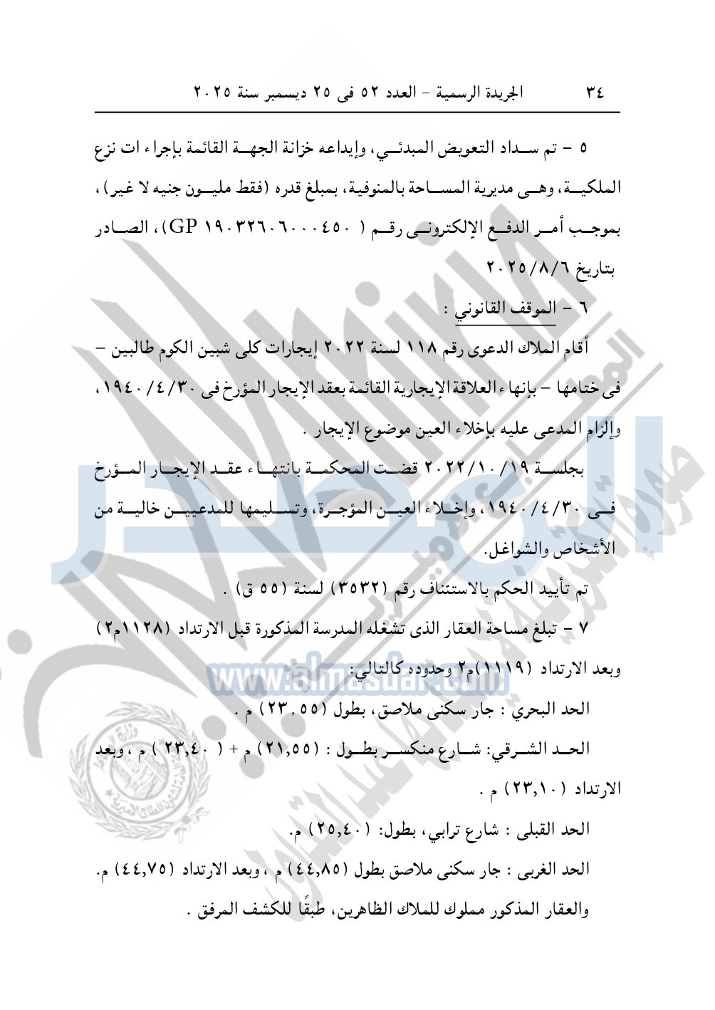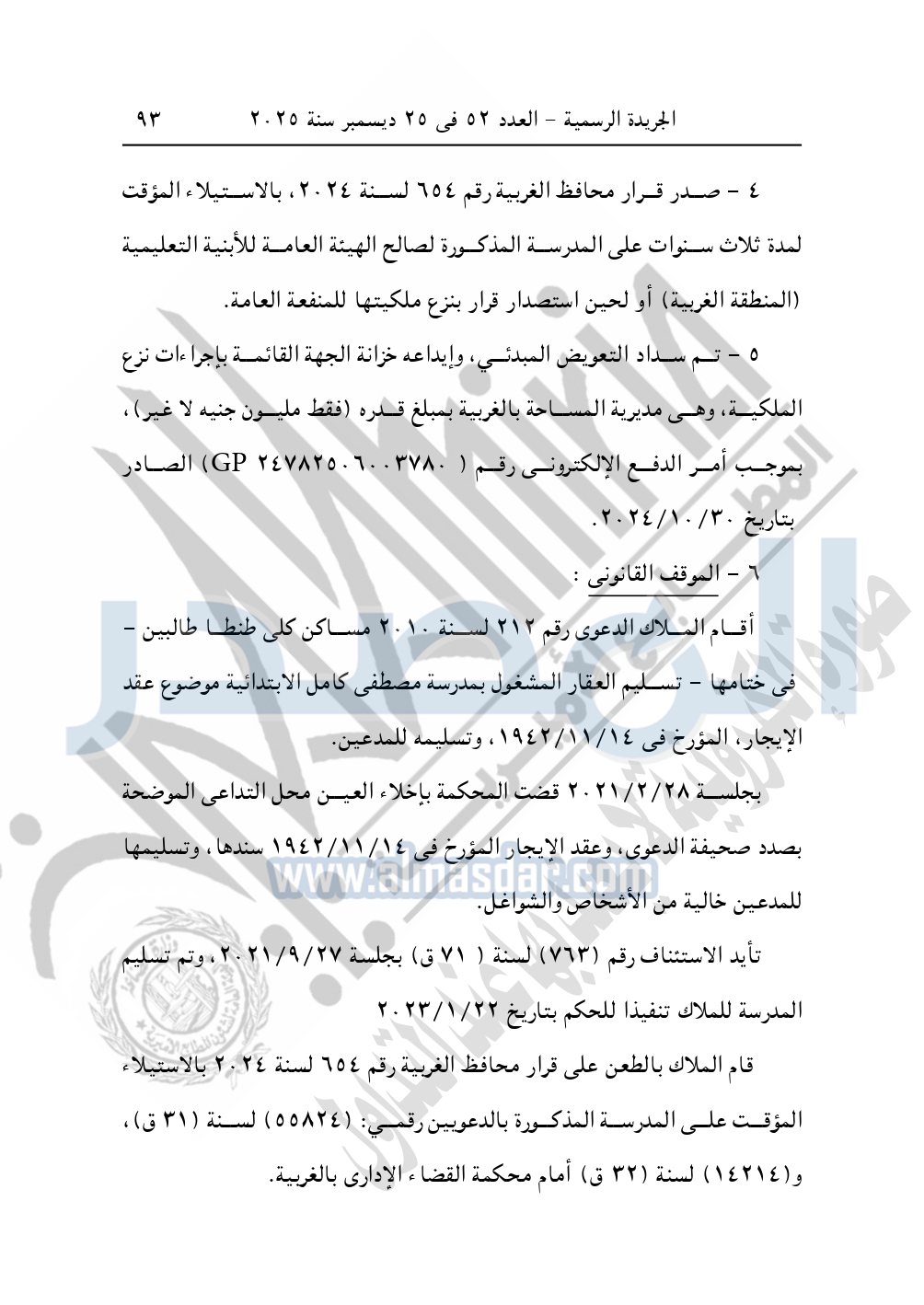 كما نشرت الجريدة الرسمية، في العدد 52 بتاريخ 25 ديسمبر 2025، قرار رئيس مجلس الوزراء، رقم 4404 لسنة 2025، بشأن نزع ملكية العقار الذي تشغله مدرسة الجلاء الابتدائية.