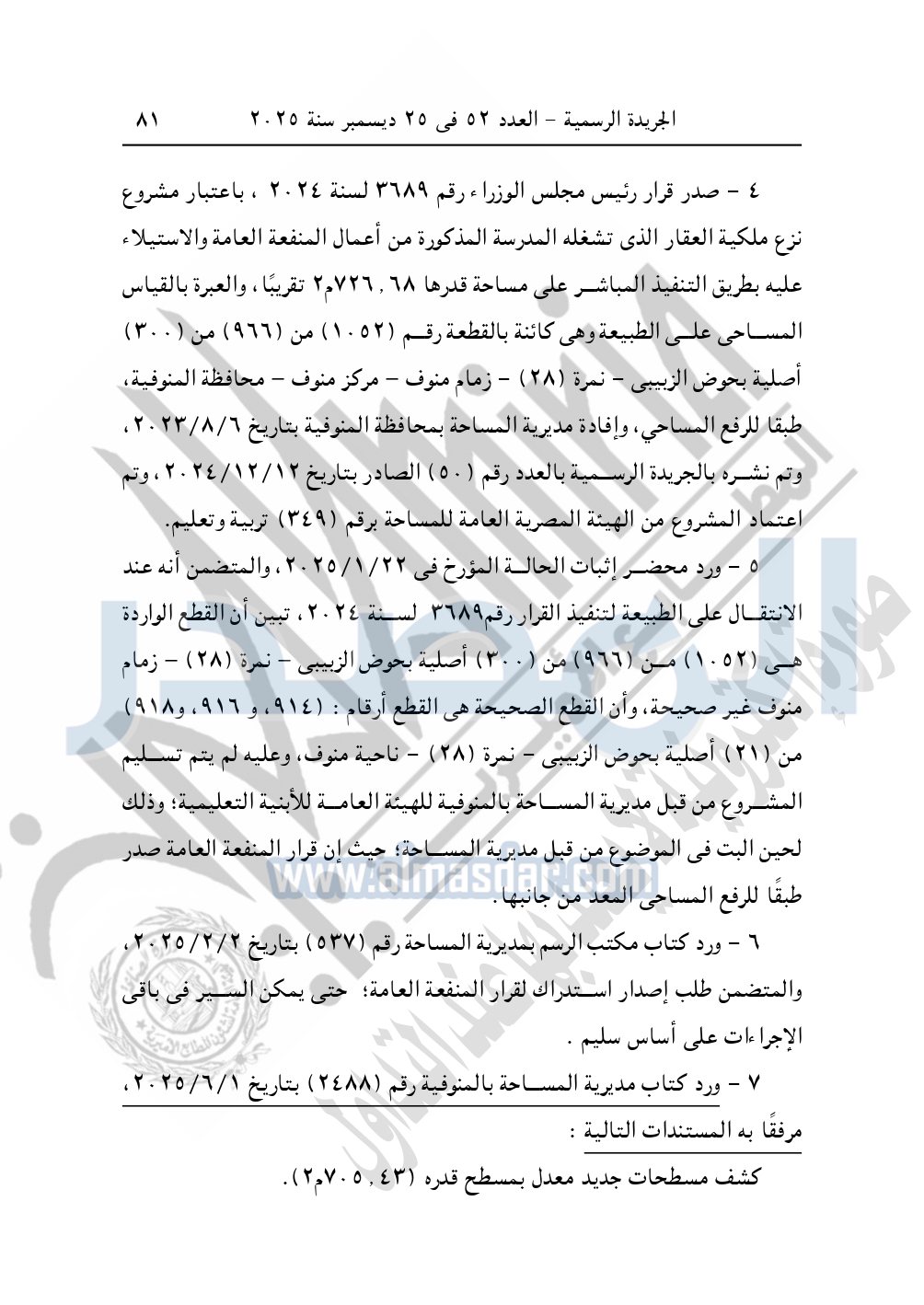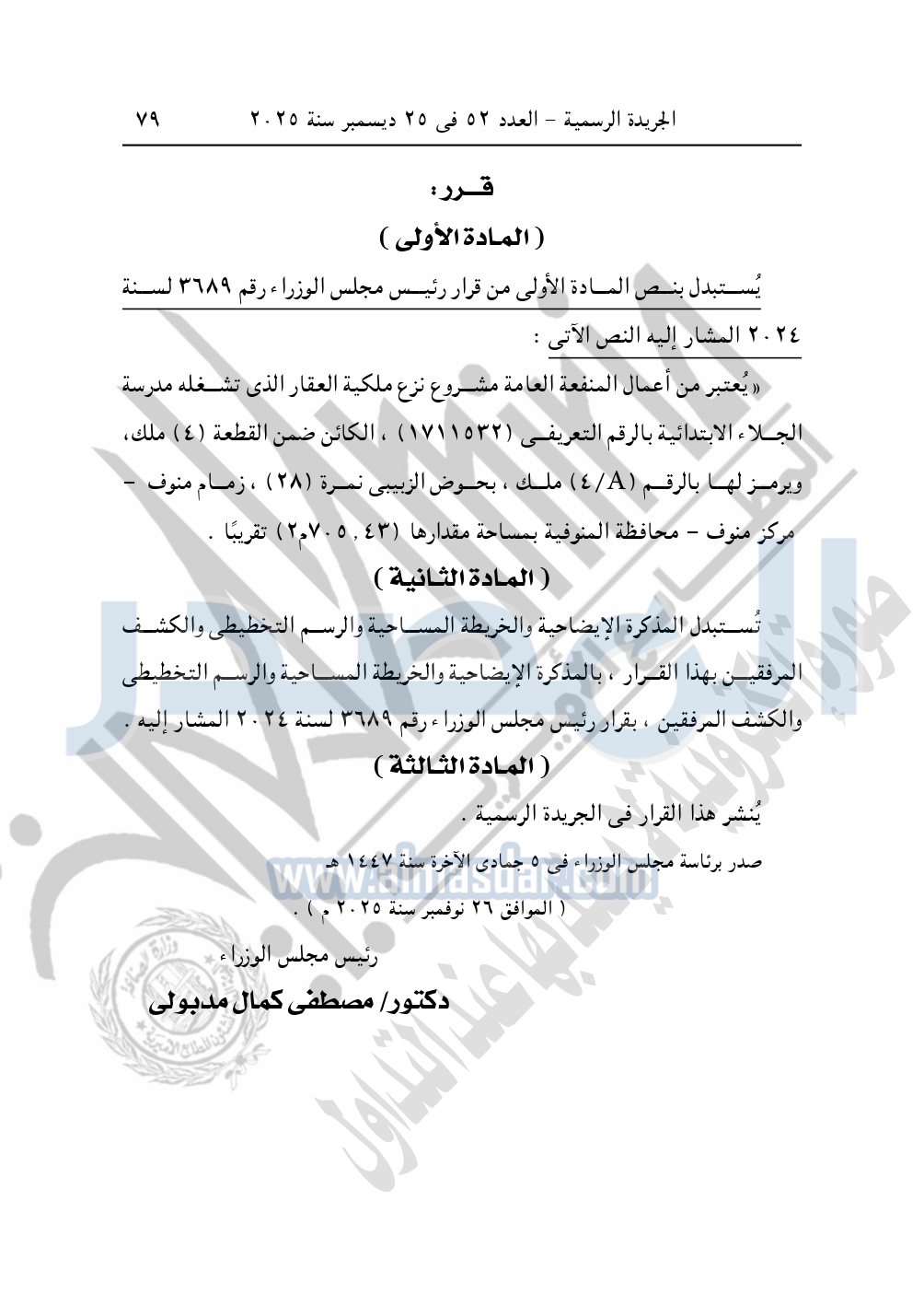 «يُعتبر من أعمال المنفعة العامة مشروع نزع ملكية العقار الذي تشغله مدرسة الجلاء الابتدائية بالرقم التعريفي "1711532"، الكائن ضمن القطعة "4" ملك، ويرمز لها بالرقم "A / 4" ملك، بحوض الزبيبى نمرة "28"، زمام منوف مركز منوف - محافظة المنوفية بمساحة مقدارها "705.43" تقريبًا.