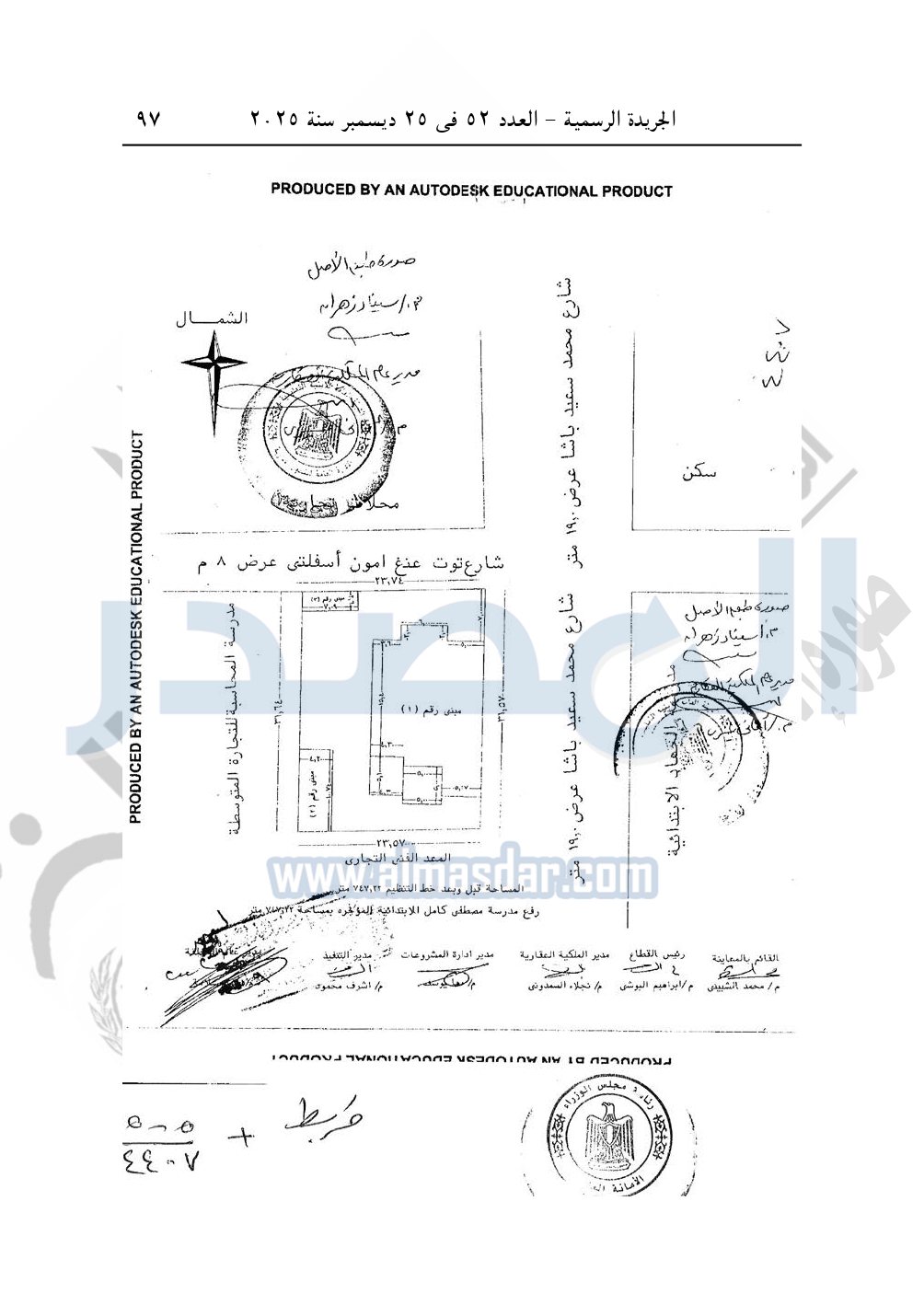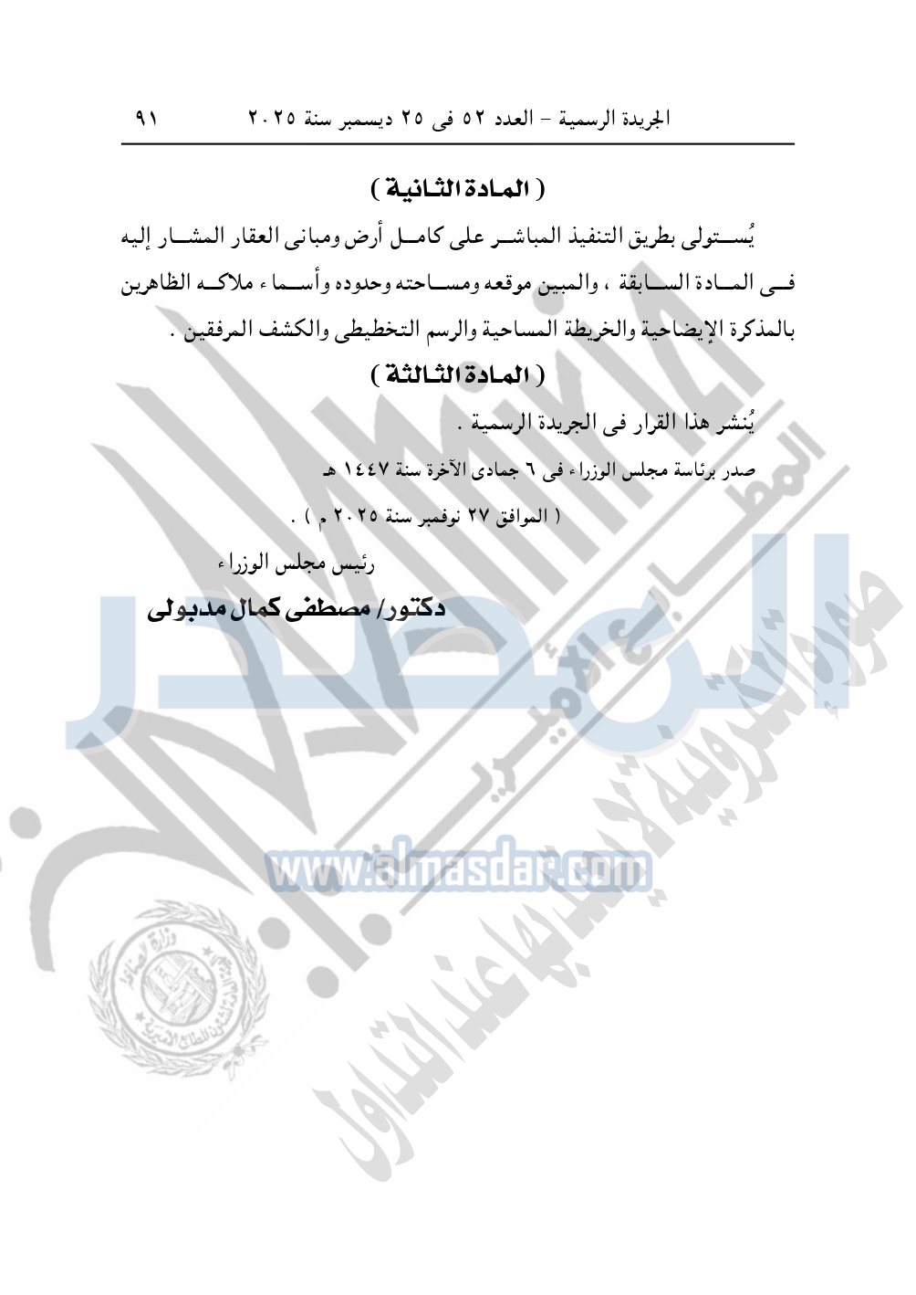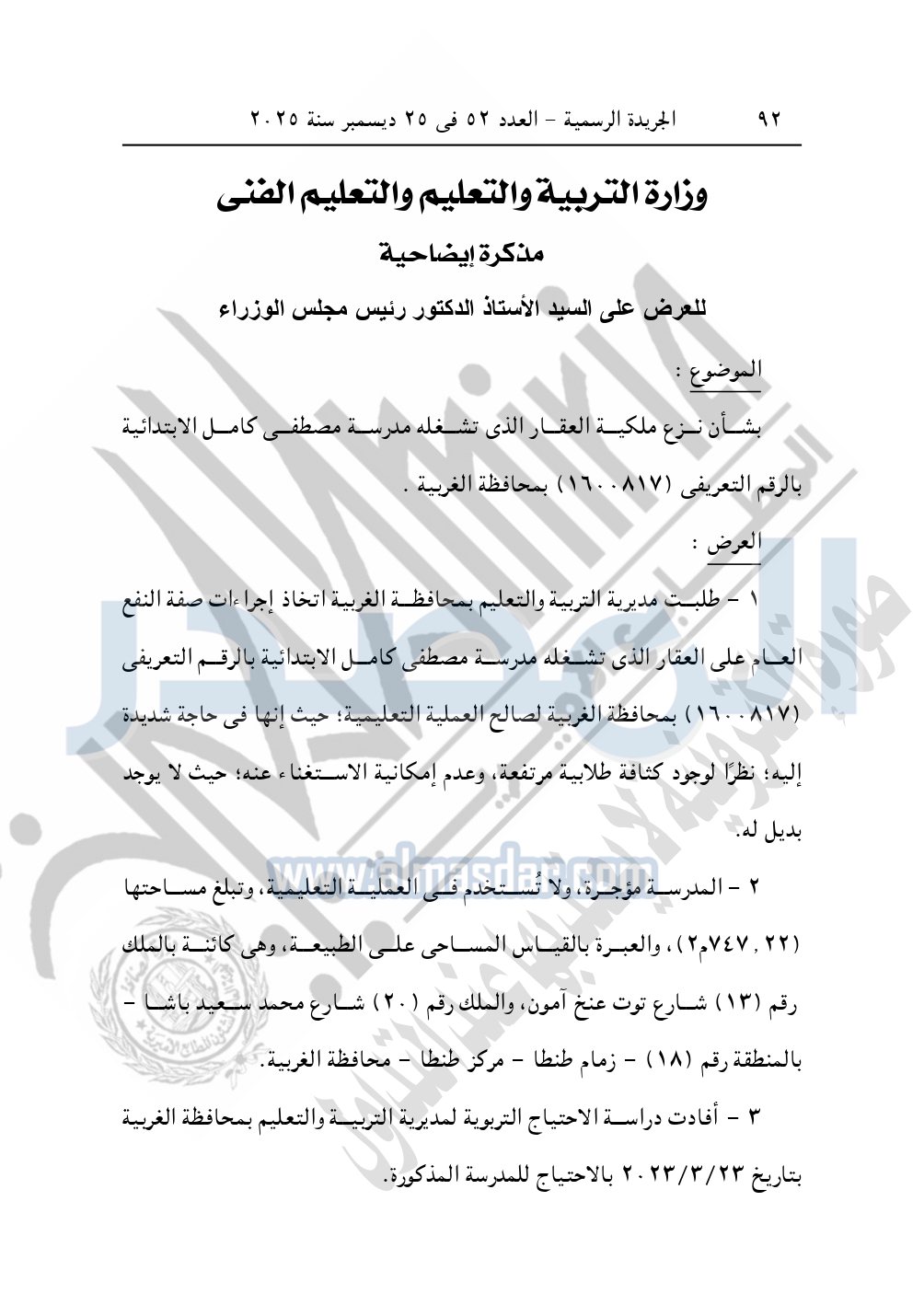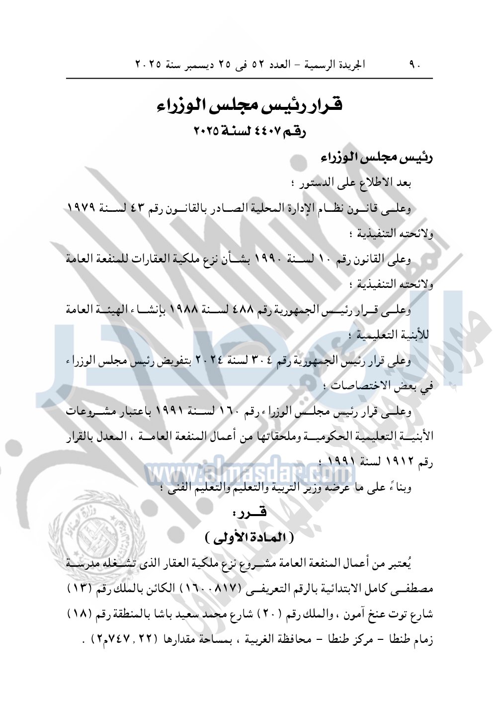 وأيضا نشرت الجريدة الرسمية، في العدد 52 بتاريخ 25 ديسمبر 2025، قرار رئيس مجلس الوزراء، رقم 4404 لسنة 2025، بشأن نزع ملكية العقار الذي تشغله مدرسة مصطفى كامل الابتدائية.