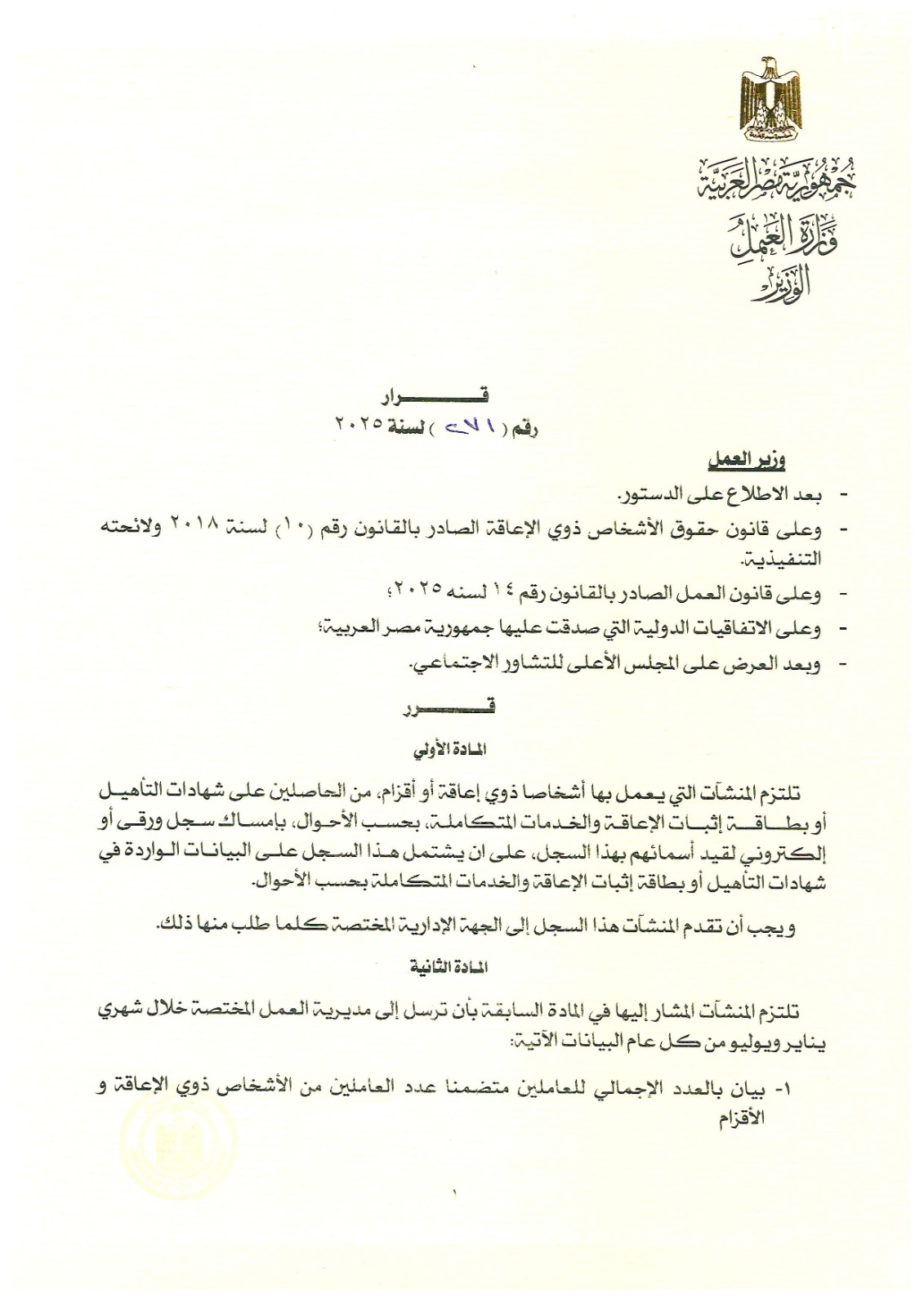 وأكد وزير العمل، في بيان، أن هذا القرار يأتي استنادًا إلى الدستور المصري، وقانون حقوق الأشخاص ذوي الإعاقة رقم "10" لسنة 2018، وقانون العمل الجديد رقم "14" لسنة 2025، وبعد العرض على المجلس الأعلى للتشاور الاجتماعي، في إطار استكمال منظومة القرارات الوزارية التنفيذية الهادفة إلى تحقيق العدالة الاجتماعية، وترسيخ مبادئ العمل اللائق، وتكافؤ الفرص داخل سوق العمل.