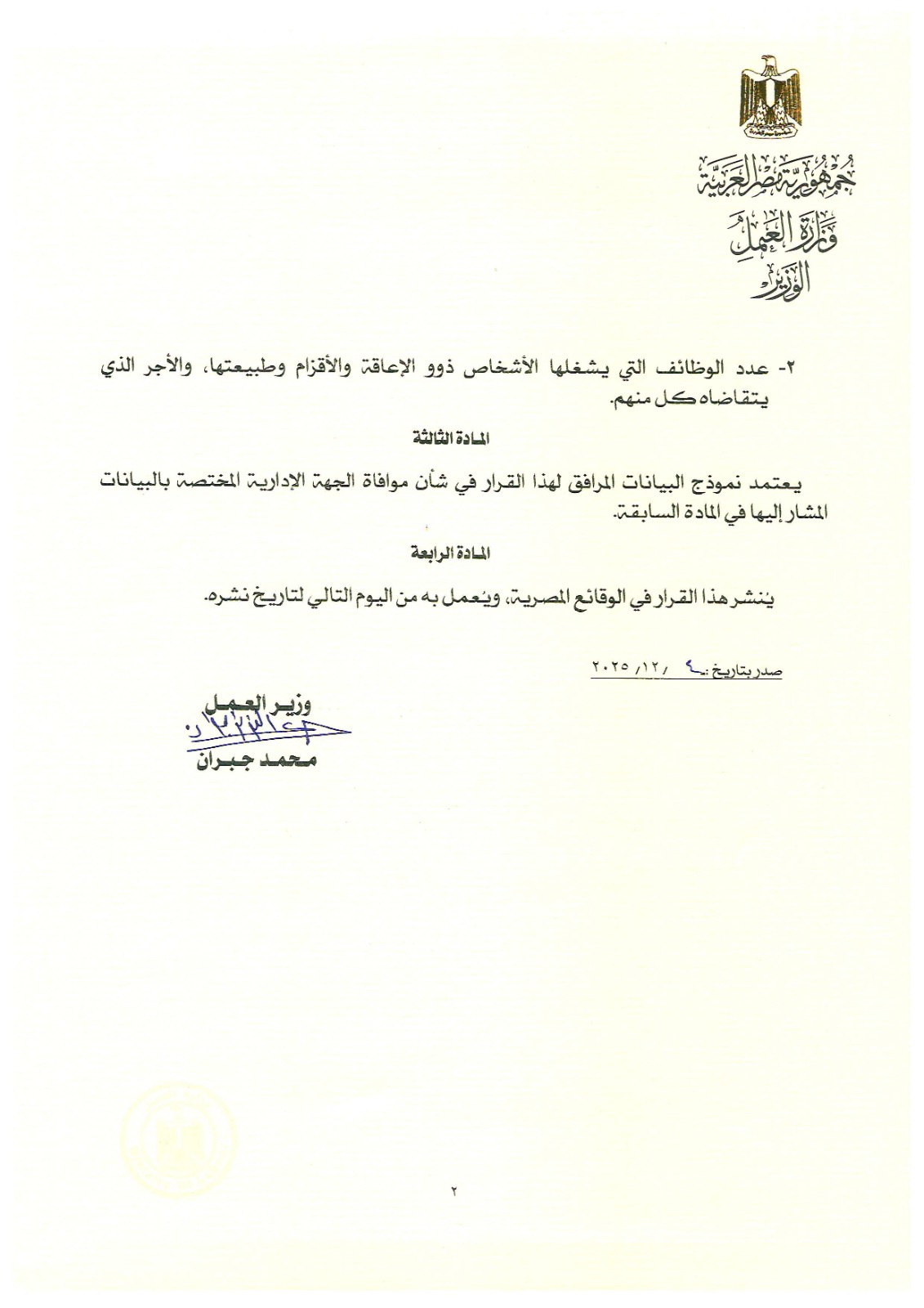 أعلن وزير العمل محمد جبران، عن صدور القرار الوزاري رقم "271" لسنة 2025، بشأن تنظيم الرصد والمتابعة الميدانية لتشغيل الأشخاص ذوي الإعاقة والأقزام في منشآت القطاع الخاص، بما يضمن حقوقهم، ويُعزز دمجهم في سوق العمل، ويُتابع الالتزام بنِسَب التشغيل المقررة قانونًا.، وذلك في إطار الاستمرار في نشر القرارات التنفيذية المكملة لقانون العمل الجديد رقم "14" لسنة 2025.