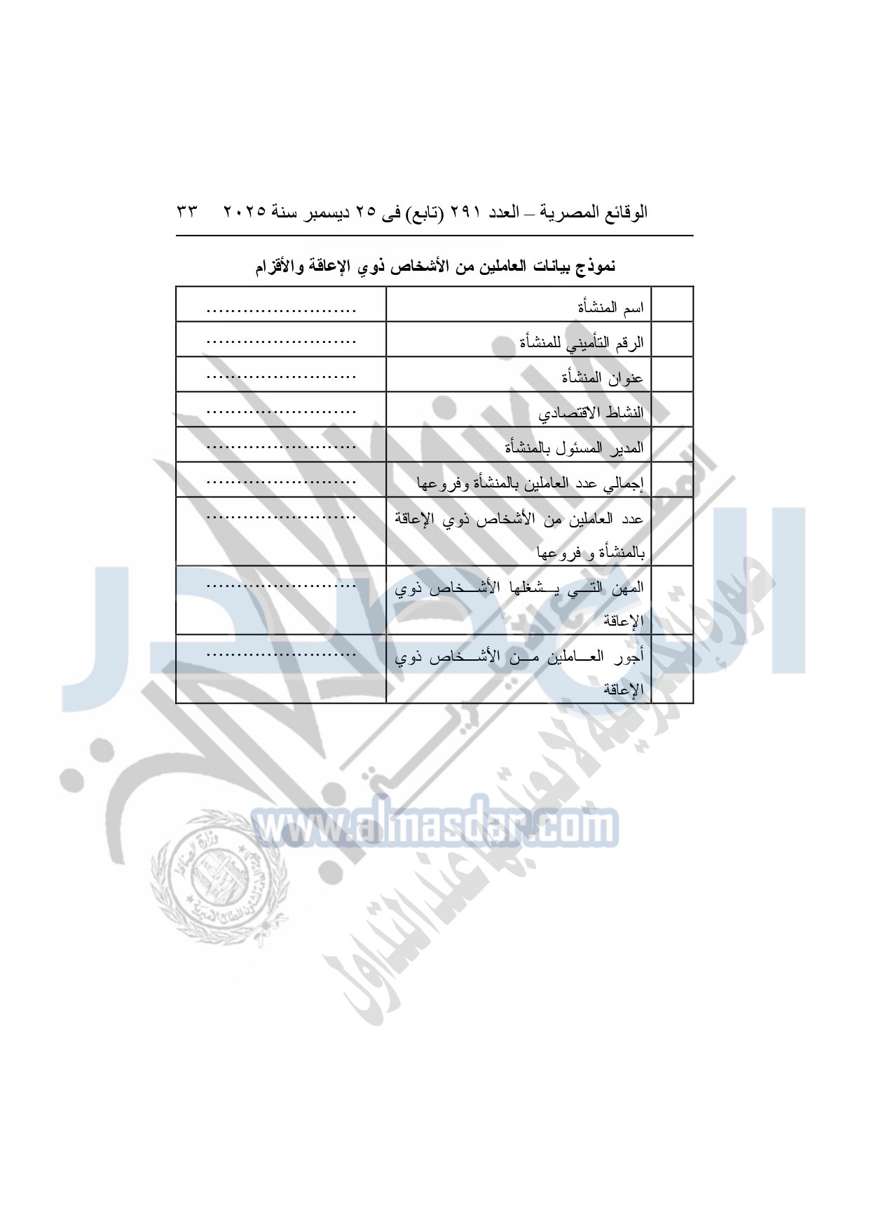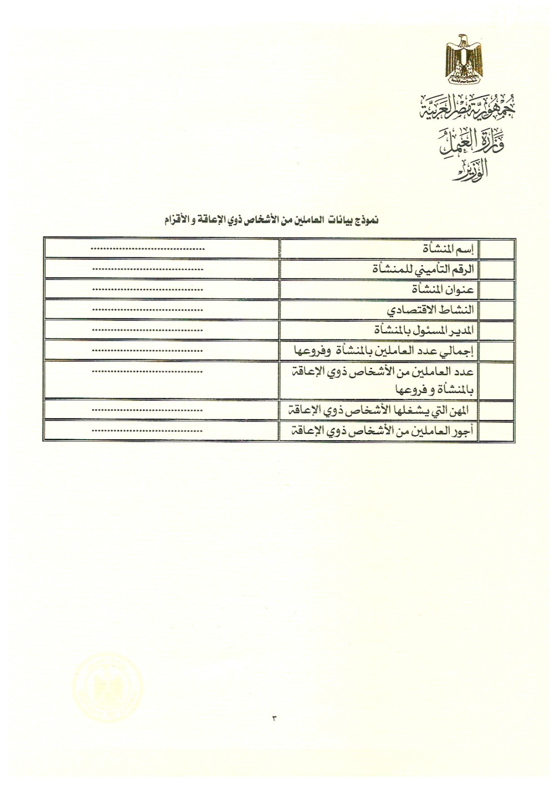 وتضمن القرار الوزاري رقم "271" لسنة 2025 نموذجًا معتمدًا لبيانات العاملين من الأشخاص ذوي الإعاقة والأقزام، تلتزم المنشآت باستيفائه وإرساله إلى مديريات العمل المختصة، ويشمل جدولًا بيانيًا موحدًا يتضمن البيانات التالية: