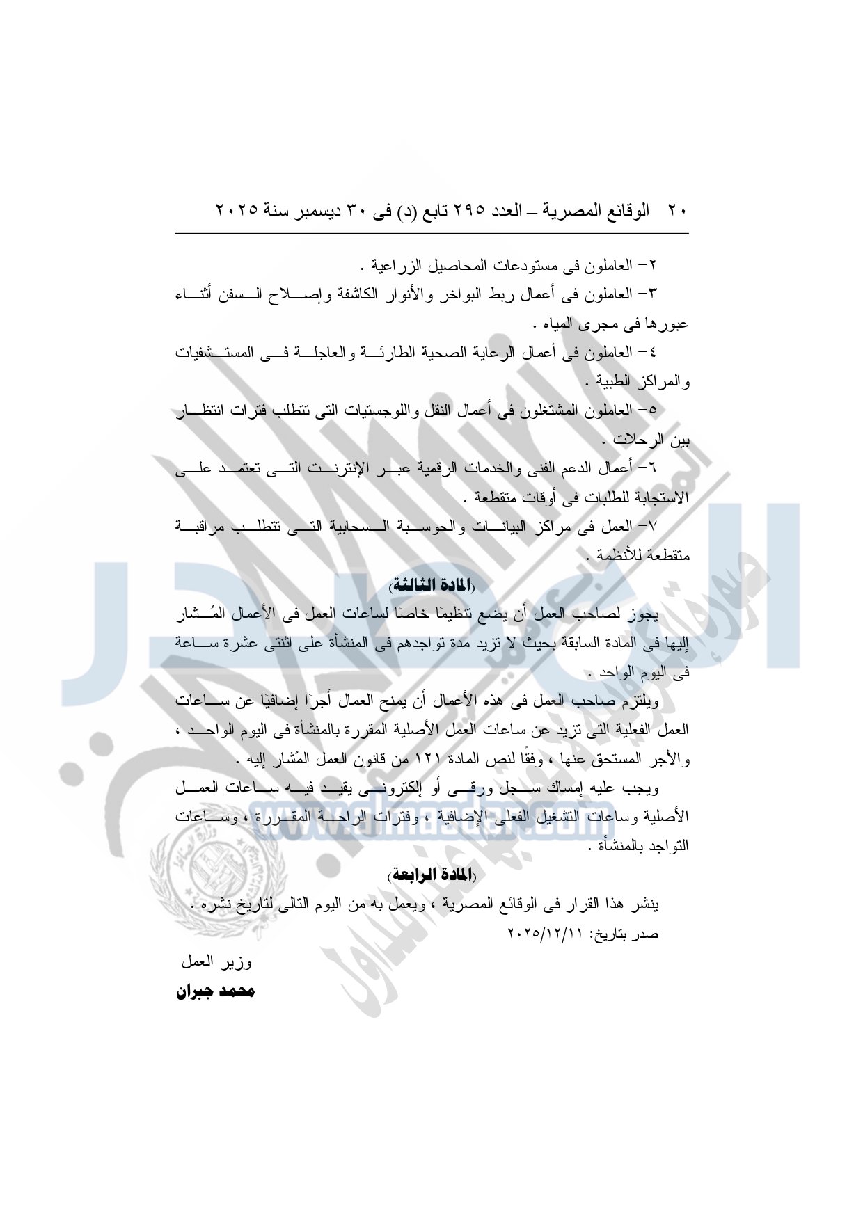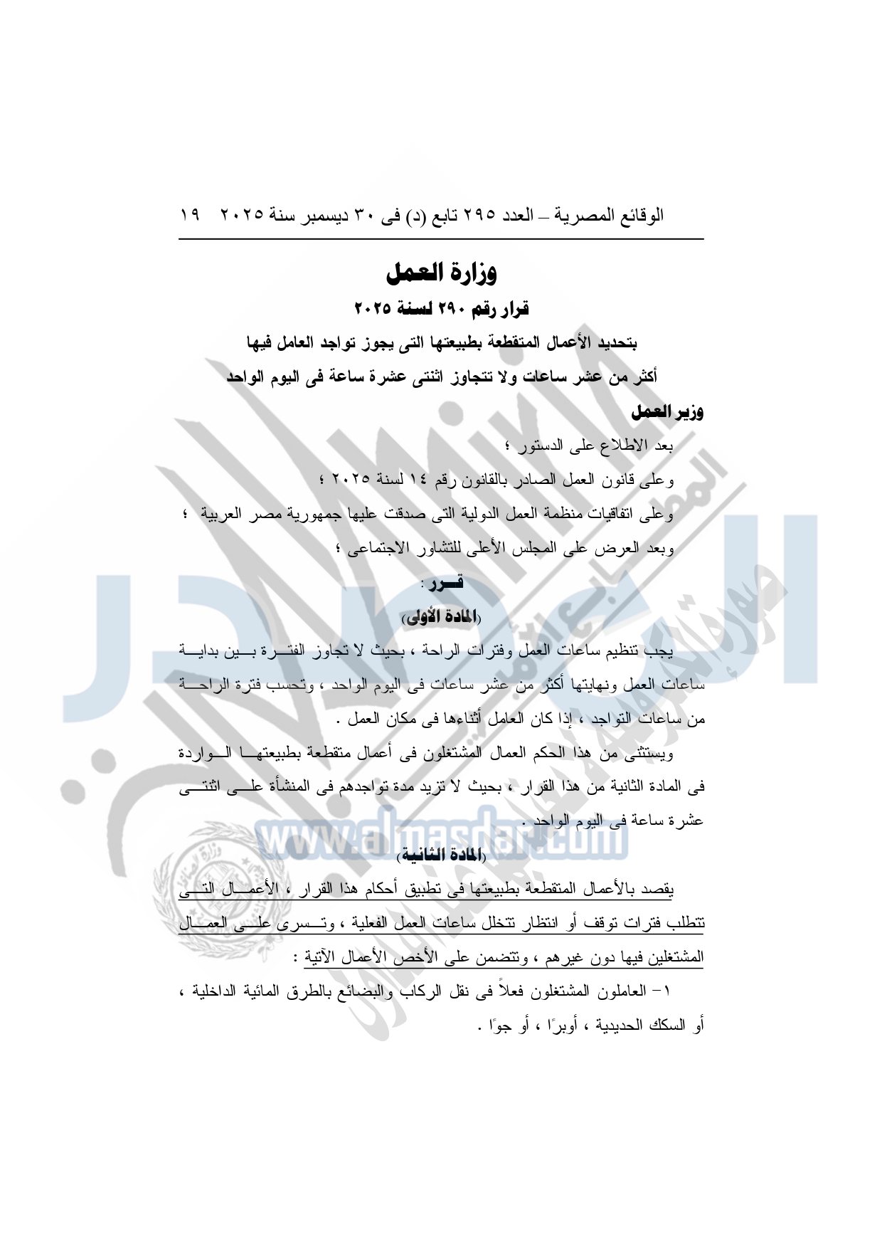 أصدر وزير العمل محمد جبران القرار الوزاري رقم "290" لسنة 2025، بشأن تحديد الأعمال المتقطعة بطبيعتها التي يجوز فيها تواجد العامل أكثر من عشر ساعات ولا تتجاوز اثنتي عشرة ساعة يوميًا، بعد الاطلاع على الدستور، وقانون العمل رقم "14" لسنة 2025، واتفاقيات منظمة العمل الدولية، وبعد العرض على المجلس الأعلى للتشاور الاجتماعي.