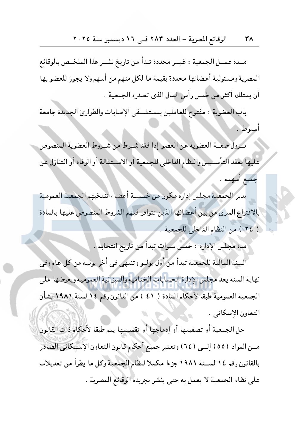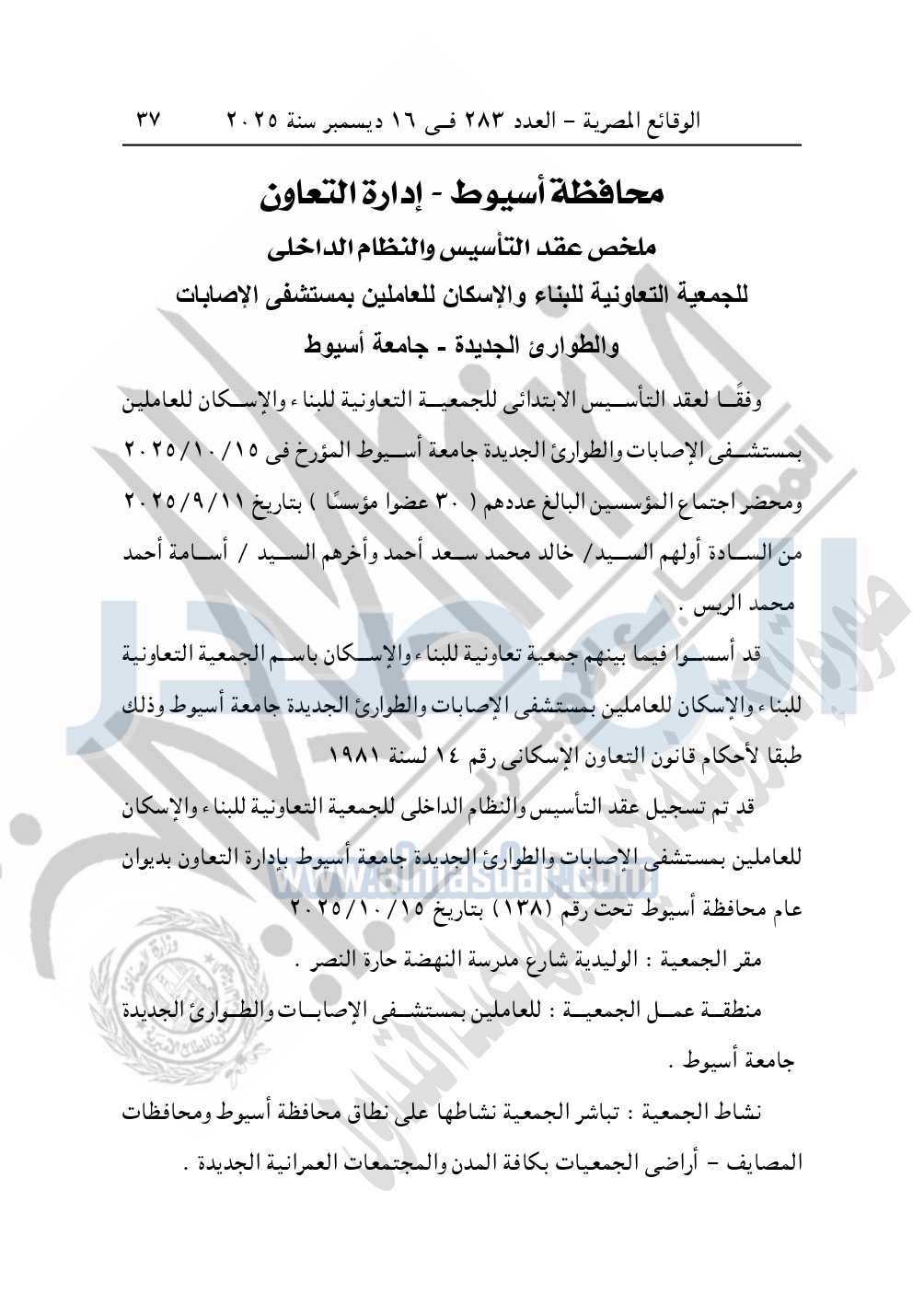نشرت الوقائع المصرية في العدد 283، بتاريخ 16 ديسمبر 2025، قرار محافظة أسيوط - إدارة التعاون، بشأن ملخص عقد التأسيس والنظام الداخلى للجمعية التعاونية للبناء والإسكان للعاملين بمستشفى الإصابات والطوارئ الجديدة - جامعة أسيوط.