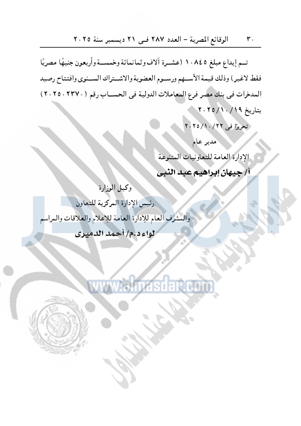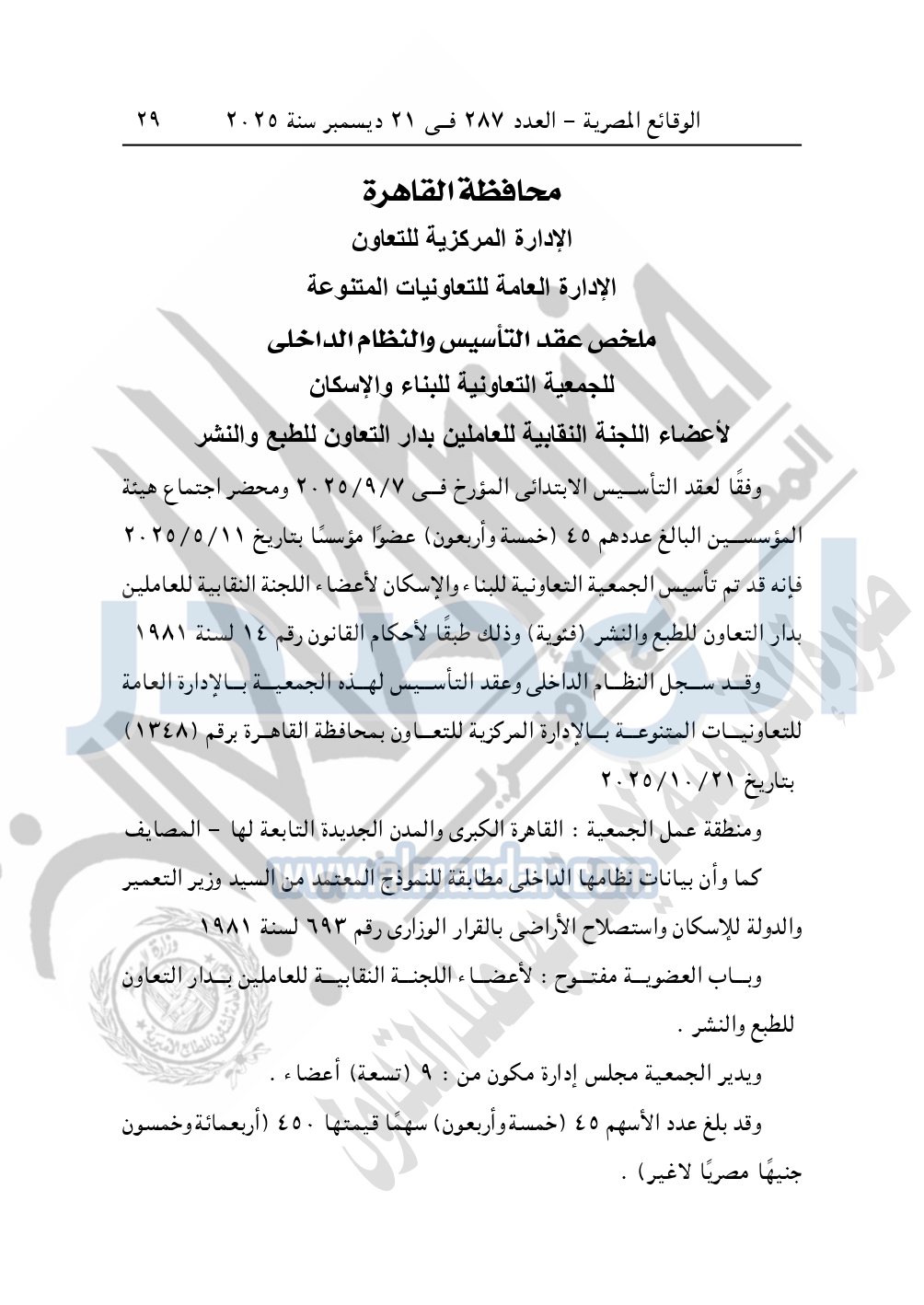 كما نشرت الوقائع المصرية في العدد 287، بتاريخ 21 ديسمبر 2025، قرار محافظة القاهرة - الإدارة العامة للتعاونيات المتنوعة، بشأن ملخص عقد التأسيس والنظام الداخلى للجمعية التعاونية للبناء والإسكان لأعضاء اللجنة النقابية للعاملين بدار التعاون للطبع والنشر.