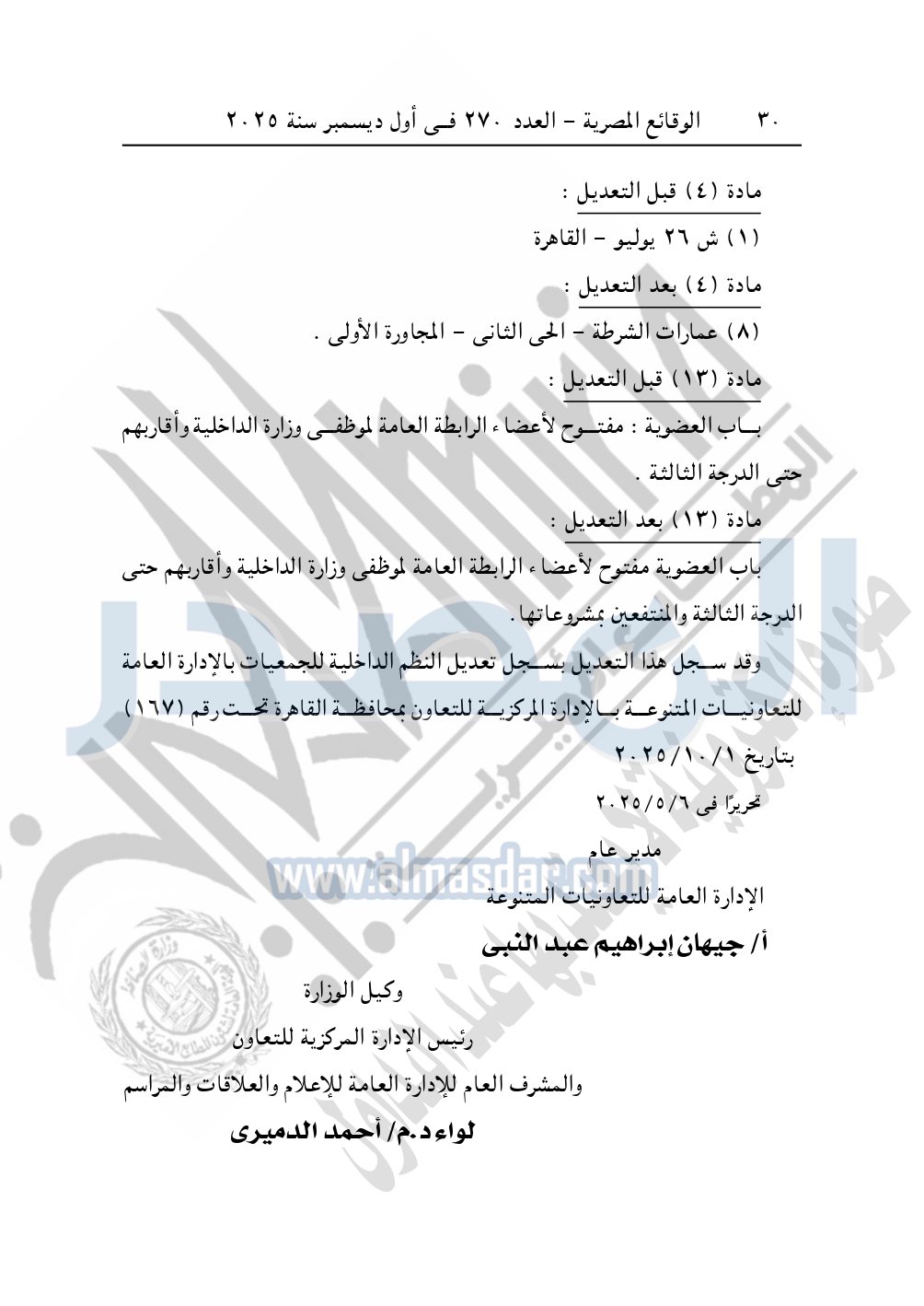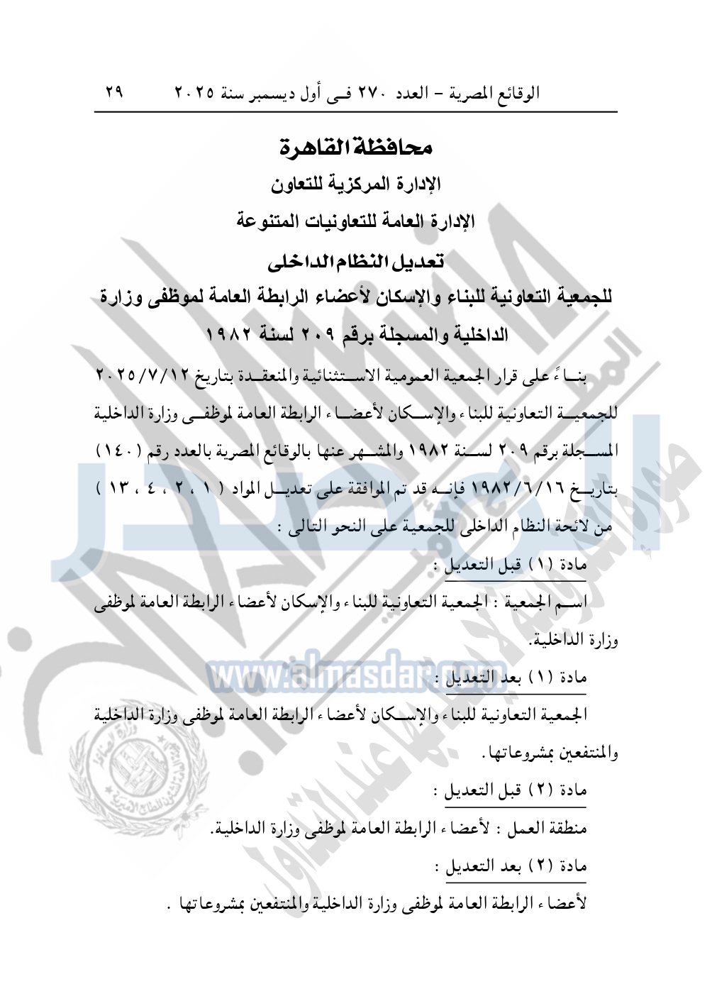 نشرت الوقائع المصرية في العدد 270، في أول ديسمبر 2025، قرار محافظة القاهرة - الإدارة المركزية للتعاون، الإدارة العامة للتعاونيات المتنوعة، بشأن تعديل النظام الداخلى للجمعية التعاونية للبناء والإسكان لأعضاء الرابطة العامة لموظفي وزارة الداخلية والمسجلة برقم 209 لسنة 1982.