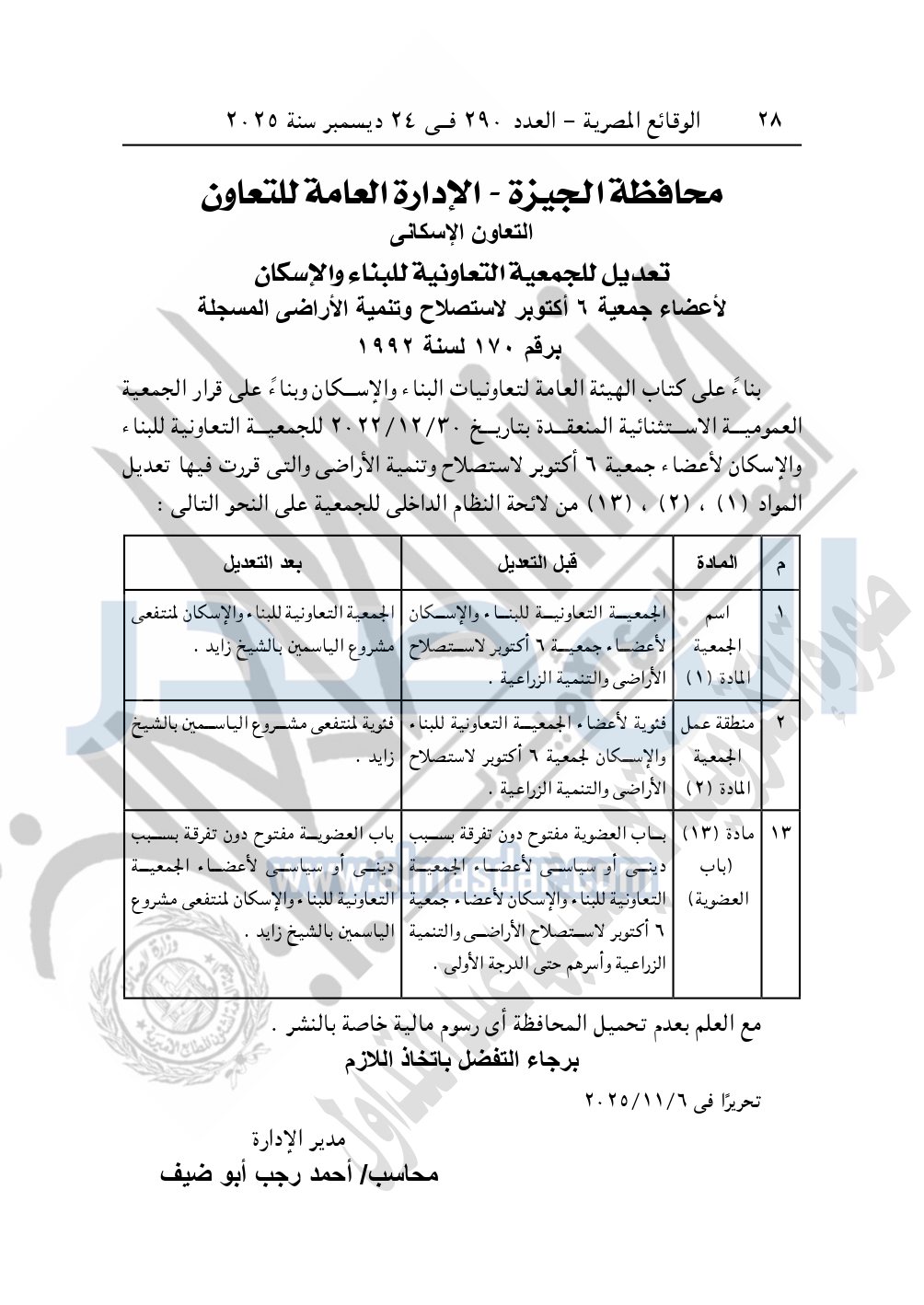 كما نشرت الوقائع المصرية في العدد 290، الصادر في 24 ديسمبر 2025، قرار محافظة الجيزة - الإدارة العامة للتعاون، التعاون الإسكاني، بشأن تعديل للجمعية التعاونية للبناء والإسكان لأعضاء جمعية 6 أكتوبر لاستصلاح وتنمية الأراضي المسجلة برقم 170 لسنة 1992.