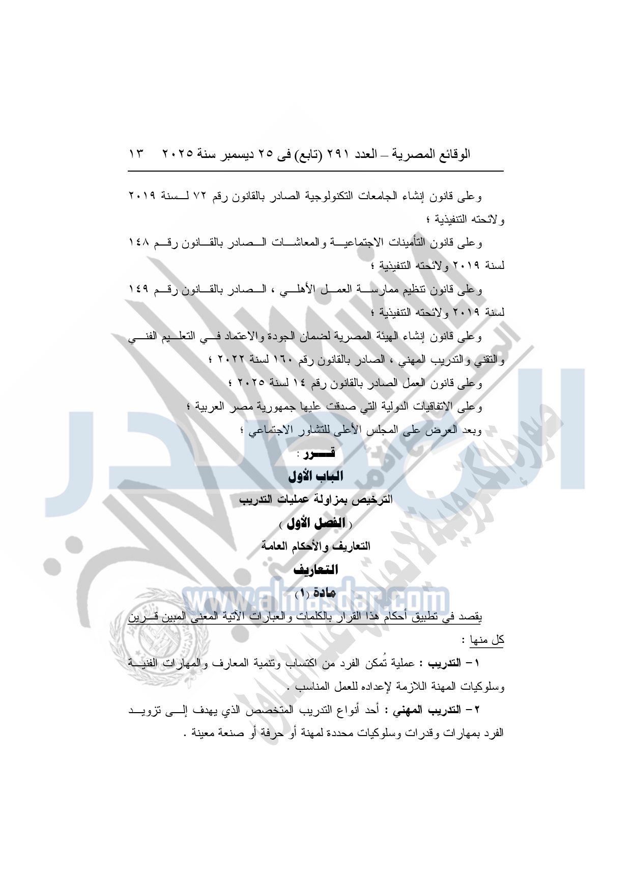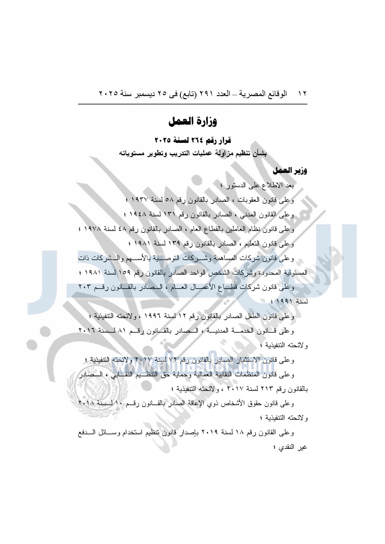 وأكد وزير العمل، في بيان، أن القرار يأتي استنادًا إلى أحكام الدستور، وقانون العمل الجديد، وعدد من القوانين المنظمة لشؤون التعليم الفني والتدريب المهني، والاستثمار، والعمل الأهلي، والتأمينات الاجتماعية، وحقوق الأشخاص ذوي الإعاقة، إلى جانب الاتفاقيات الدولية التي صدقت عليها جمهورية مصر العربية، وبعد العرض على المجلس الأعلى للتشاور الاجتماعي، في إطار تحديث البنية التشريعية الحاكمة لمنظومة التدريب في مصر.