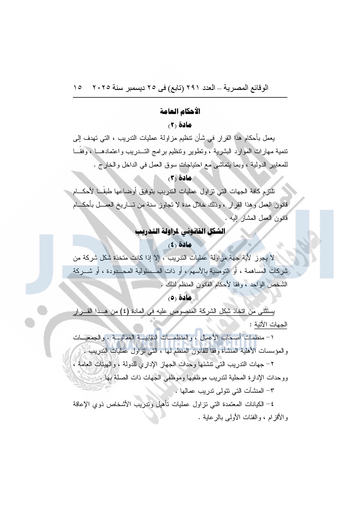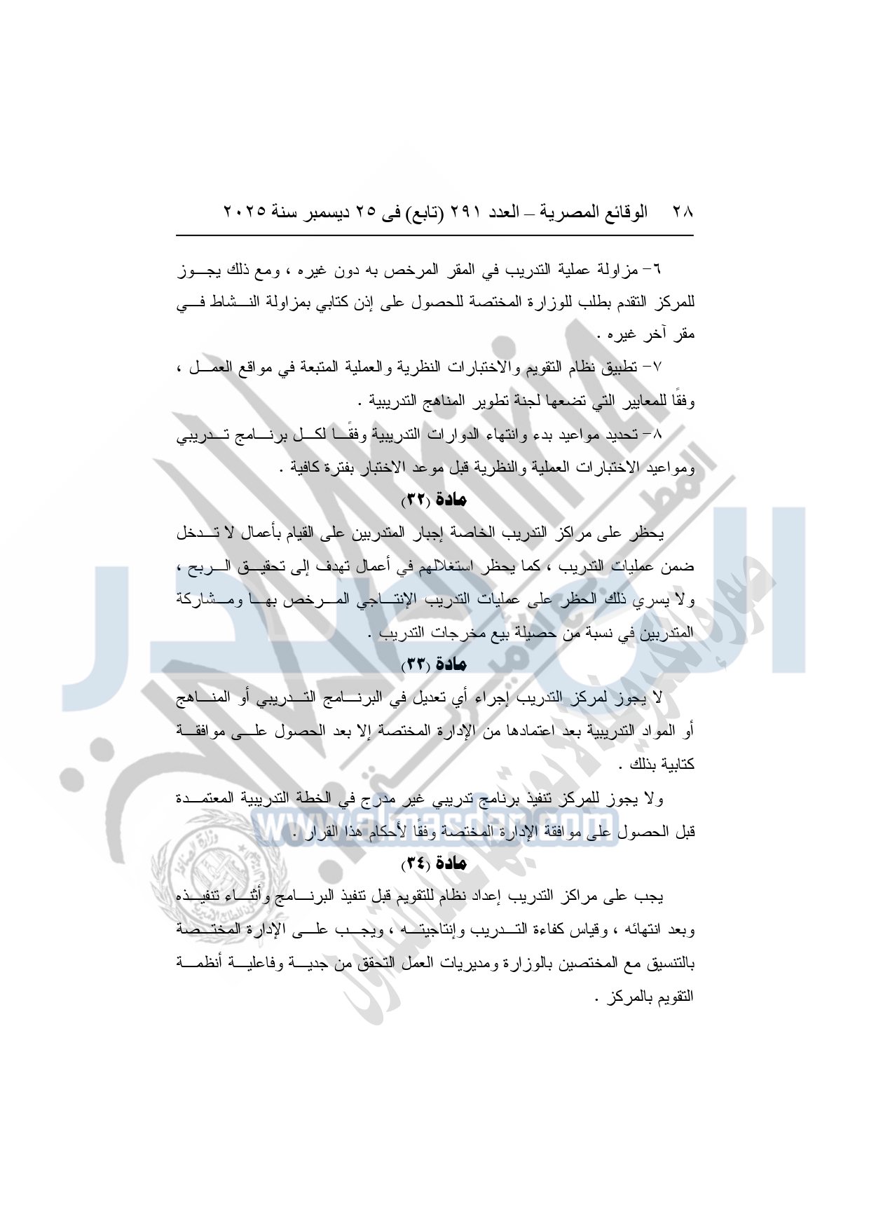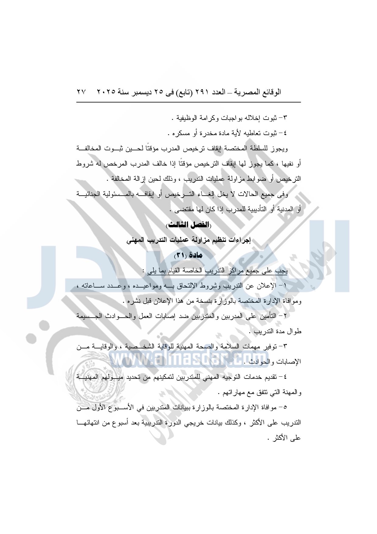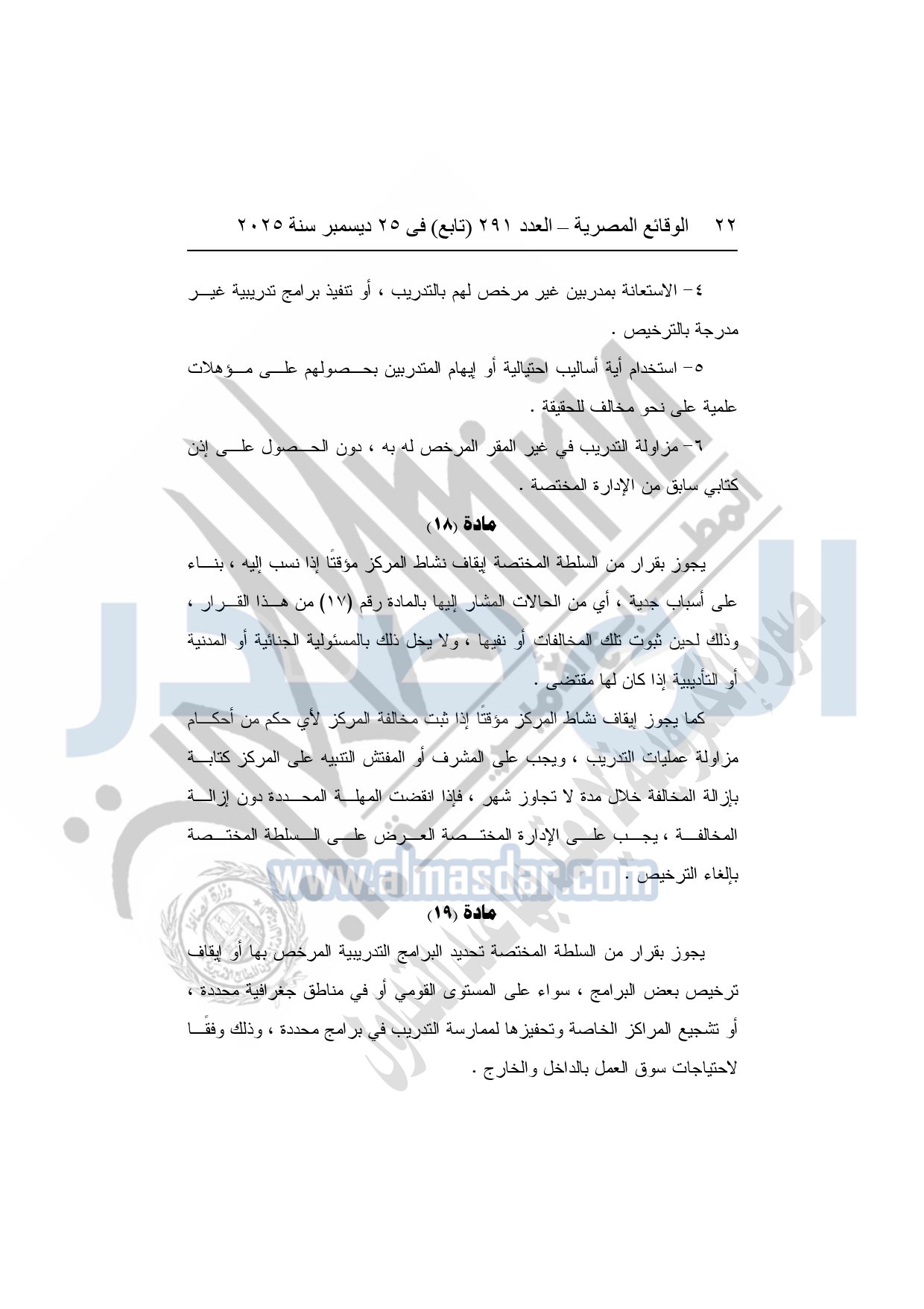 وأشار وزير العمل، إلى أن القرار يُلزم الجهات التي تزاول عمليات التدريب بالحصول على ترخيص من وزارة العمل، واعتماد البرامج والخطط التدريبية مسبقًا، وإنشاء قواعد بيانات دقيقة للمتدربين والمدربين، مع تشديد الرقابة والتفتيش الدوري على مراكز التدريب، ومنع أية ممارسات احتيالية أو تضليلية، أو استغلال للمتدربين، أو الخلط بين أنشطة التدريب والتعليم الأكاديمي.