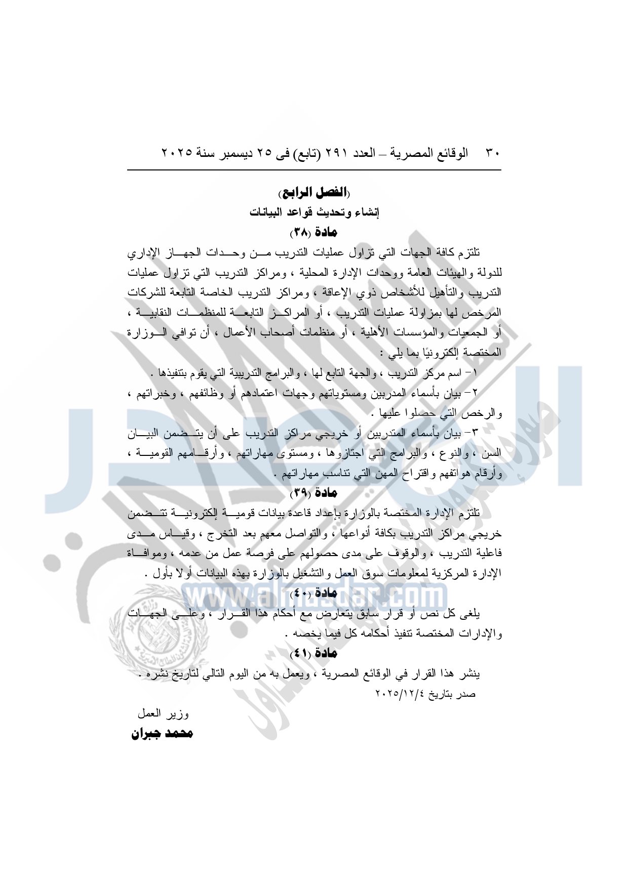 أعلن محمد جبران وزير العمل، عن صدور القرار الوزاري رقم "264" لسنة 2025، بشأن تنظيم مزاولة عمليات التدريب وتطوير مستوياته، بهدف رفع كفاءة وتنمية مهارات الموارد البشرية، وربط منظومة التدريب باحتياجات سوق العمل في الداخل والخارج، وفقًا للمعايير الدولية المعتمدة، وذلك في إطار استكمال منظومة القرارات التنفيذية لقانون العمل الجديد رقم "14" لسنة 2025.