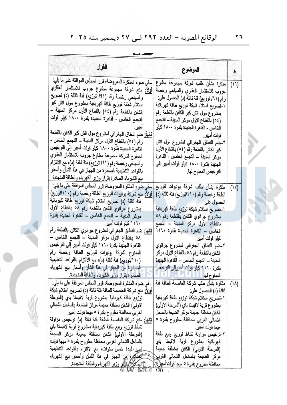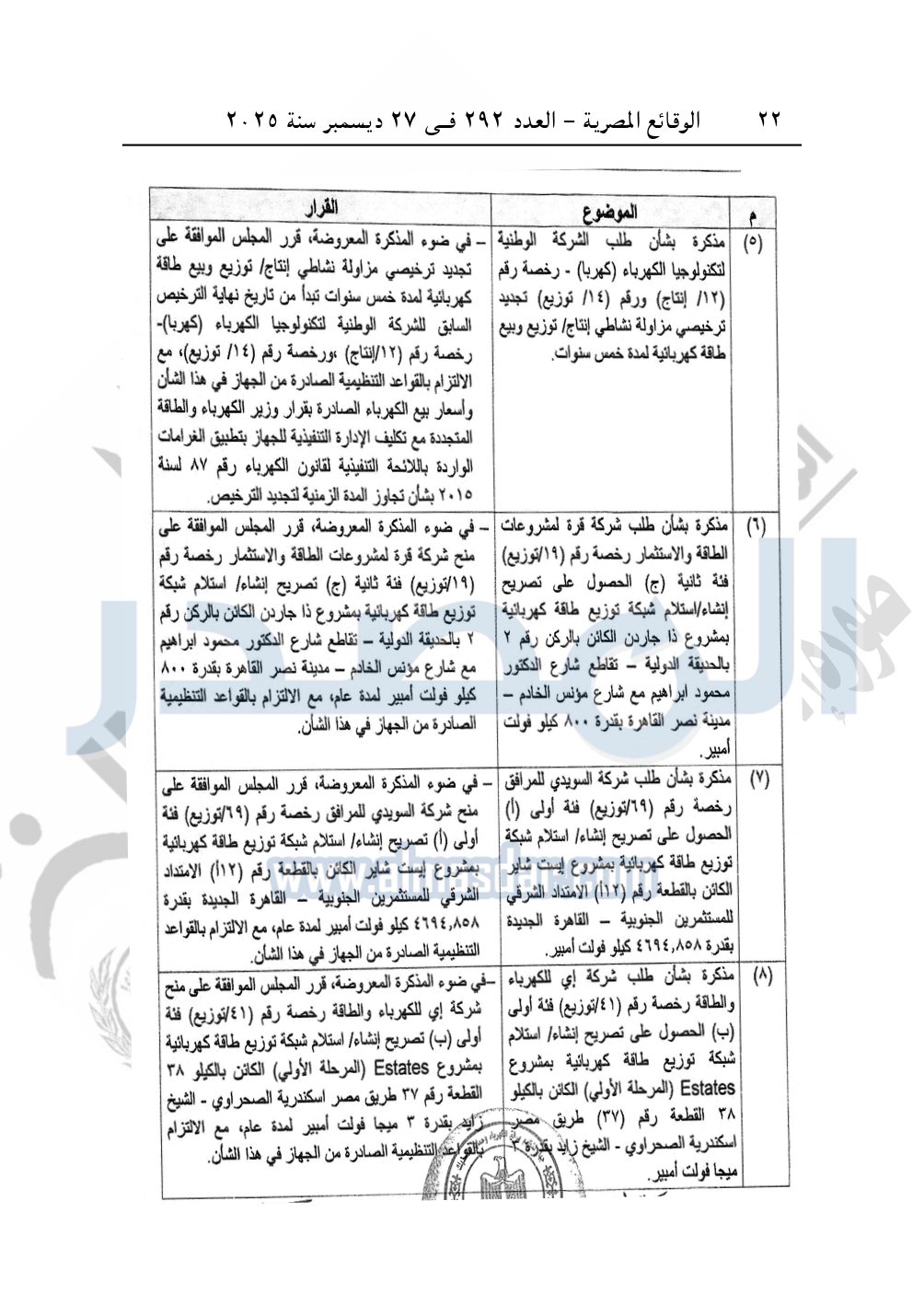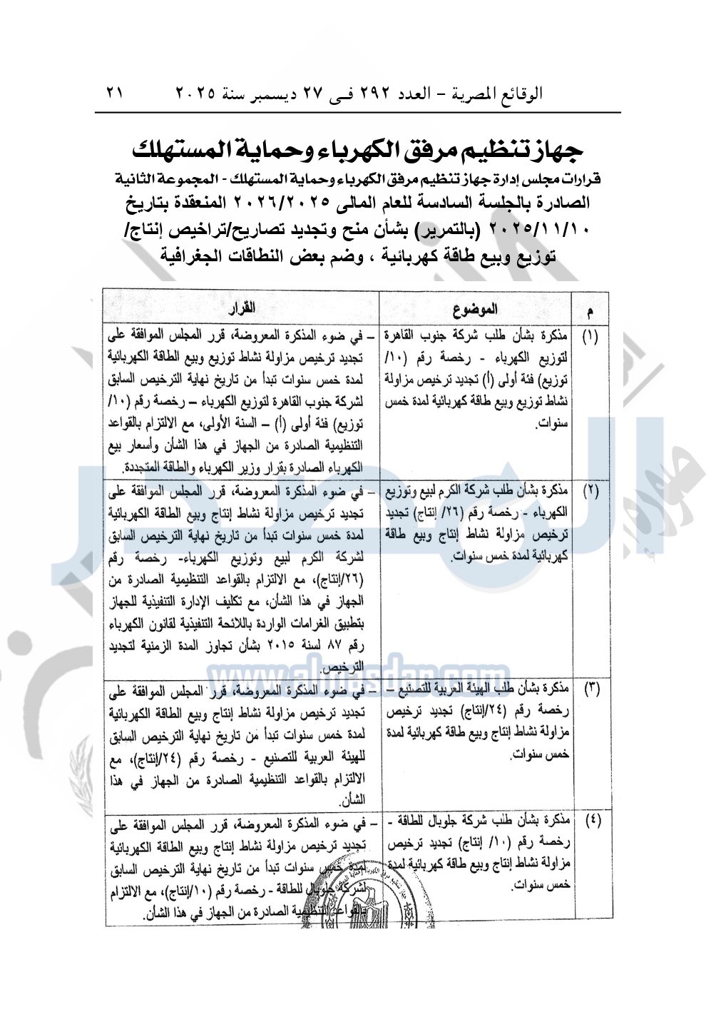 نشرت الوقائع المصرية في العدد 292، بتاريخ 27 ديسمبر 2025، قرار جهاز تنظيم مرفق الكهرباء وحماية المستهلك، قرارات مجلس إدارة جهاز تنظيم مرفق الكهرباء وحماية المستهلك - المجموعة الثانية الصادرة بالجلسة السادسة للعام المالى 2025-2026 المنعقدة بتاريخ 10-11-2025 "بالتمرير" بشأن منح وتجديد تصاريح - تراخيص إنتاج - طاقة توزيع وبيع كهربائية، وضم بعض النطاقات الجغرافية.