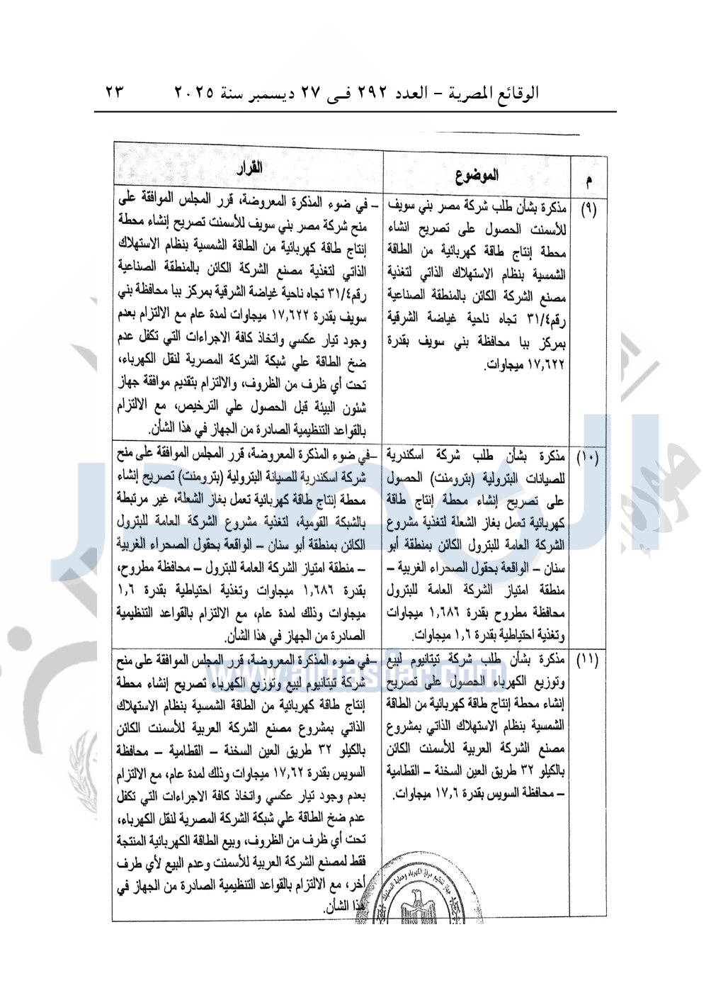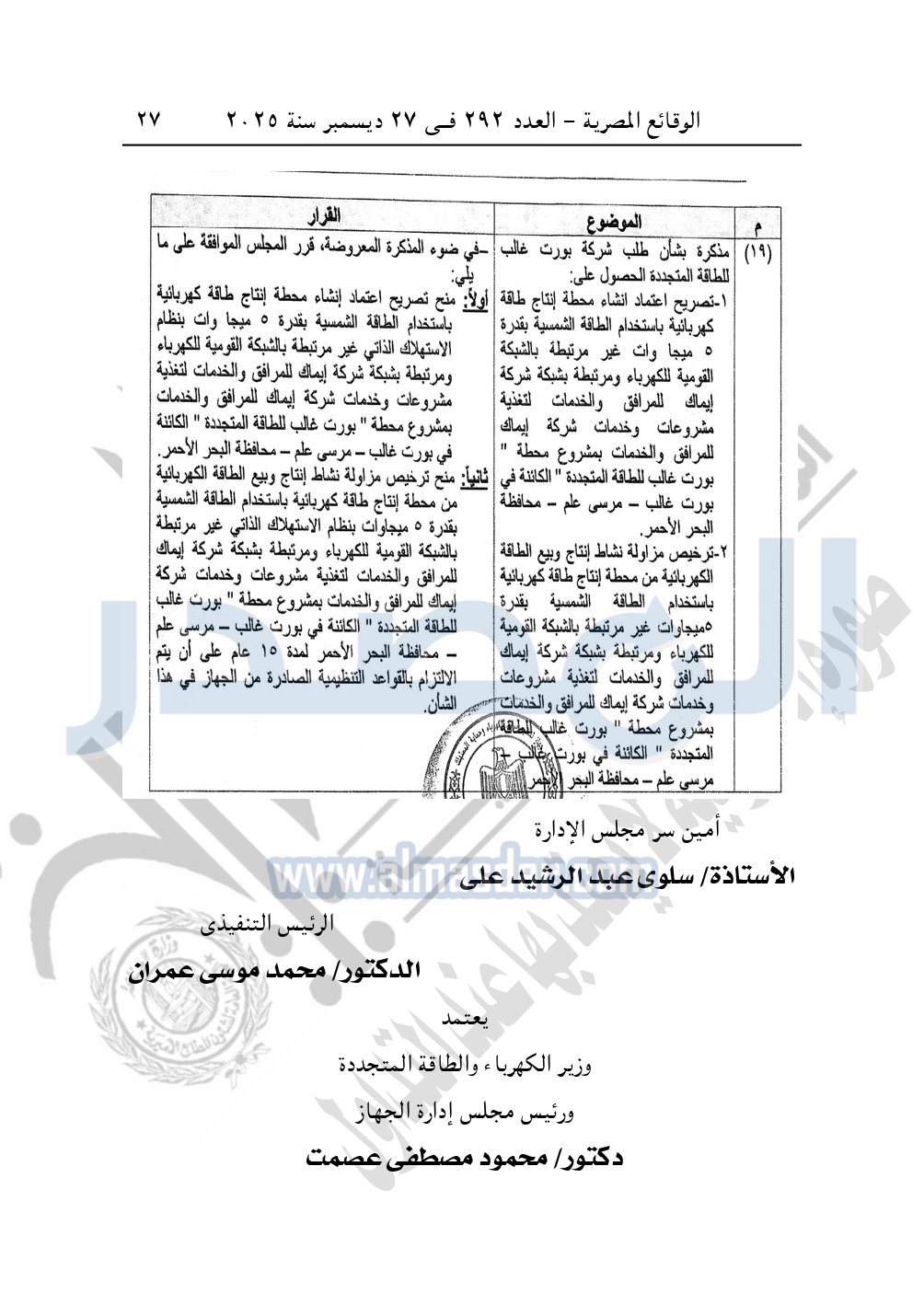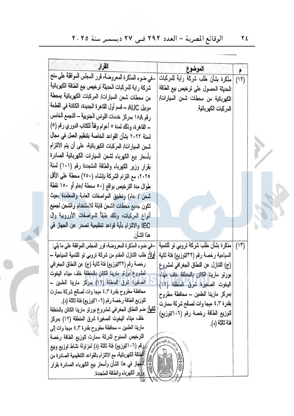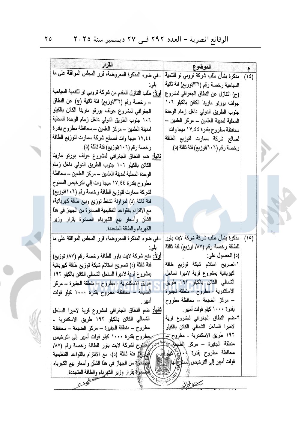 نشرت الوقائع المصرية في العدد 292، بتاريخ 27 ديسمبر 2025، قرار جهاز تنظيم مرفق الكهرباء وحماية المستهلك، قرارات مجلس إدارة جهاز تنظيم مرفق الكهرباء وحماية المستهلك - المجموعة الثانية الصادرة بالجلسة السادسة للعام المالى 2025-2026 المنعقدة بتاريخ 10-11-2025 "بالتمرير" بشأن منح وتجديد تصاريح - تراخيص إنتاج - طاقة توزيع وبيع كهربائية، وضم بعض النطاقات الجغرافية.