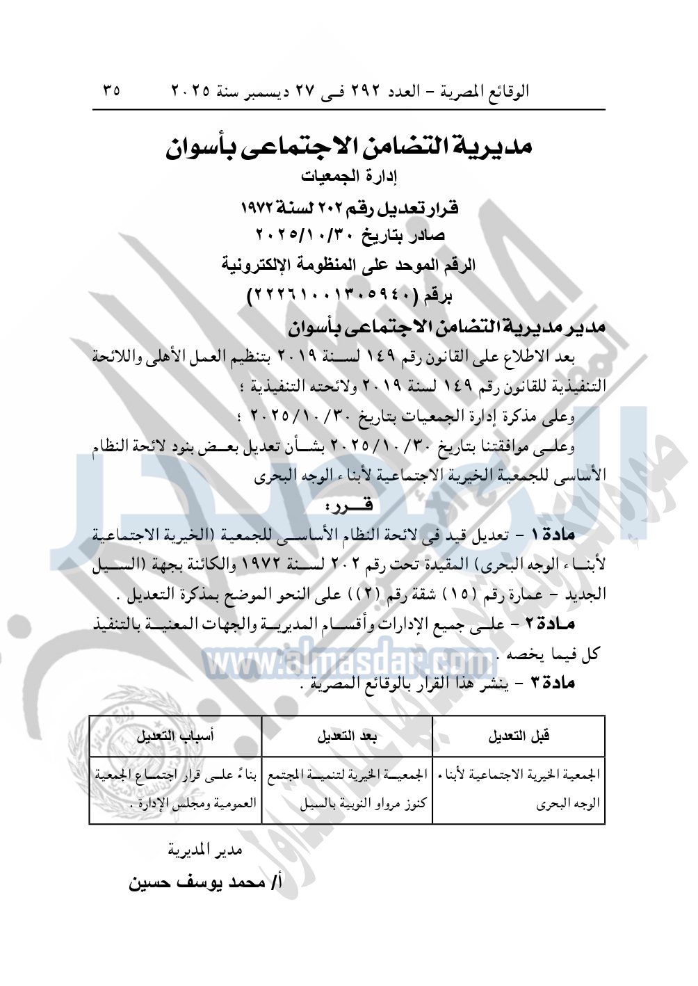 كما نشرت الوقائع المصرية في العدد 292، بتاريخ 27 ديسمبر 2025، قرار مديرية التضامن الاجتماعي بأسوان، قرار تعديل رقم 202 لسنة 1972، صادر بتاريخ 30-10-2025، بشأن تعديل قيد الجمعية الخيرية الاجتماعية لأبناء الوجه البحرى.