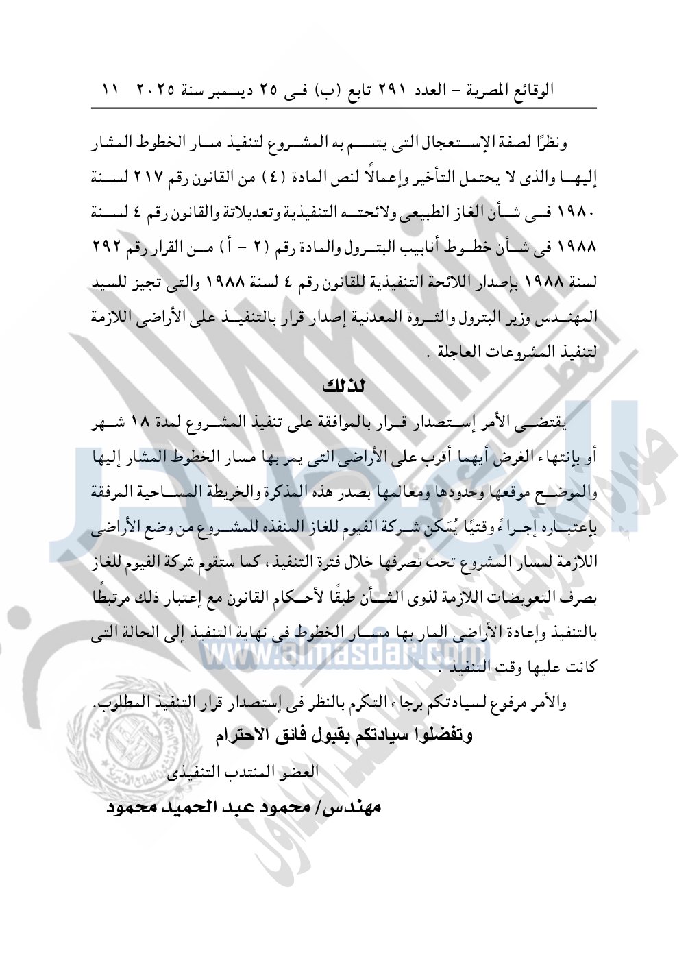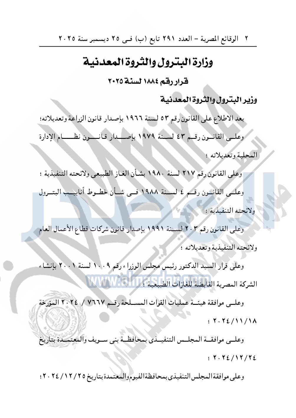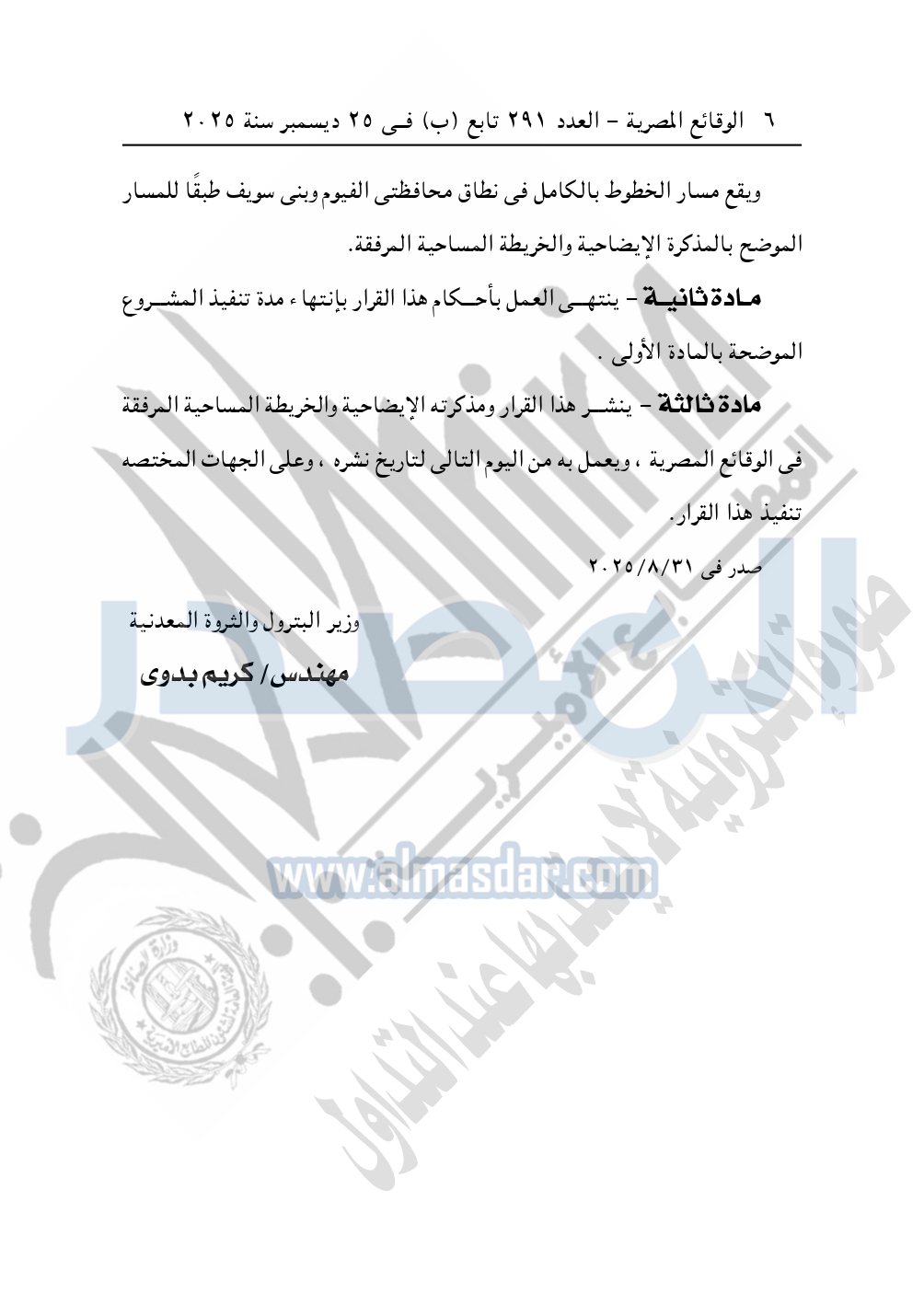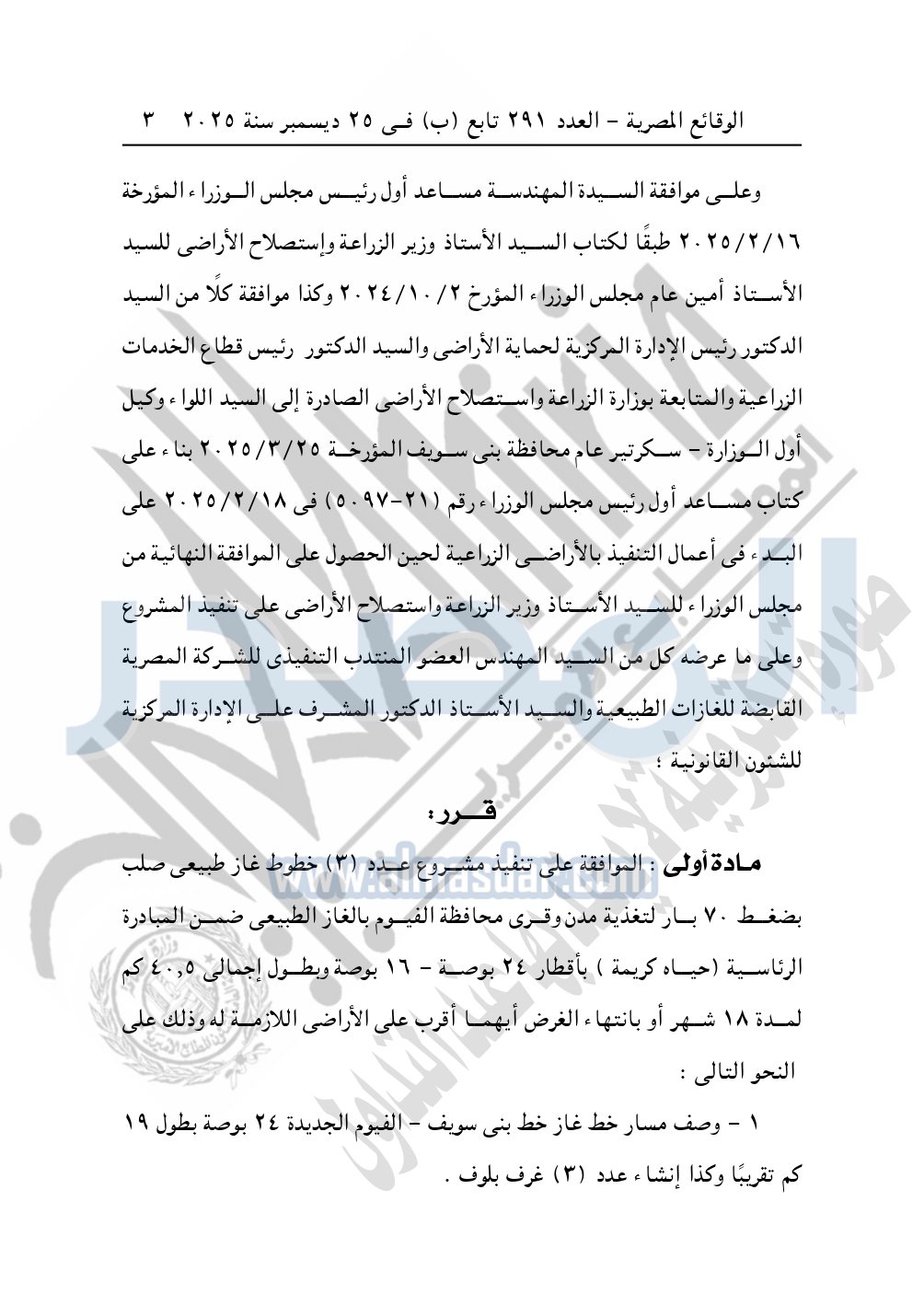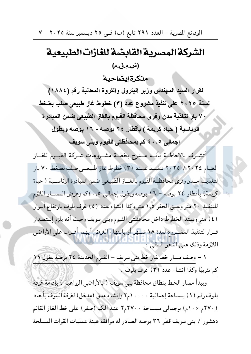 نشرت الوقائع المصرية في العدد 291 تابع "ب"، بتاريخ 25 ديسمبر 2025، قرار وزارة البترول والثروة المعدنية، قرار رقم 1884 لسنة 2025، بشأن الموافقة على تنفيذ مشروع عدد "3" خطوط غاز طبیعی صلب لتغذية مدن وقرى محافظة الفيوم بالغاز الطبيعي.