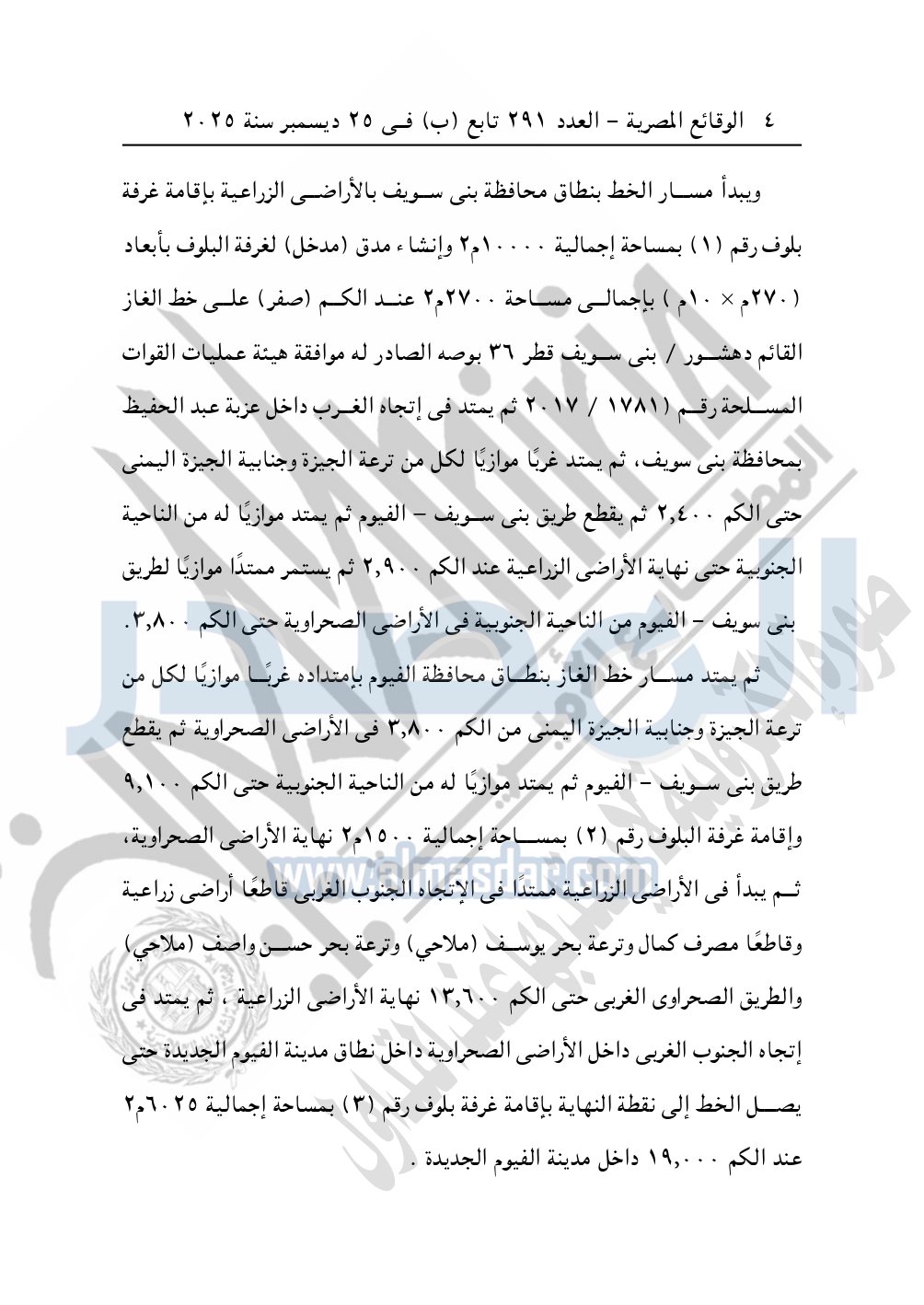 1- وصف مسار خط غاز خط بنى سويف - الفيوم الجديدة 24 بوصة بطول 19 كم تقريبًا وكذا إنشاء عدد "3" غرف بلوف.