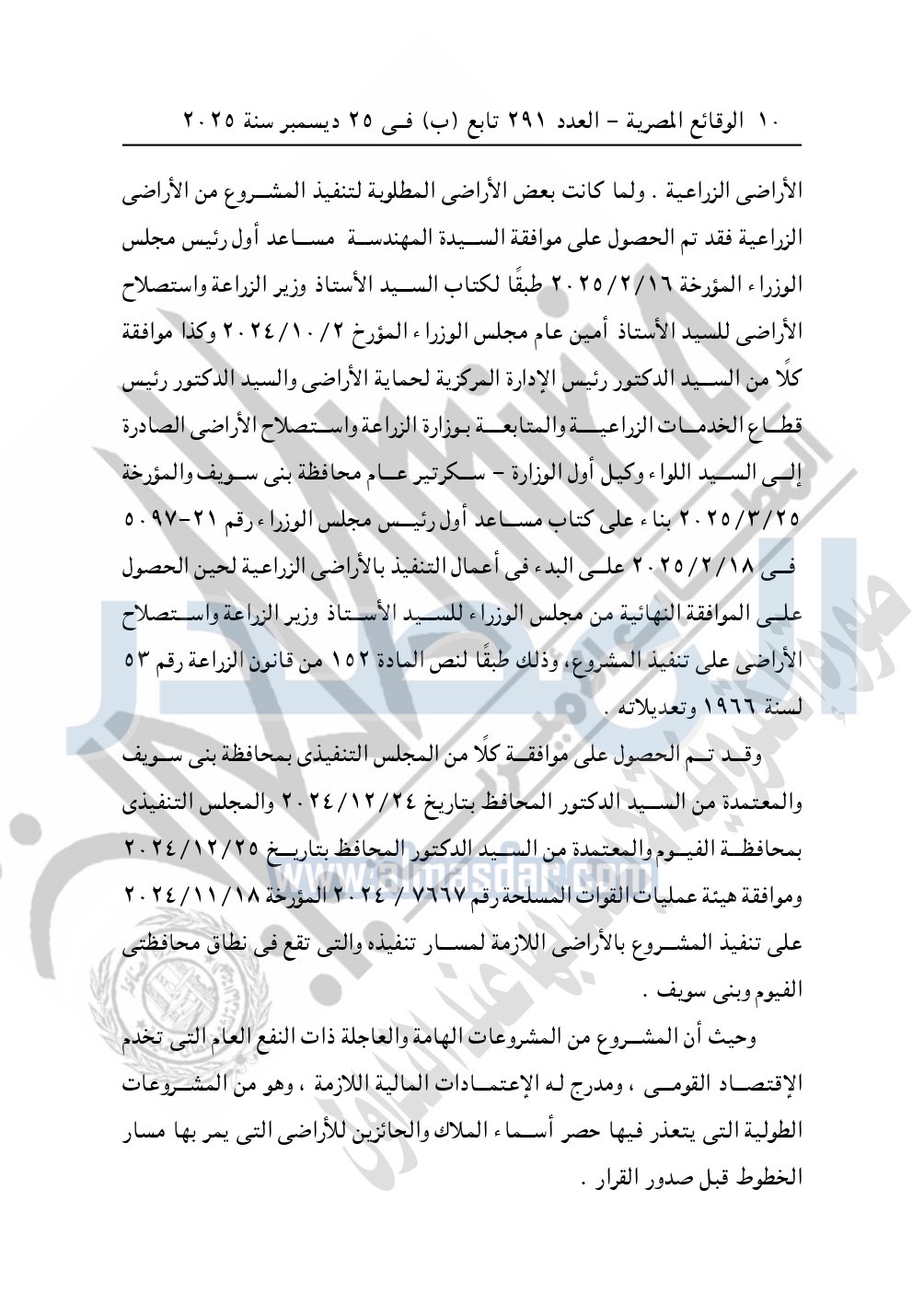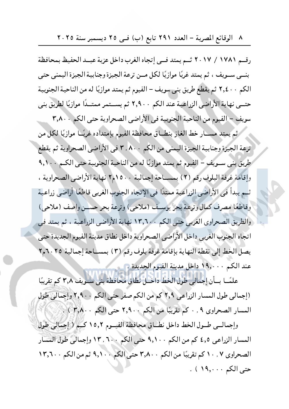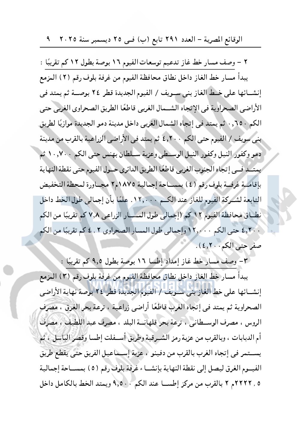 الموافقة على تنفيذ مشروع عدد "3" خطوط غاز طبیعی صلب بضغط 70 بار لتغذية مدن وقرى محافظة الفيوم بالغاز الطبيعي ضمن المبادرة وزارة الرئاسية "حياه كريمة" بأقطار 24 بوصة - 16 بوصة وبطول إجمالي 40.5 كم لمدة 18 شهر أو بانتهاء الغرض أيهما أقرب على الأراضي اللازمة له وذلك على النحو التالي: