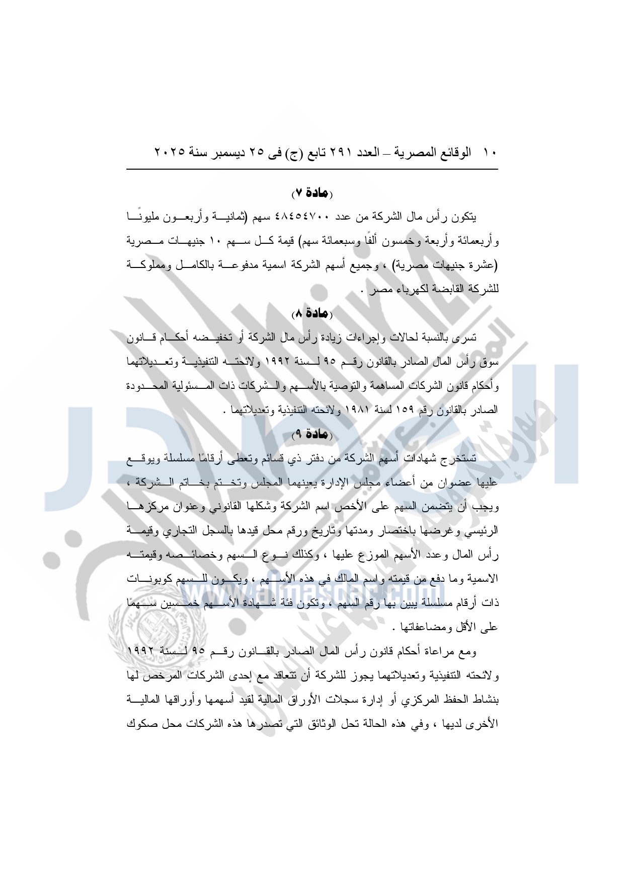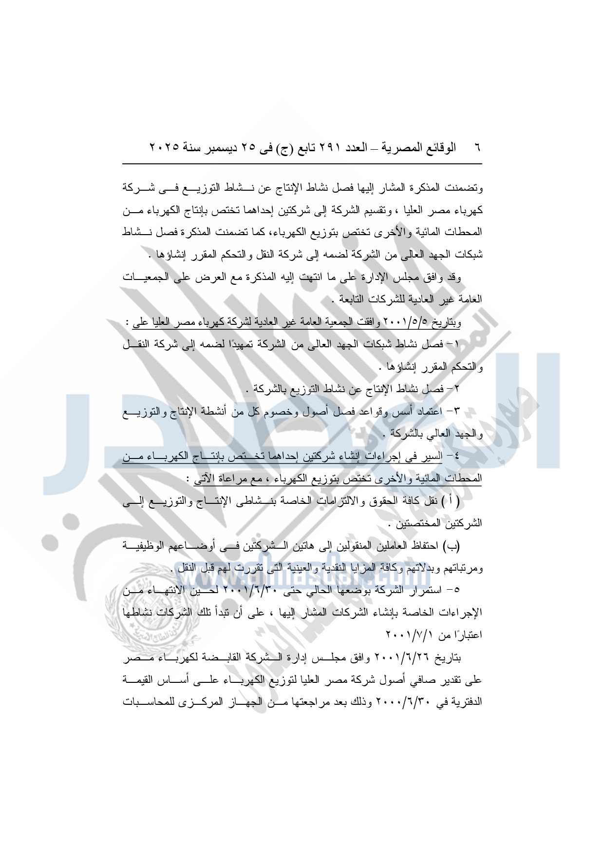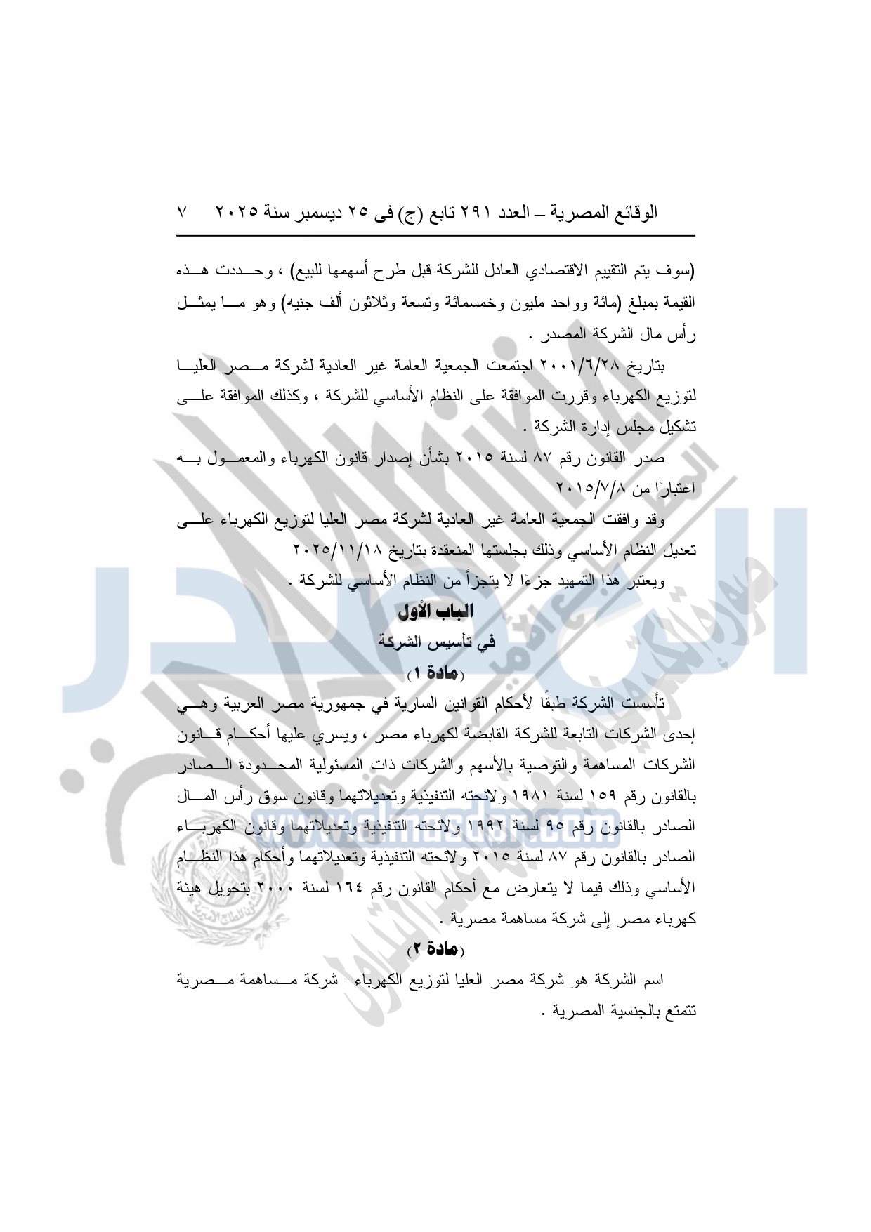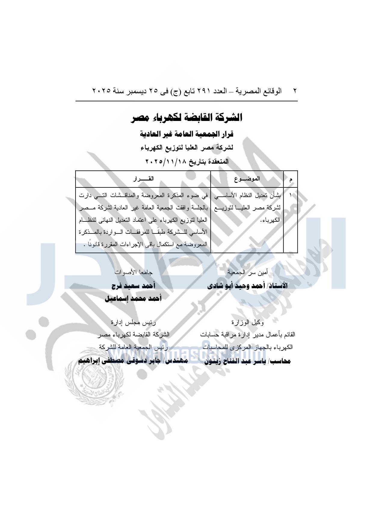 نشرت الوقائع المصرية في العدد 291 تابع "ج"، الصادر في 25 ديسمبر سنة 2025، الشركة القابضة لكهرباء مصر، قرار الجمعية العامة غير العادية لشركة مصر العليا لتوزيع الكهرباء، المنعقدة بتاريخ 18-11-2025