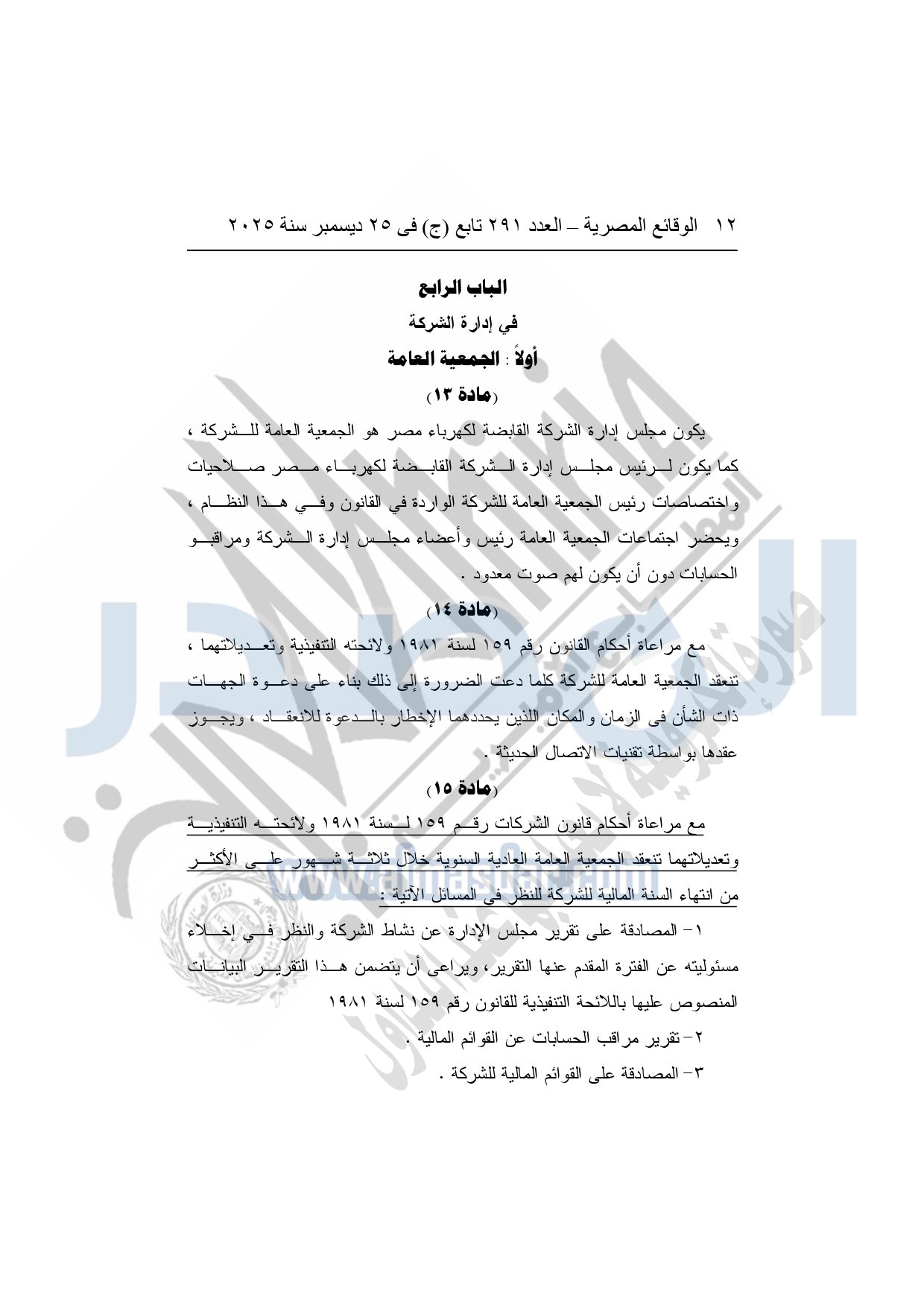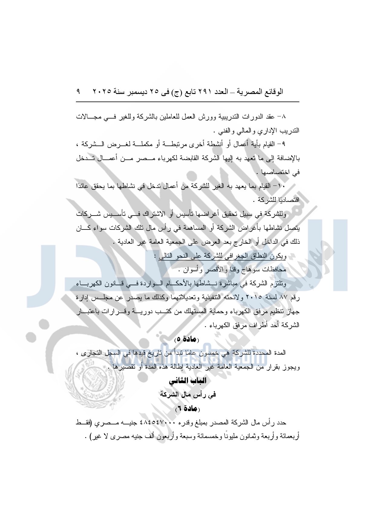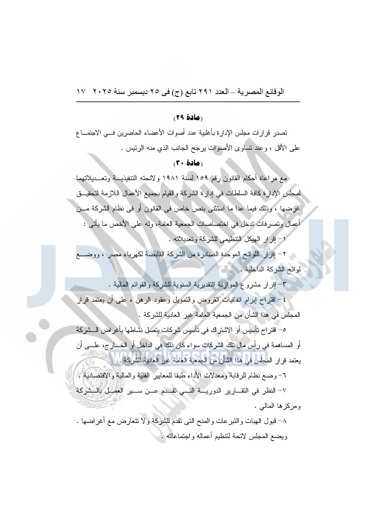 نشرت الوقائع المصرية في العدد 291 تابع "ج"، الصادر في 25 ديسمبر سنة 2025، الشركة القابضة لكهرباء مصر، قرار الجمعية العامة غير العادية لشركة مصر العليا لتوزيع الكهرباء، المنعقدة بتاريخ 18-11-2025