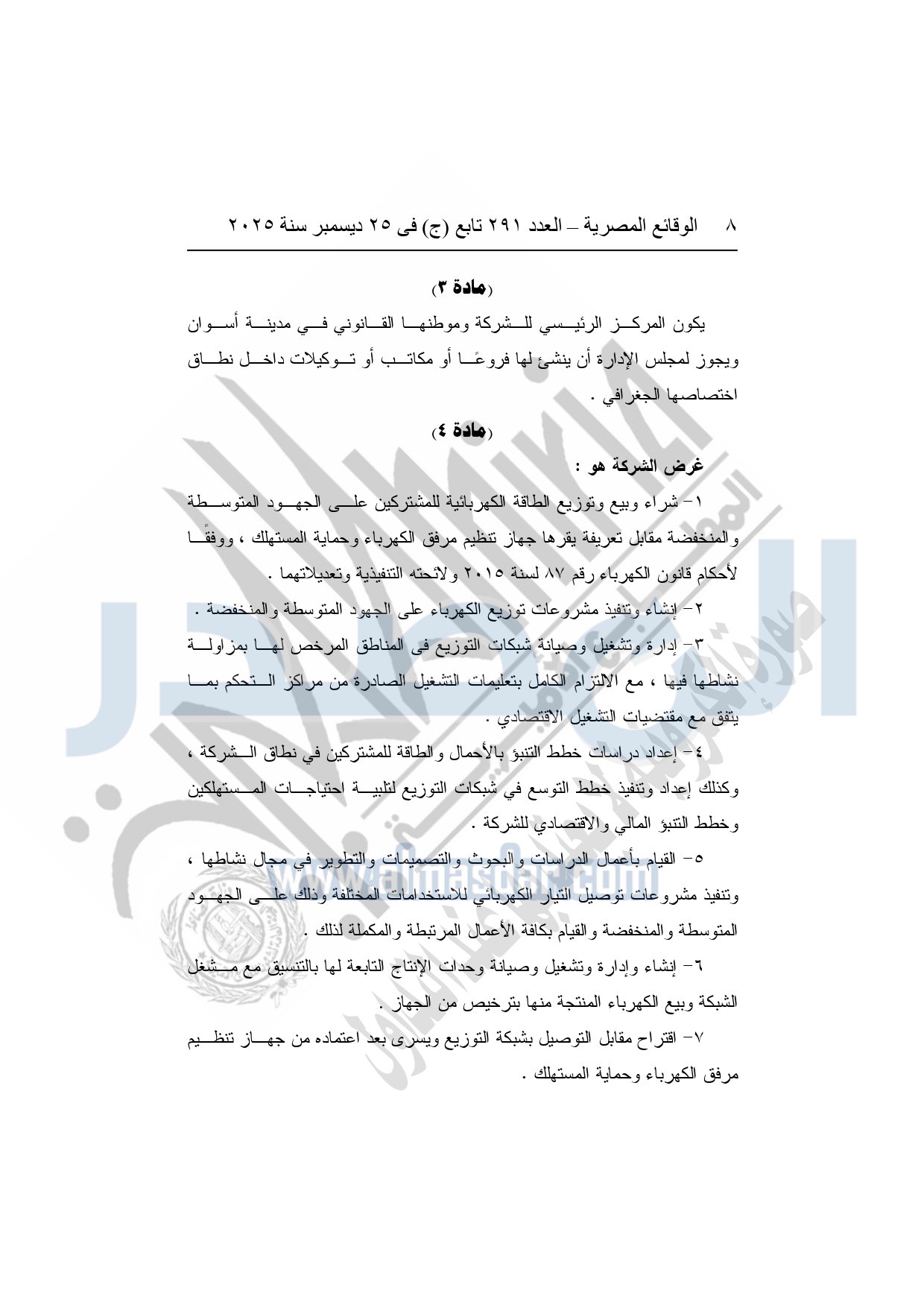 تعديل النظام الأساسي لشركة مصر العليا لتوزيع الكهرباء