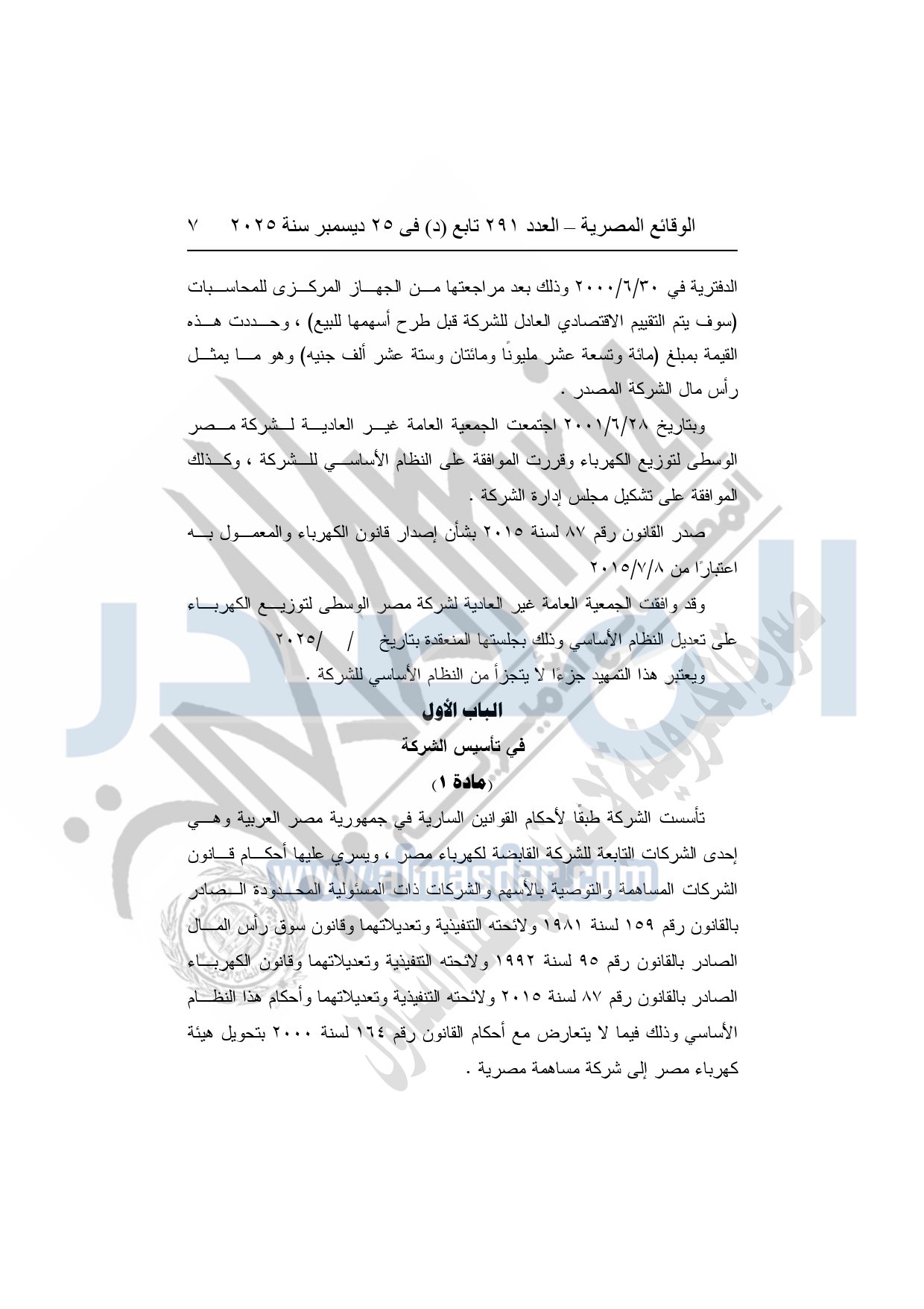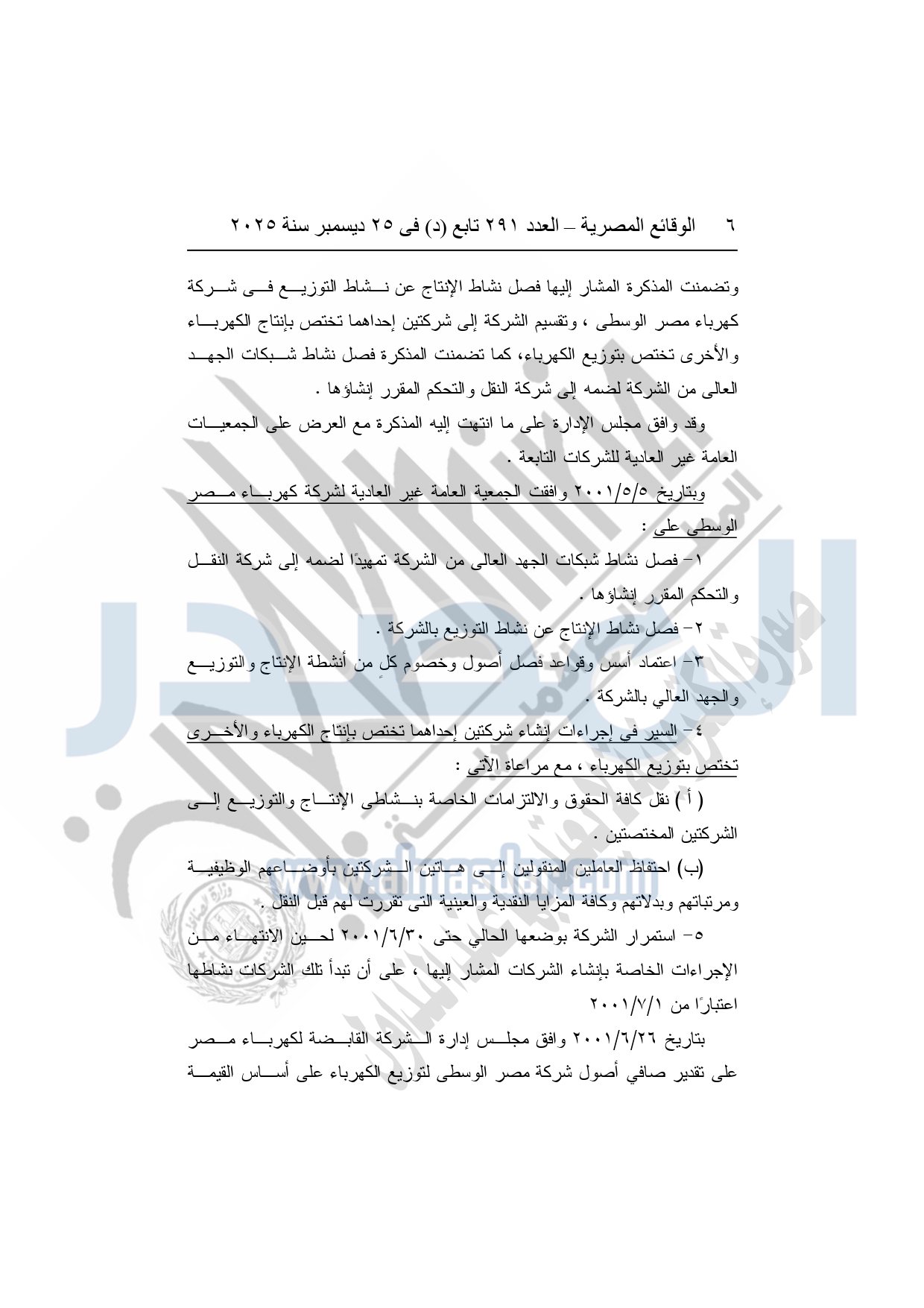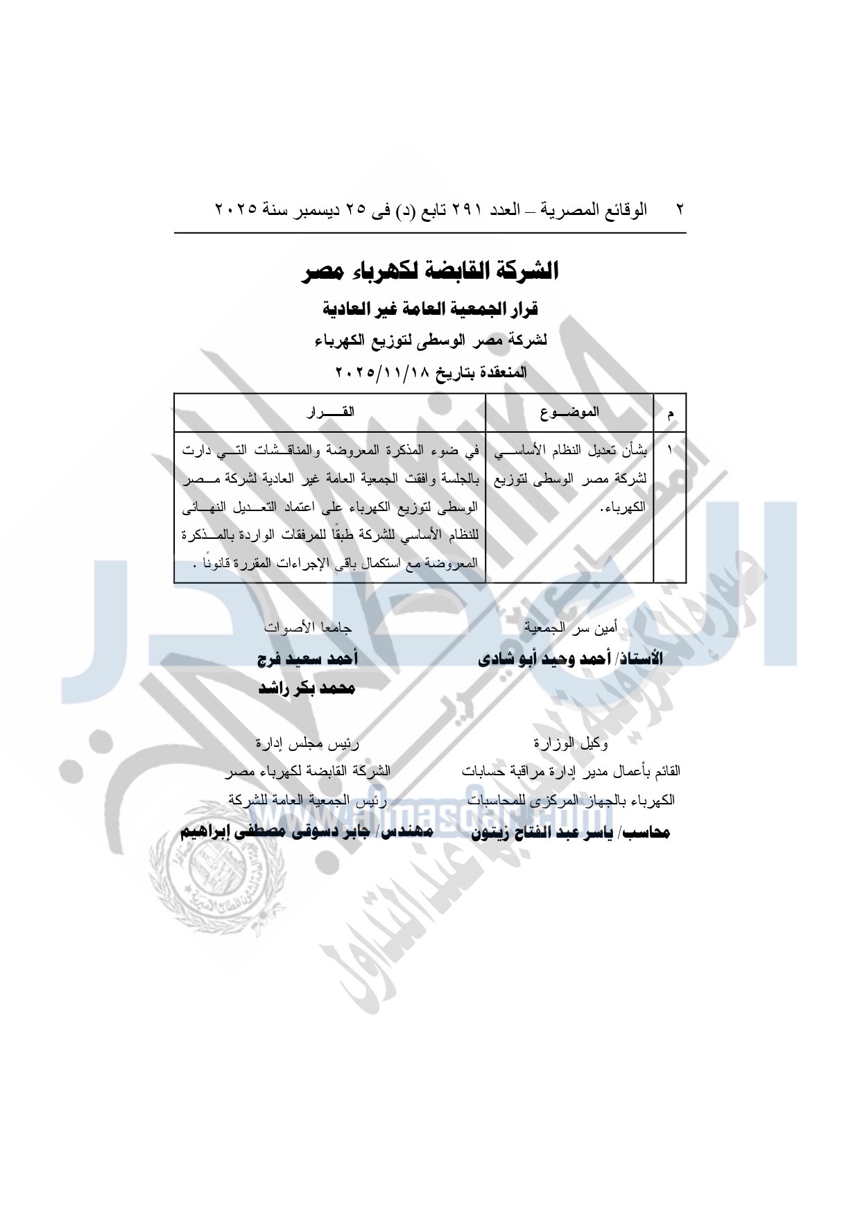 نشرت الوقائع المصرية في العدد 291 تابع "د"، الصادر في 25 ديسمبر سنة 2025، الشركة القابضة لكهرباء مصر، قرار الجمعية العامة غير العادية لشركة مصر الوسطى لتوزيع الكهرباء، المنعقدة بتاريخ 18-11-2025