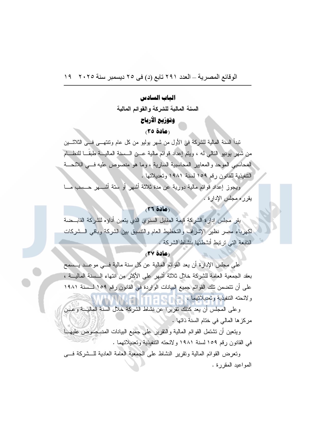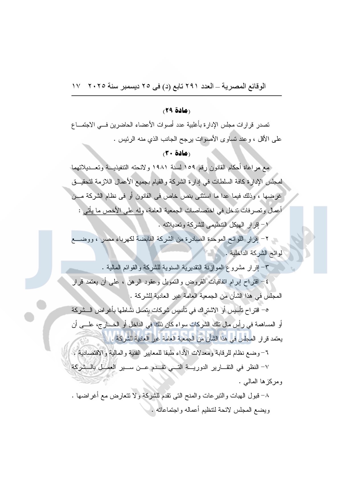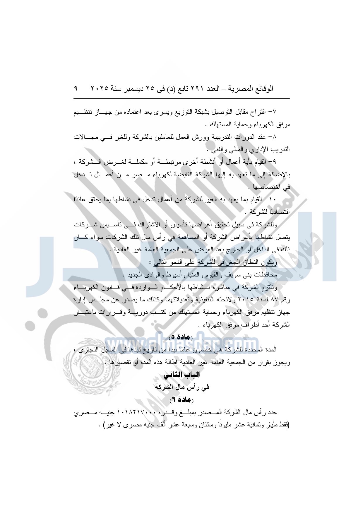 نشرت الوقائع المصرية في العدد 291 تابع "د"، الصادر في 25 ديسمبر سنة 2025، الشركة القابضة لكهرباء مصر، قرار الجمعية العامة غير العادية لشركة مصر الوسطى لتوزيع الكهرباء، المنعقدة بتاريخ 18-11-2025