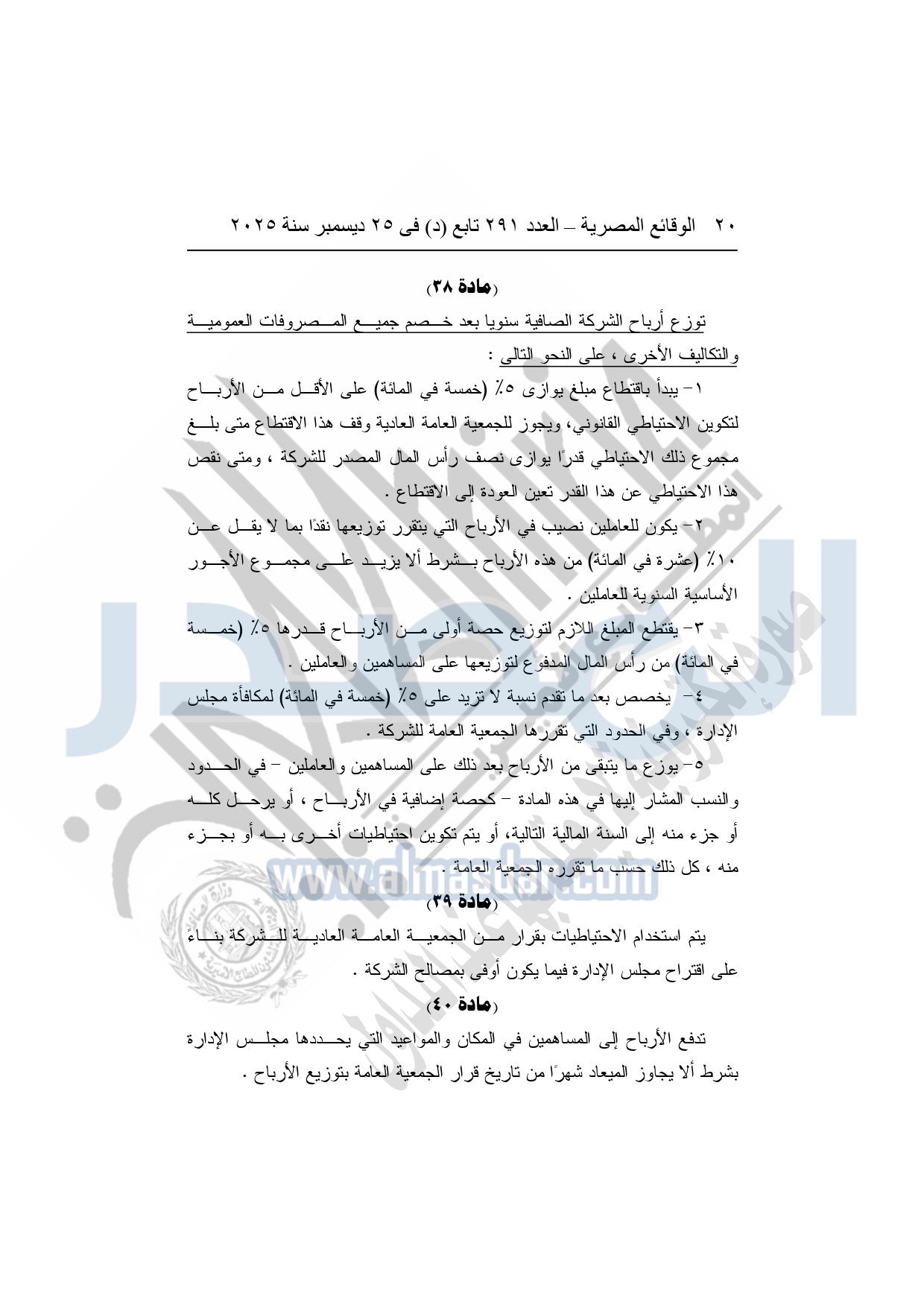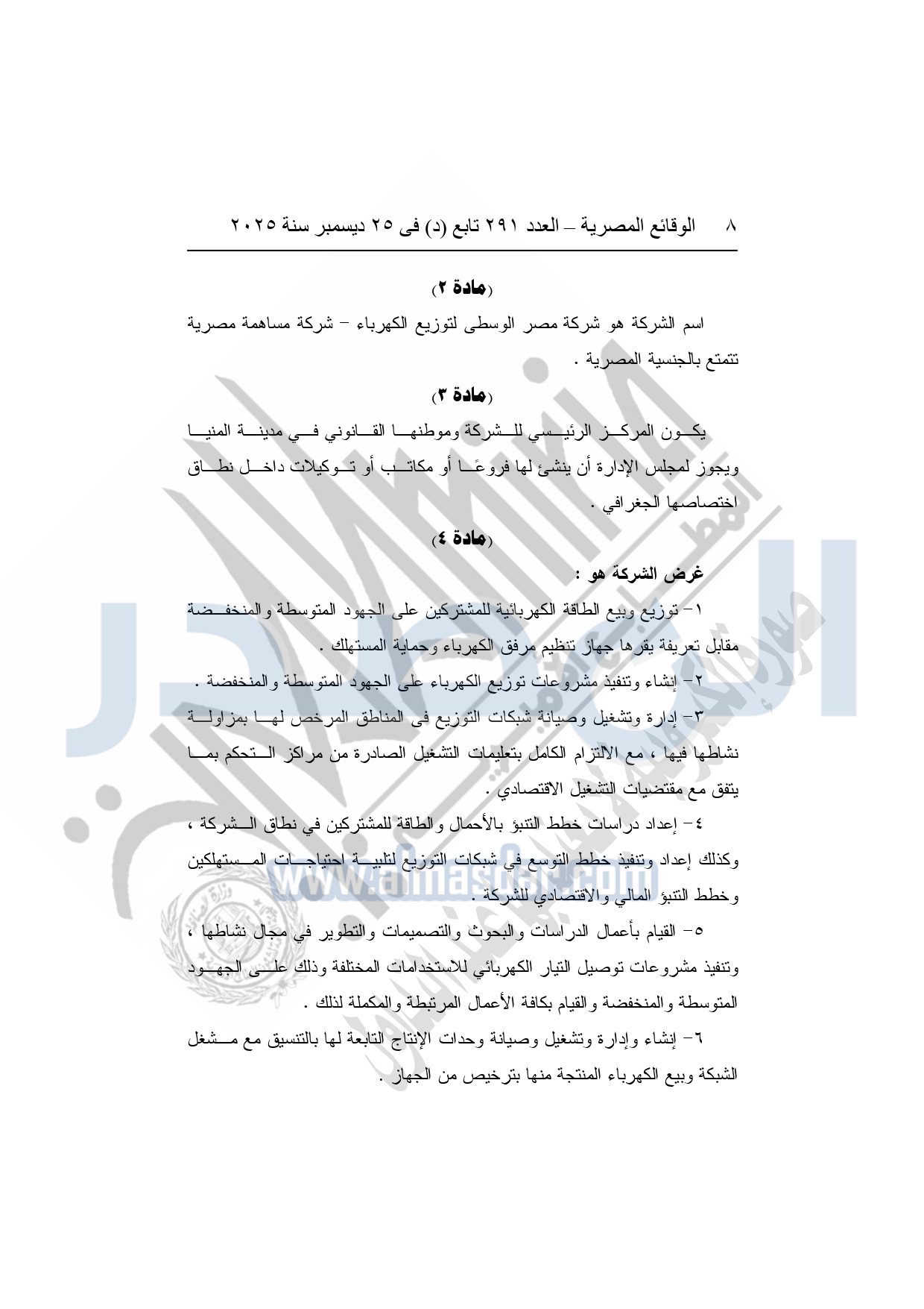بشأن تعديل النظام الأساسي لشركة مصر الوسطى لتوزيع الكهرباء.