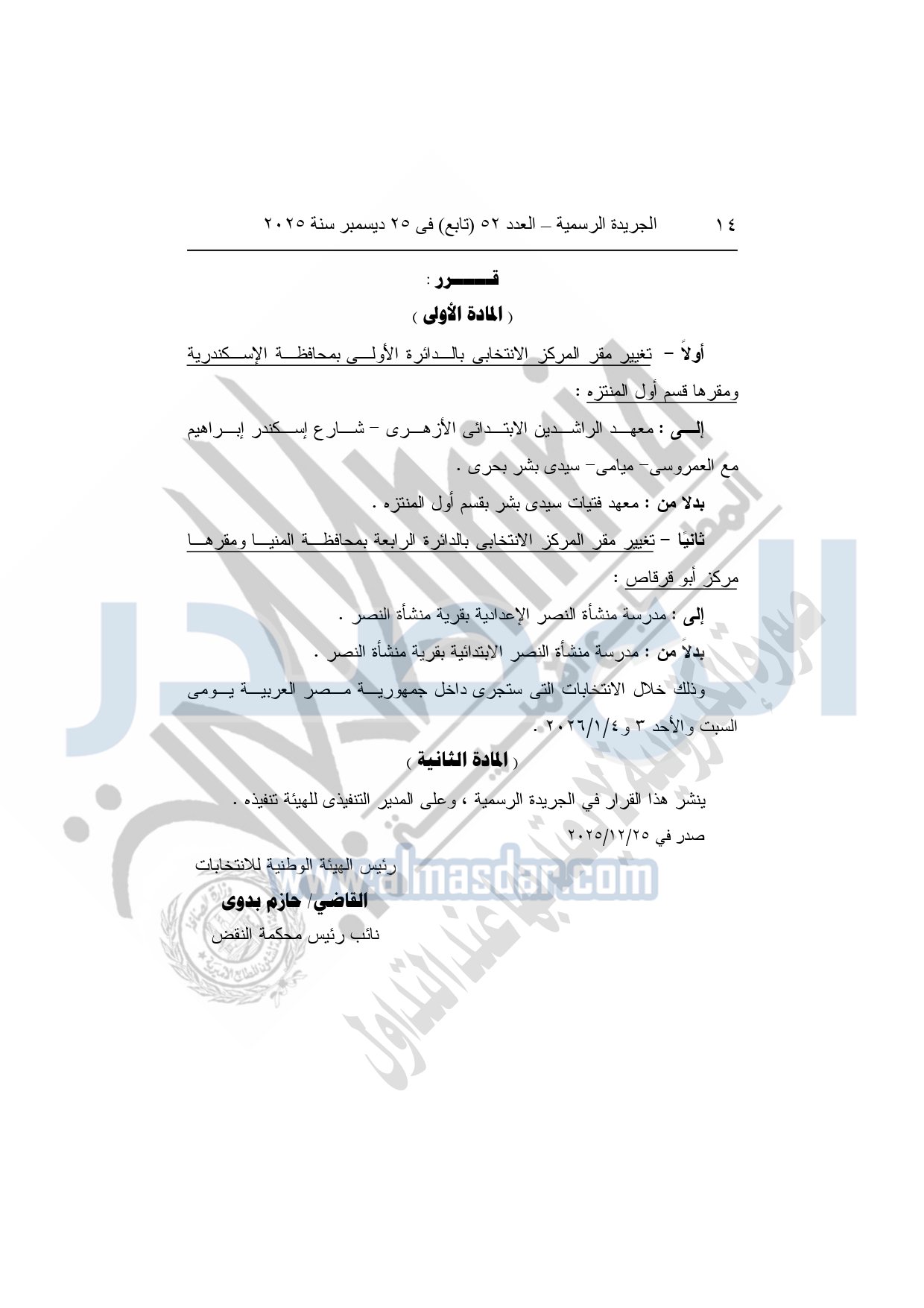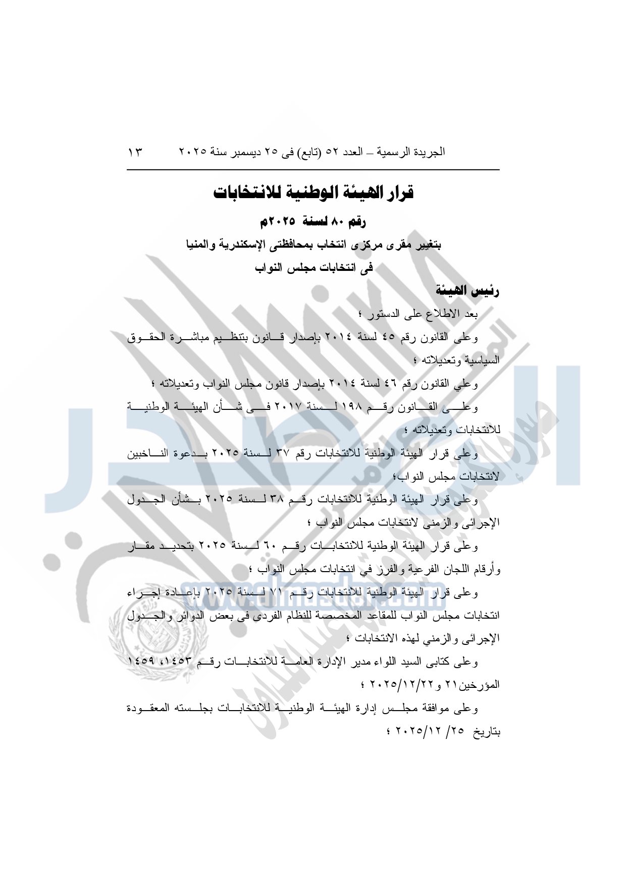 نشرت الوقائع المصرية في العدد 52 "تابع"، الصادر في 25 ديسمبر سنة 2025، قرار الهيئة الوطنية للانتخابات، رقم 80 لسنة 2025، بشأن تغيير مقری مرکزی انتخاب بمحافظتي الإسكندرية والمنيا في انتخابات مجلس النواب.