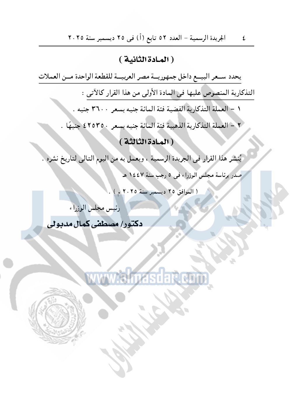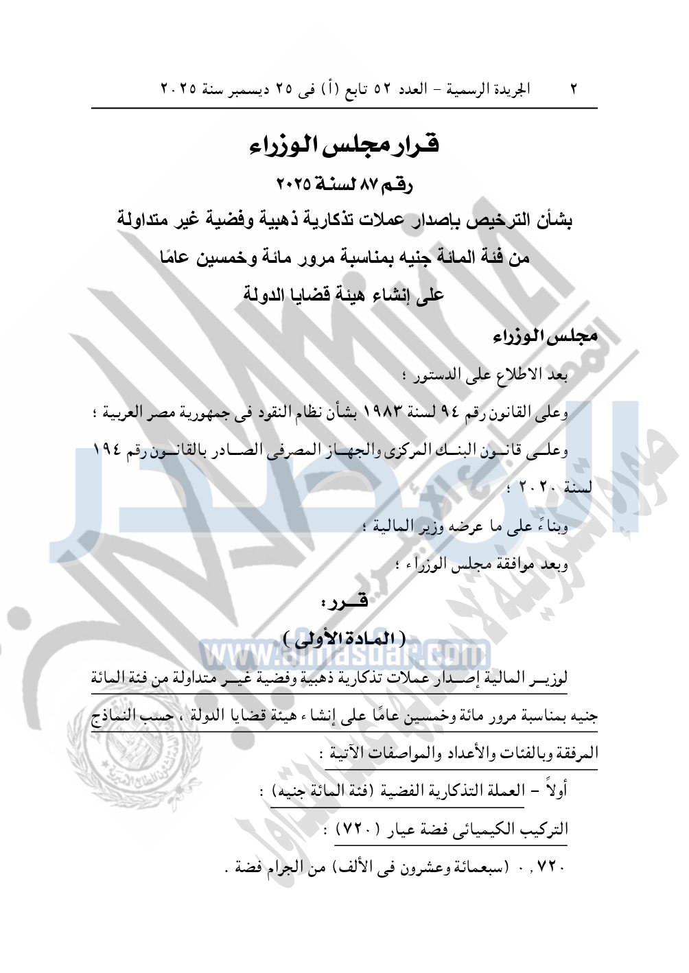 نشرت الوقائع المصرية في العدد 52 تابع "أ"، الصادر في 25 ديسمبر سنة 2025، قرار رئيس مجلس الوزراء، رقم 87 لسنة 2025، بشأن الترخيص بإصدار عملات تذكارية ذهبية وفضية غير متداولة من فئة المائة جنيه بمناسبة مرور مائة وخمسين عامًا على إنشاء هيئة قضايا الدولة.