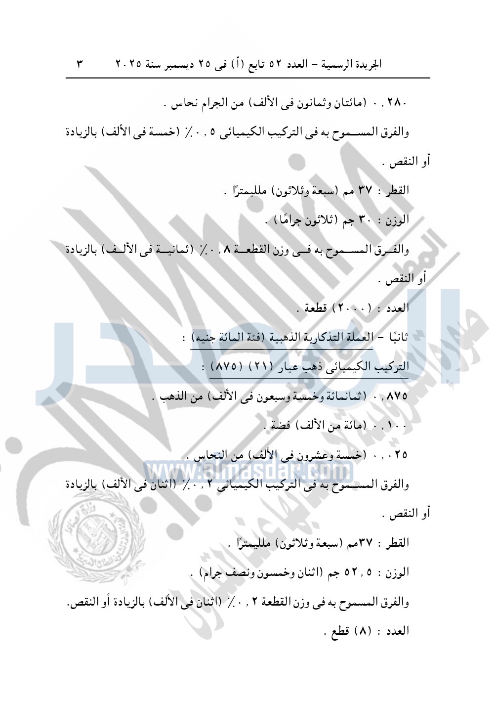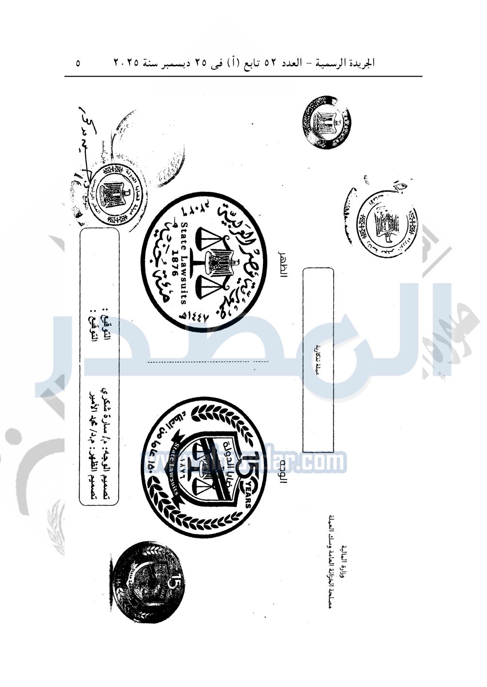 لوزير المالية إصدار عملات تذكارية ذهبية وفضية غير متداولة من فئة المائة جنيه بمناسبة مرور مائة وخمسين عاماً على إنشاء هيئة قضايا الدولة، حسب النماذج المرفقة وبالفئات والأعداد والمواصفات الآتية: