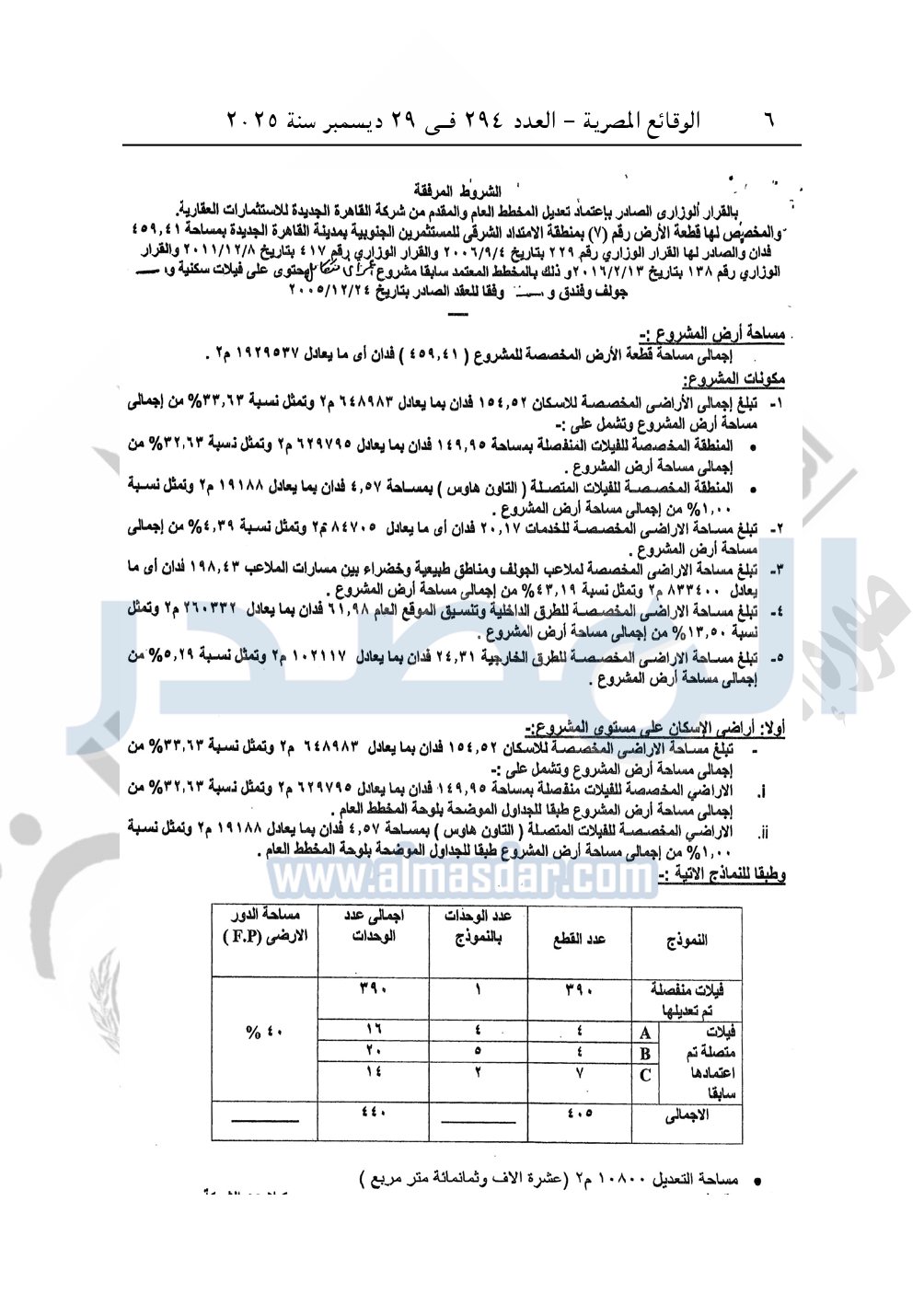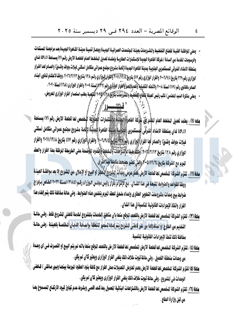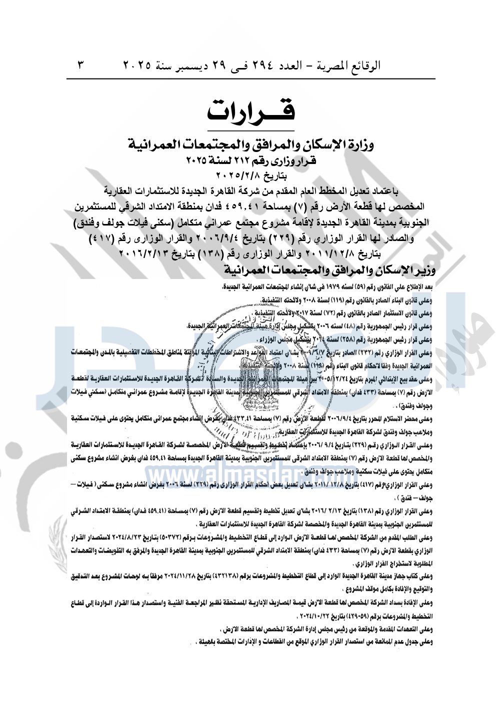 نشرت الوقائع المصرية في العدد 294، بتاريخ 29 ديسمبر 2025، قرار وزارة الإسكان والمرافق والمجتمعات العمرانية، قرار رقم 212 لسنة 2025، بتاريخ 8-2-2025، بشأن اعتماد تعديل المخطط العام المقدم من شركة القاهرة الجديدة للاستثمارات العقارية المخصص لها قطعة الأرض رقم "7" بمساحة 459.41 فدان بمنطقة الامتداد الشرقي للمستثمرين الجنوبية بمدينة القاهرة الجديدة لإقامة مشروع مجتمع عمراني متكامل "سكنى فيلات جولف وفندق".