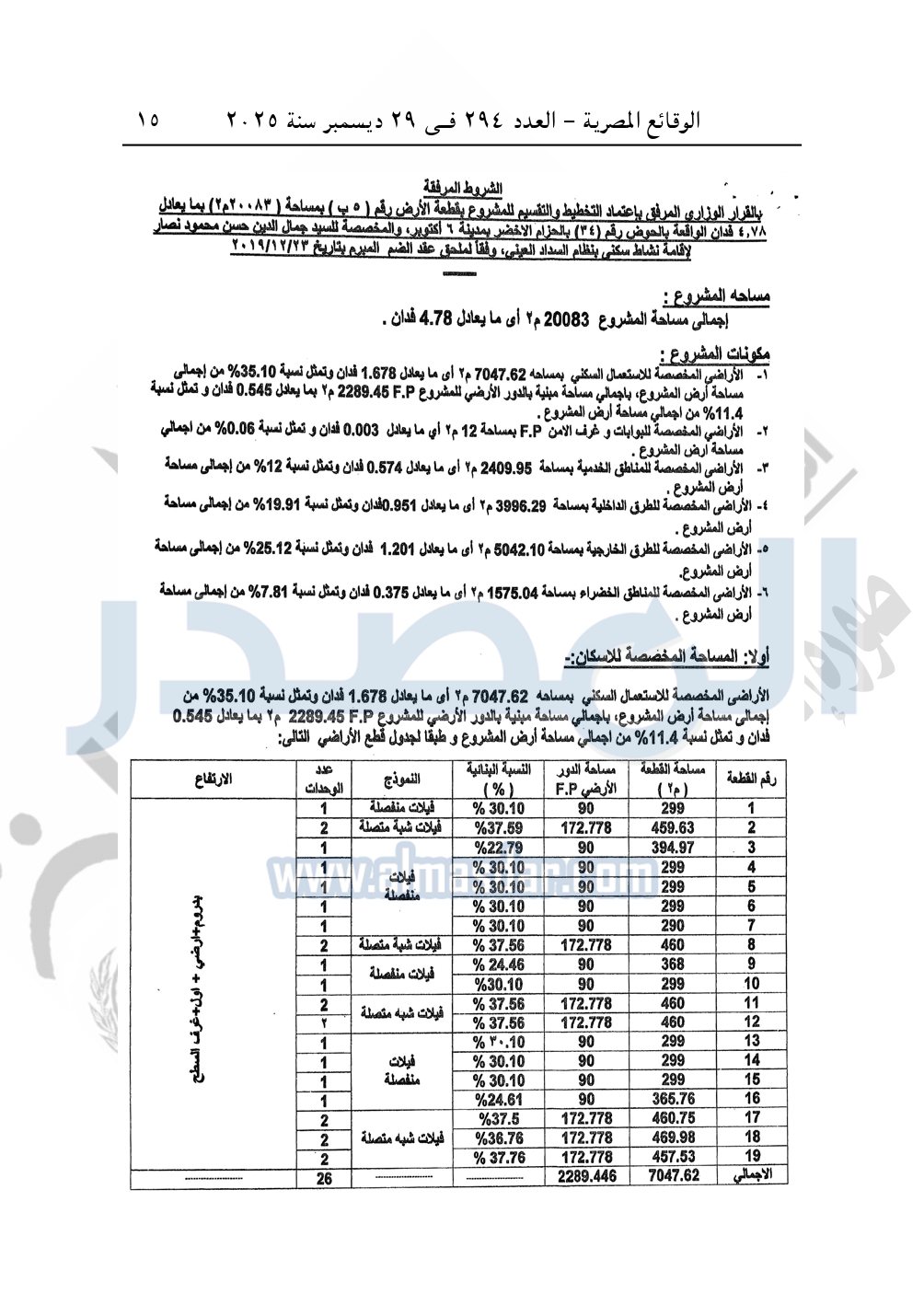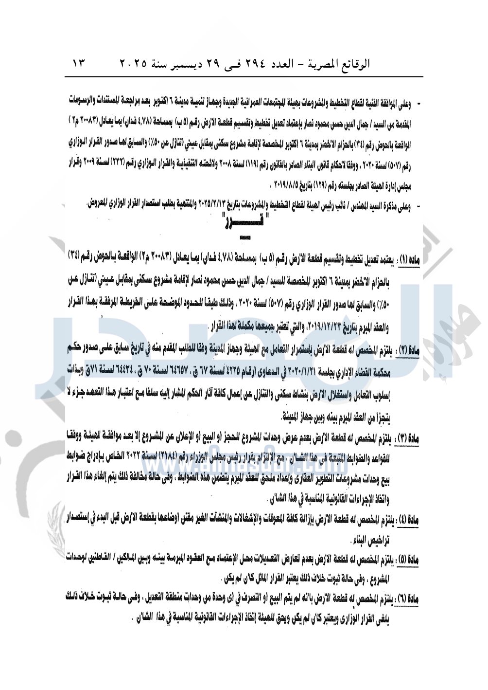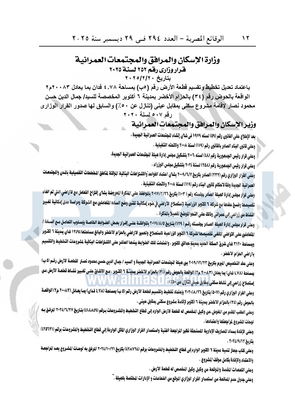 نشرت الوقائع المصرية في العدد 294، بتاريخ 29 ديسمبر 2025، قرار وزارة الإسكان والمرافق والمجتمعات العمرانية، قرار رقم 252 لسنة 2025، بتاريخ 20-2-2025، بشأن اعتماد تعديل تخطيط وتقسيم قطعة الأرض رقم "5 ب" بمساحة 4.78 فدان بما يعادل 20083م2 الواقعة بالحوض رقم "34" بالحزام الأخضر بمدينة 6 أكتوبر المخصصة لجمال الدين حسن محمود نصار لإقامة مشروع سكنى بمقابل عينى تنازل عن "50%" والسابق لها صدور القرار الوزارى رقم 507 لسنة 2020.