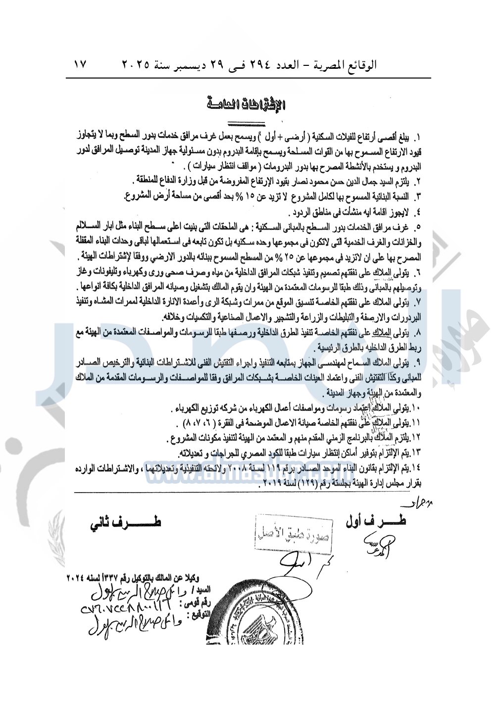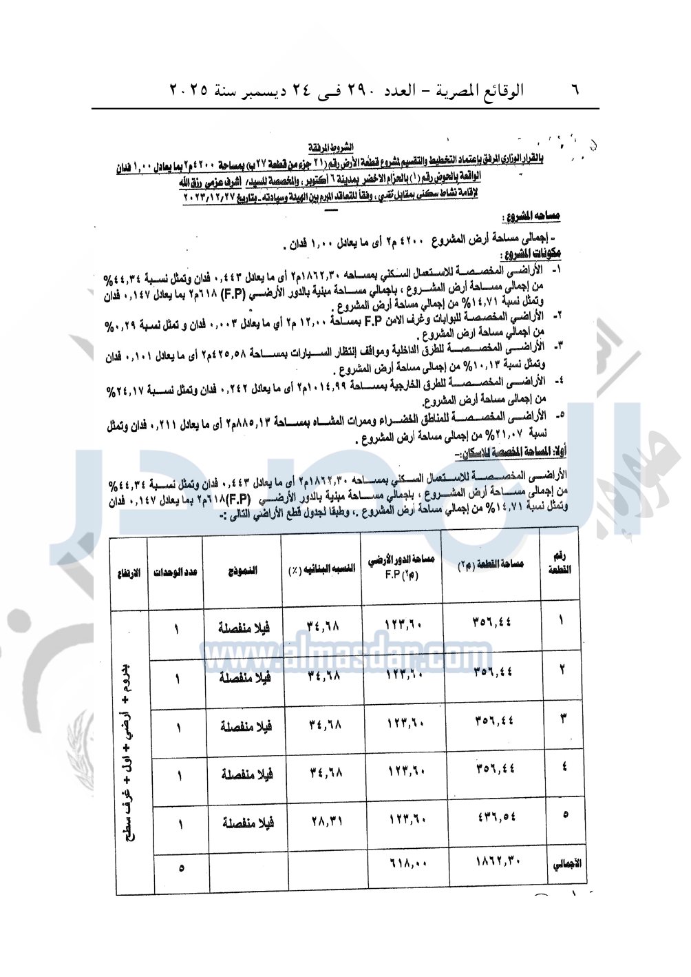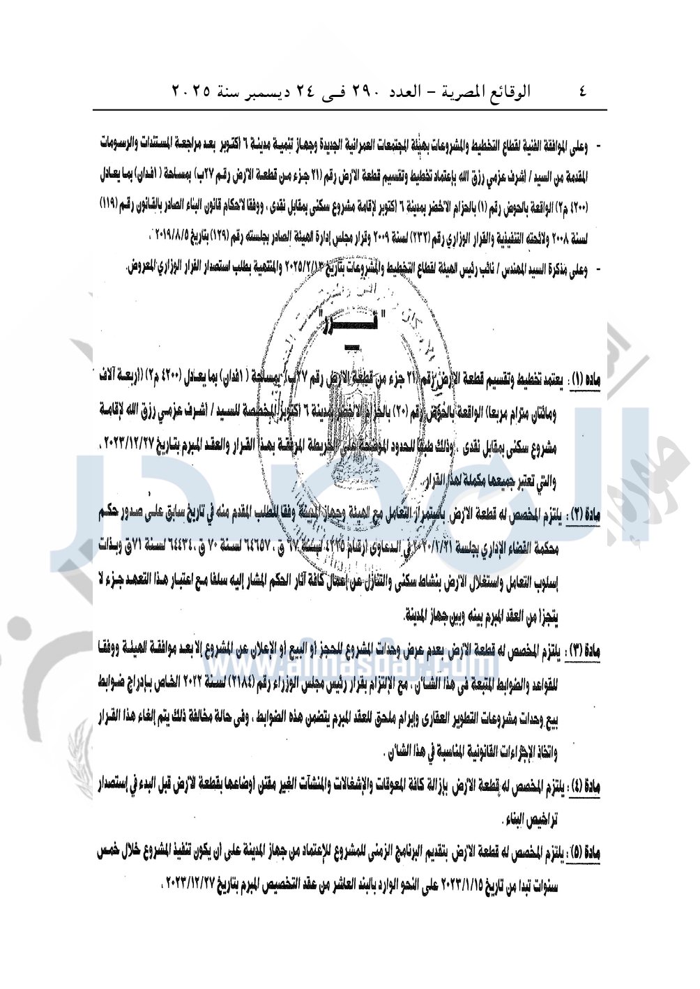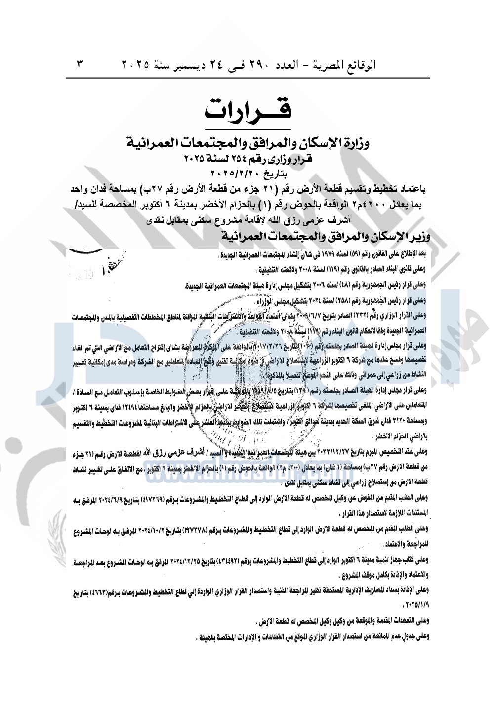 كما نشرت الوقائع المصرية في العدد 290، بتاريخ 24 ديسمبر 2025، قرار وزارة الإسكان والمرافق والمجتمعات العمرانية، قرار رقم 254 لسنة 2025، بتاريخ 20-2-2025، بشأن اعتماد تخطيط وتقسيم قطعة الأرض رقم "21 جزء من قطعة الأرض رقم 27 ب" بمساحة فدان واحد بما يعادل 4200م2 الواقعة بالحوض رقم "1" بالحزام الأخضر بمدينة 6 أكتوبر المخصصة لأشرف عزمى رزق الله لإقامة مشروع سكنى بمقابل نقدی.