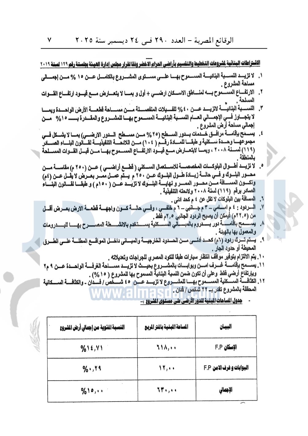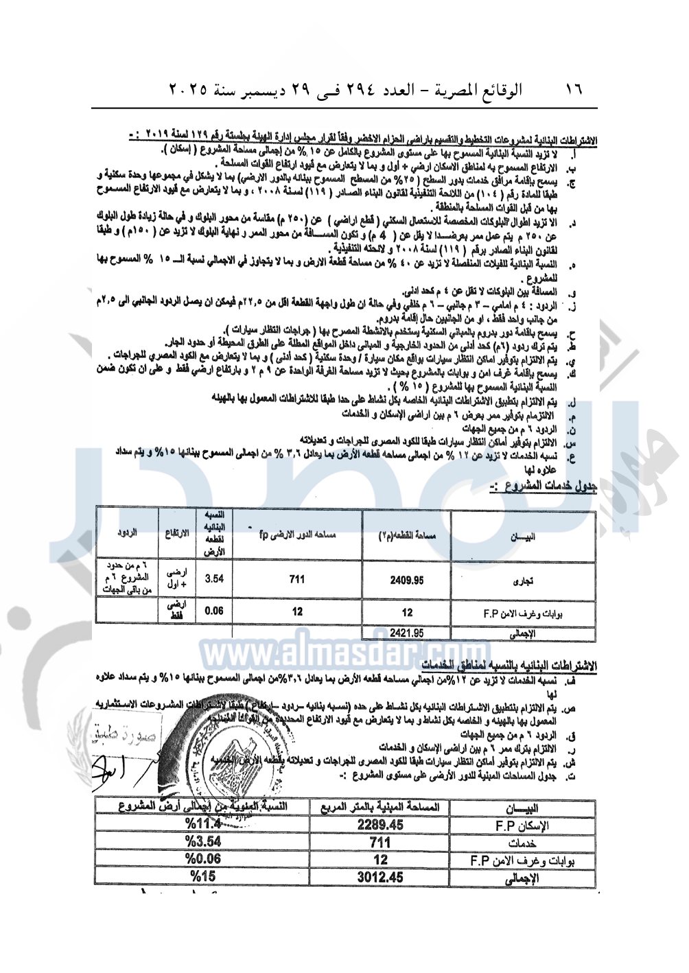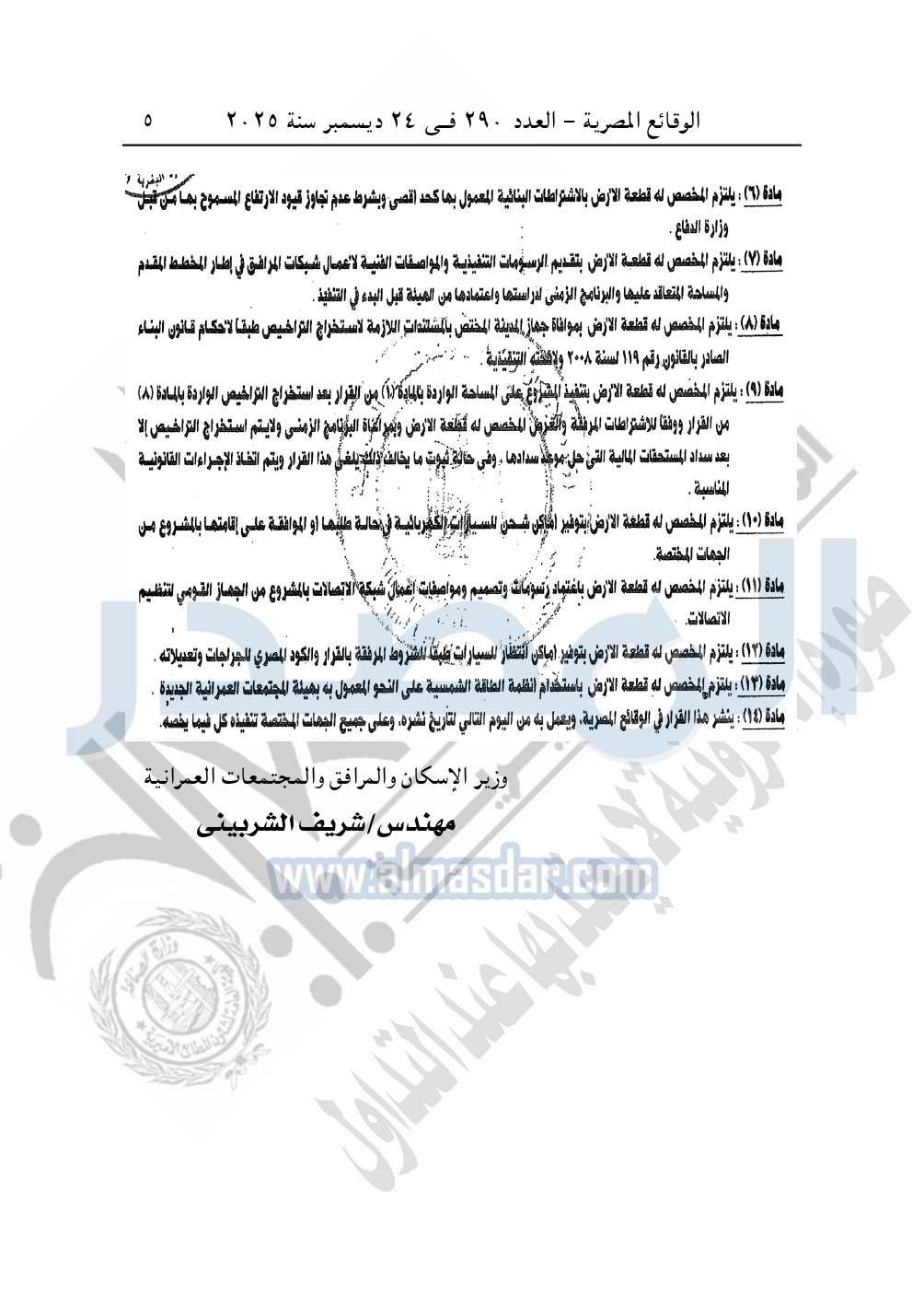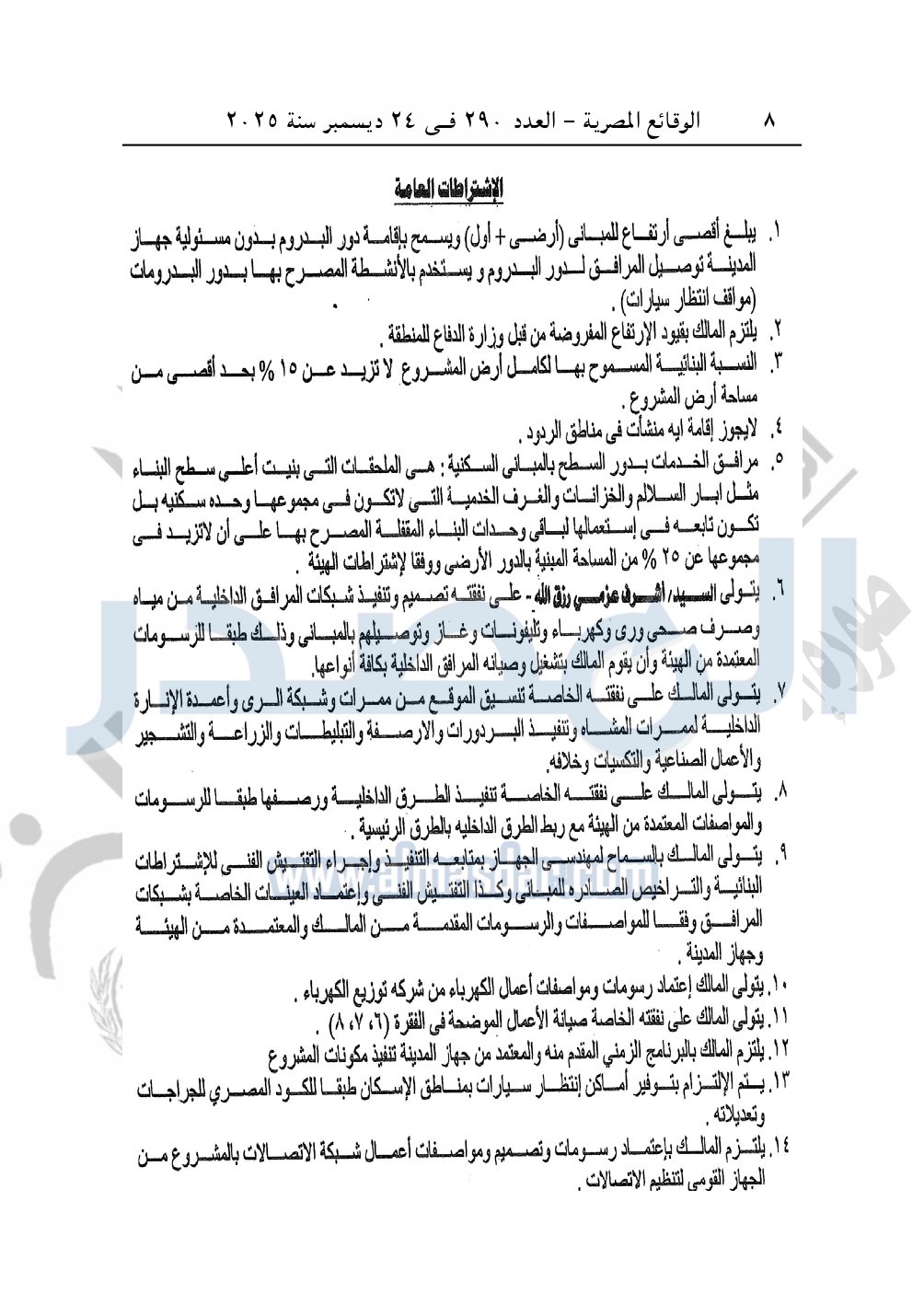 كما نشرت الوقائع المصرية في العدد 290، بتاريخ 24 ديسمبر 2025، قرار وزارة الإسكان والمرافق والمجتمعات العمرانية، قرار رقم 254 لسنة 2025، بتاريخ 20-2-2025، بشأن اعتماد تخطيط وتقسيم قطعة الأرض رقم "21 جزء من قطعة الأرض رقم 27 ب" بمساحة فدان واحد بما يعادل 4200م2 الواقعة بالحوض رقم "1" بالحزام الأخضر بمدينة 6 أكتوبر المخصصة لأشرف عزمى رزق الله لإقامة مشروع سكنى بمقابل نقدی.