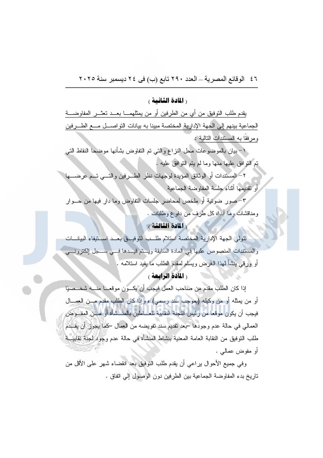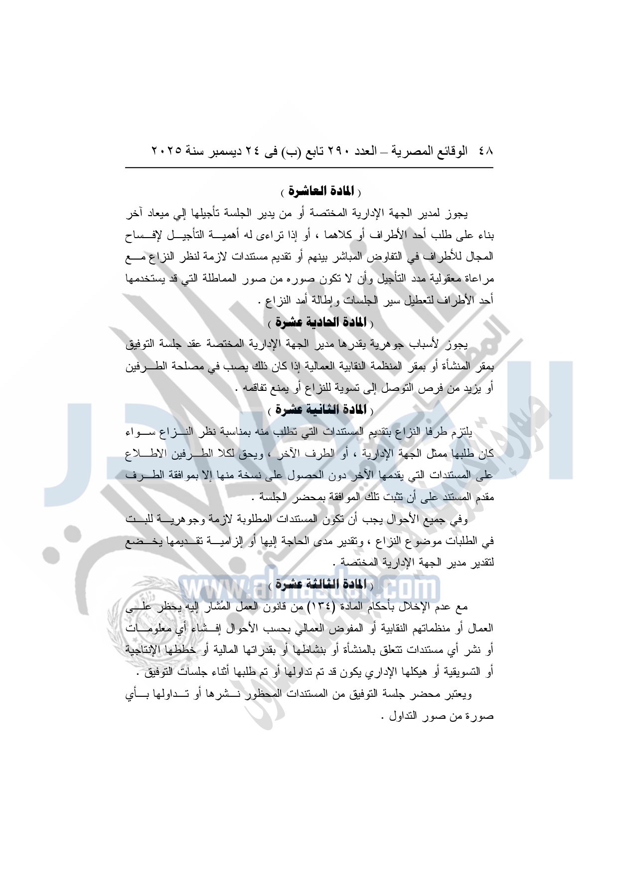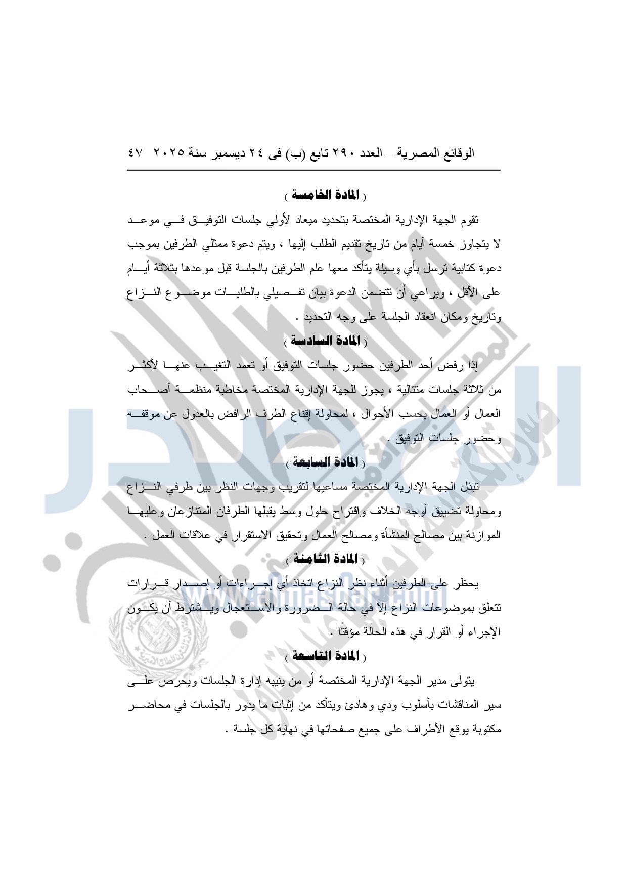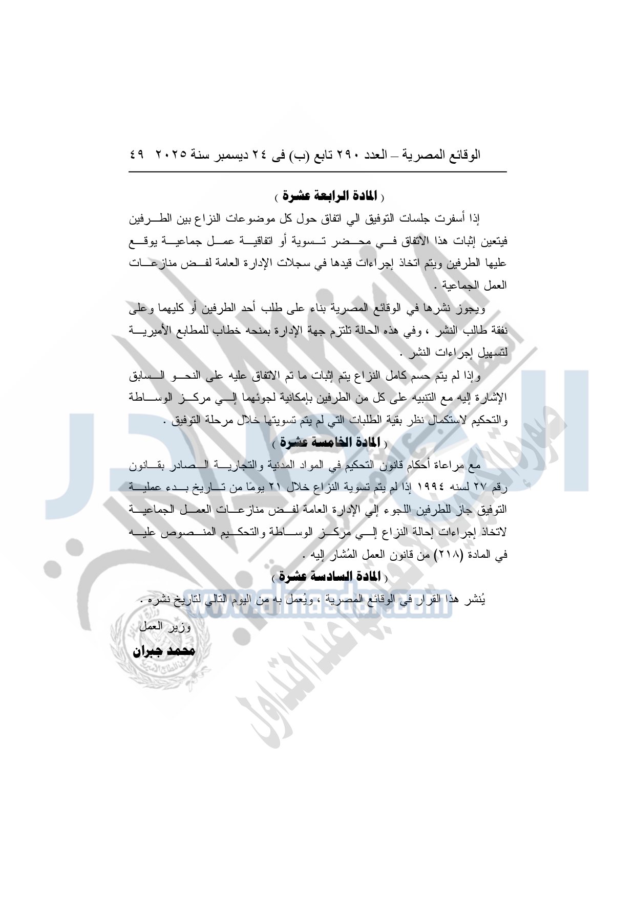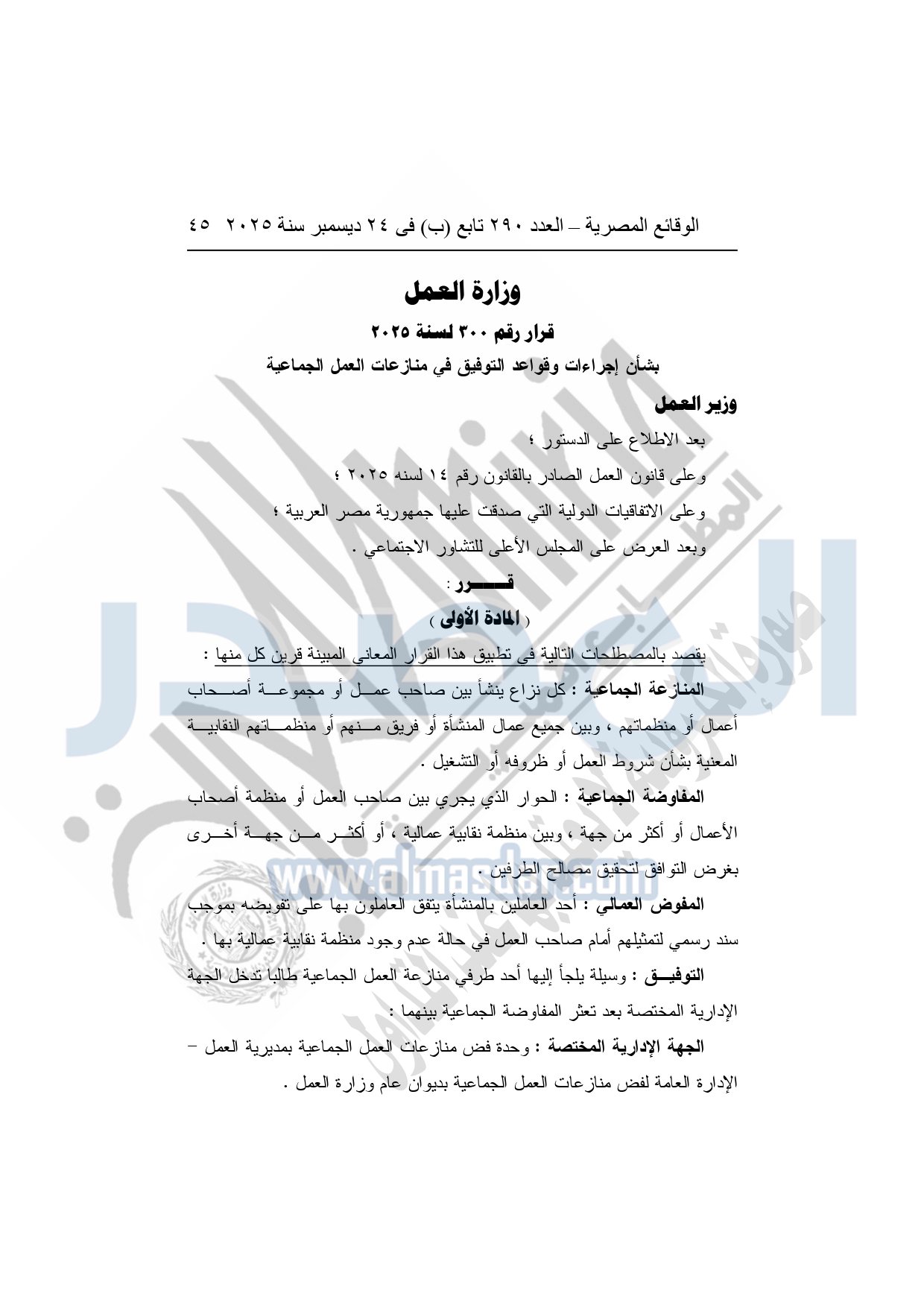 نشرت الوقائع المصرية في العدد 290 تابع "ب"، بتاريخ 24 ديسمبر 2025، قرار وزارة العمل، قرار رقم 300 لسنة 2025، بشأن إجراءات وقواعد التوفيق في منازعات العمل الجماعية.