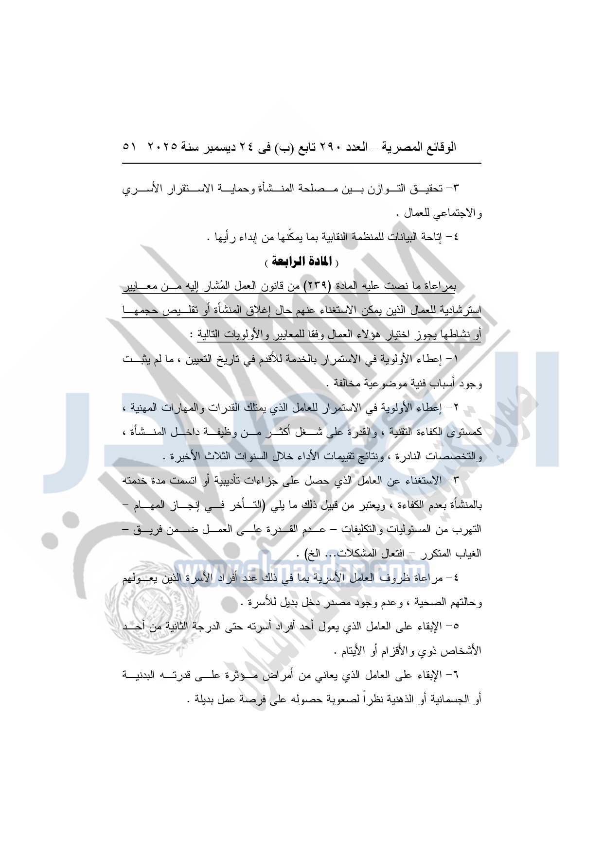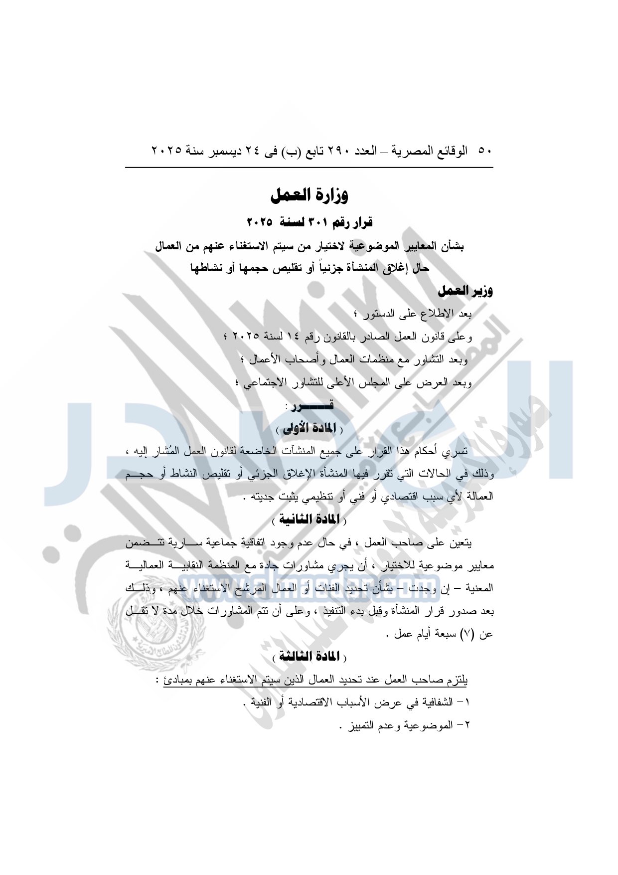 نشرت الوقائع المصرية في العدد 290 تابع "ب"، بتاريخ 24 ديسمبر 2025، قرار وزارة العمل، قرار رقم 301 لسنة 2025، بشأن المعايير الموضوعية لاختيار من سيتم الاستغناء عنهم من العمال حال إغلاق المنشأة جزئياً أو تقليص حجمها أو نشاطها.