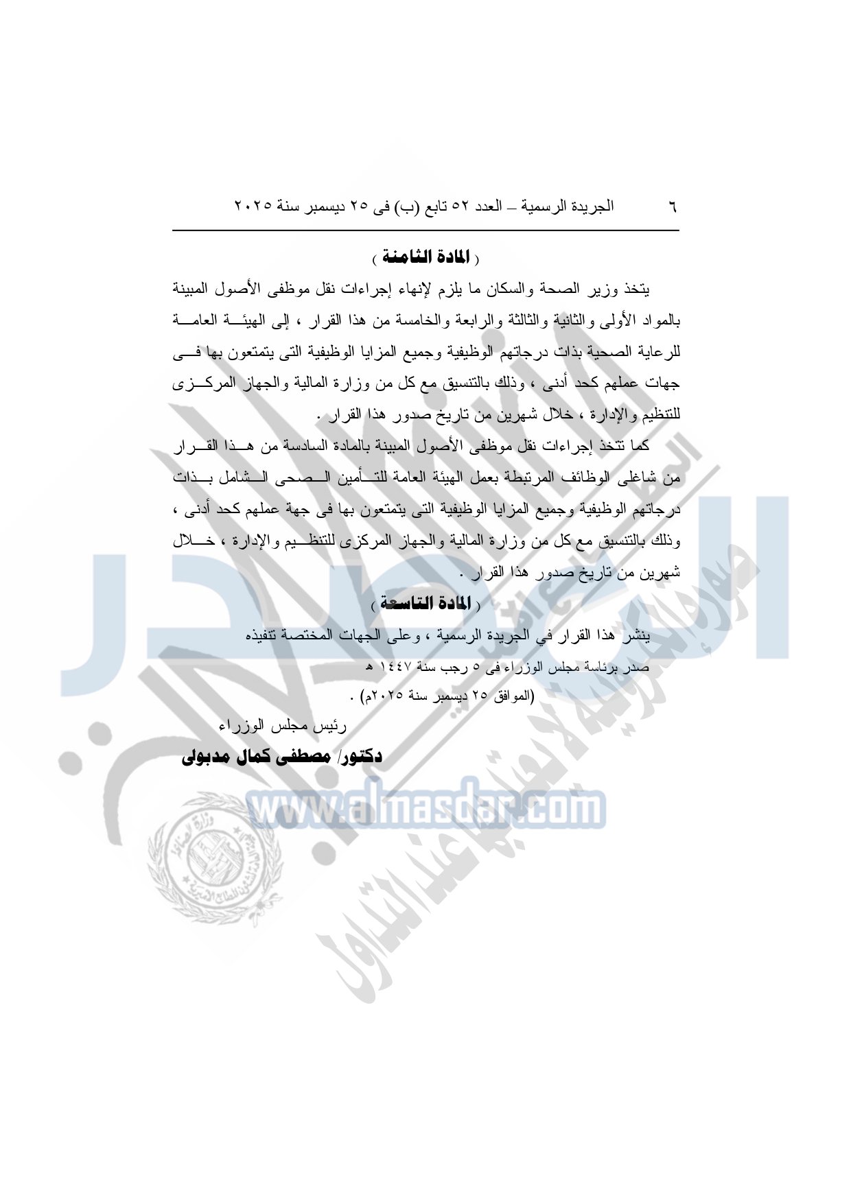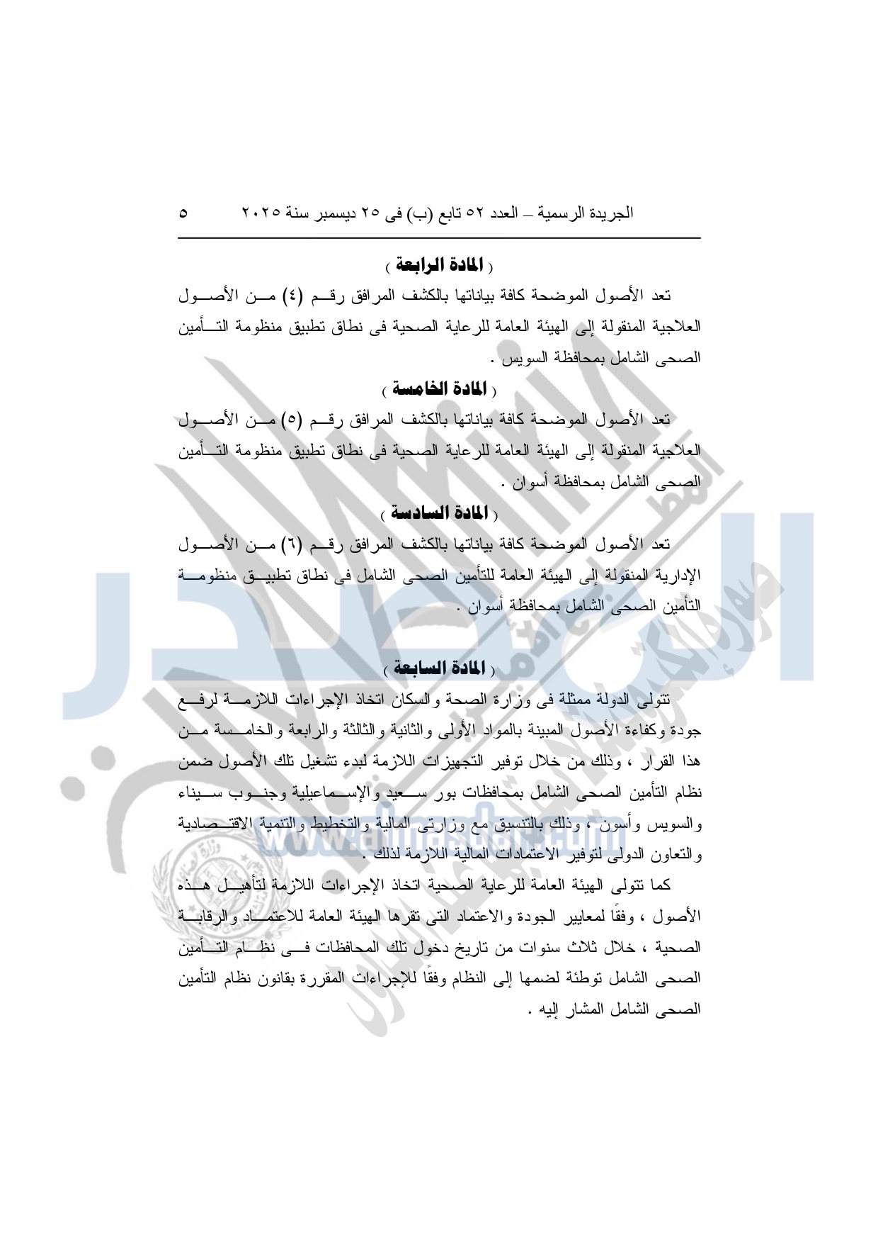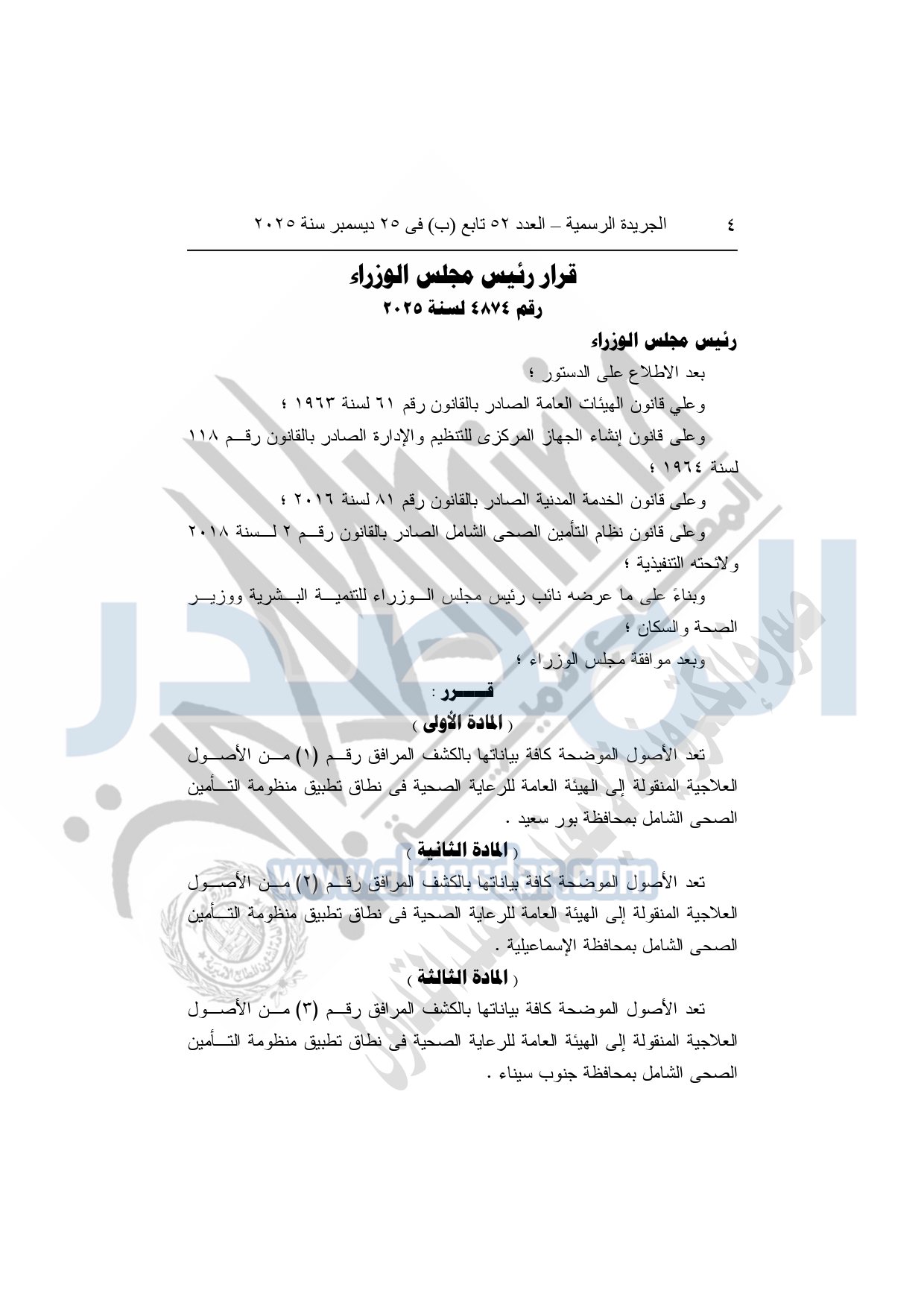 نشرت الجريدة الرسمية، في العدد 52 مكرر "ب"، بتاريخ 25 ديسمبر 2025، قرار رئيس مجلس الوزراء، قرار رقم 4874 لسنة 2025، بشأن نقل أصول علاجية لمنظومة التأمين الصحي الشامل.