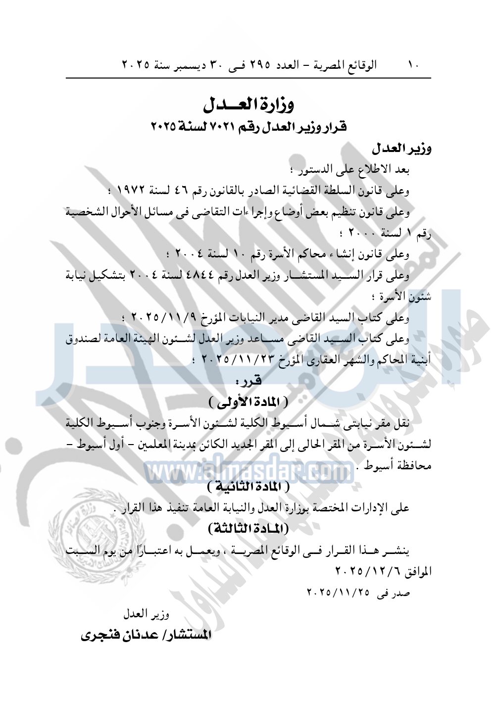 نشرت الوقائع المصرية في العدد 295، بتاريخ 30 ديسمبر 2025، قرار وزارة العدل، رقم 7021 لسنة 2025، بشأن نقل مقر نيابتي شمال أسيوط الكلية لشئون الأسرة وجنوب أسيوط الكلية.