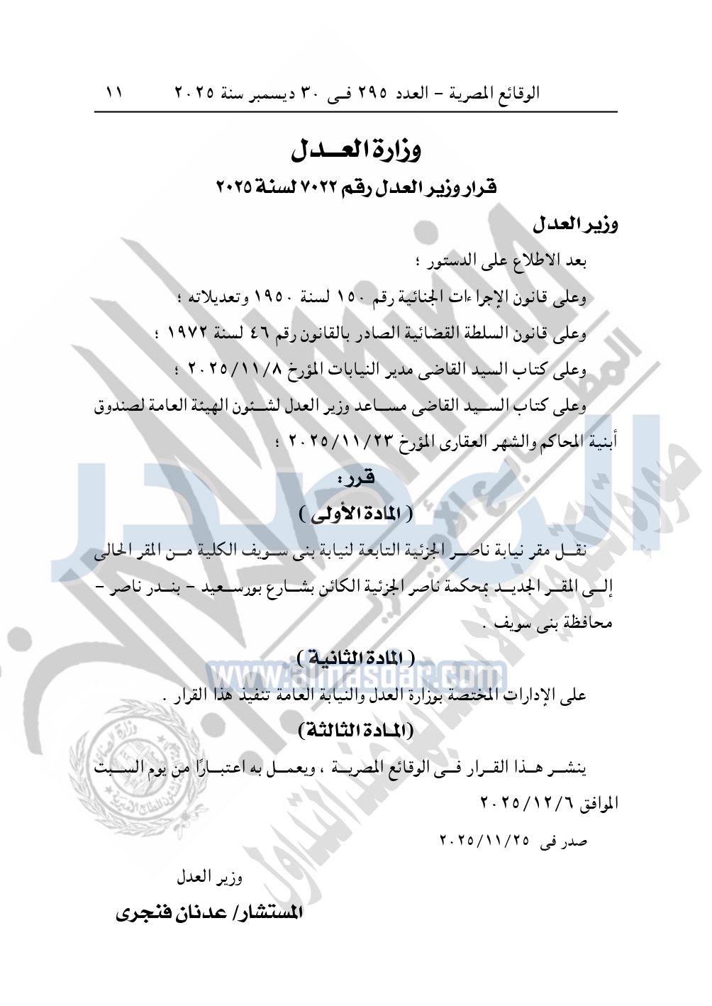 كما نشرت الوقائع المصرية في العدد 295، بتاريخ 30 ديسمبر 2025، قرار وزارة العدل، رقم 7021 لسنة 2025، بشأن نقل مقر نيابة ناصر الجزئية.