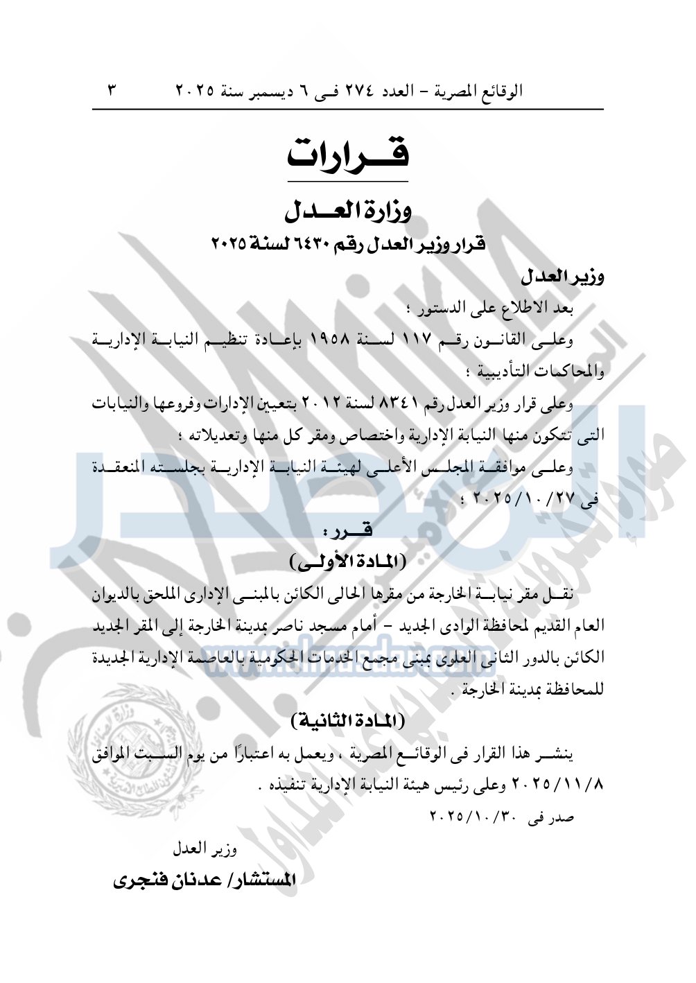 ونشرت الوقائع المصرية في العدد 274، بتاريخ 6 ديسمبر 2025، قرار وزارة العدل، رقم 6430 لسنة 2025، بشأن نقل مقر نيابة الخارجة.