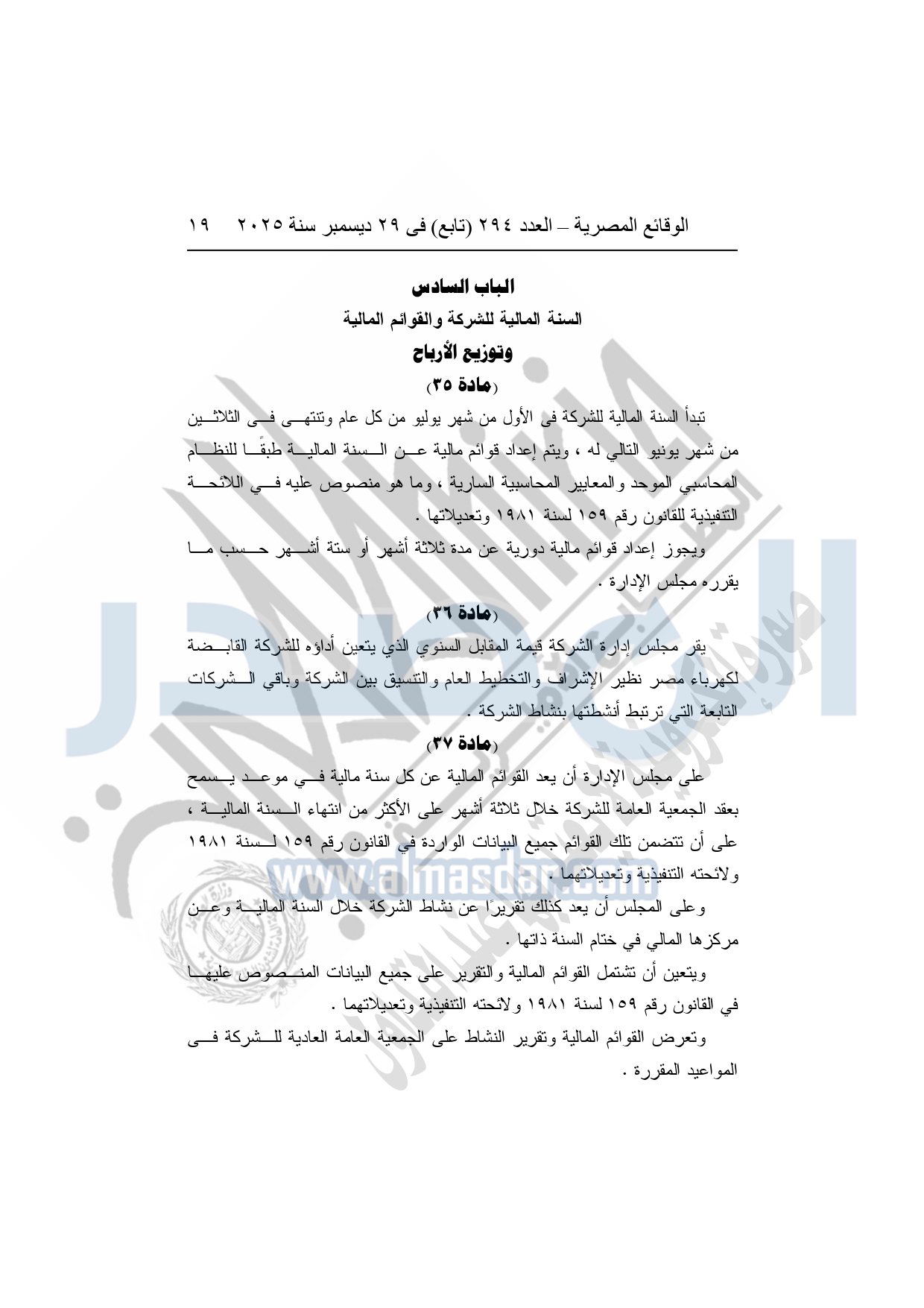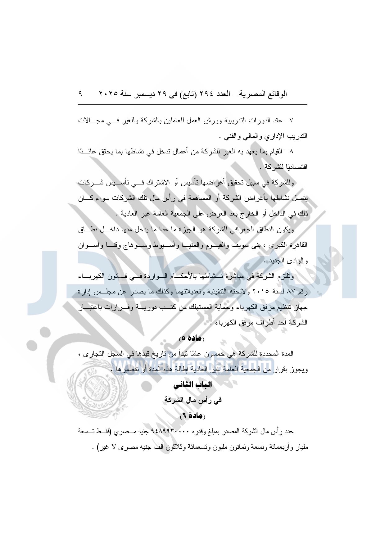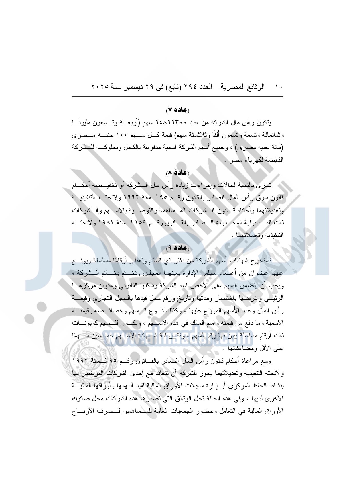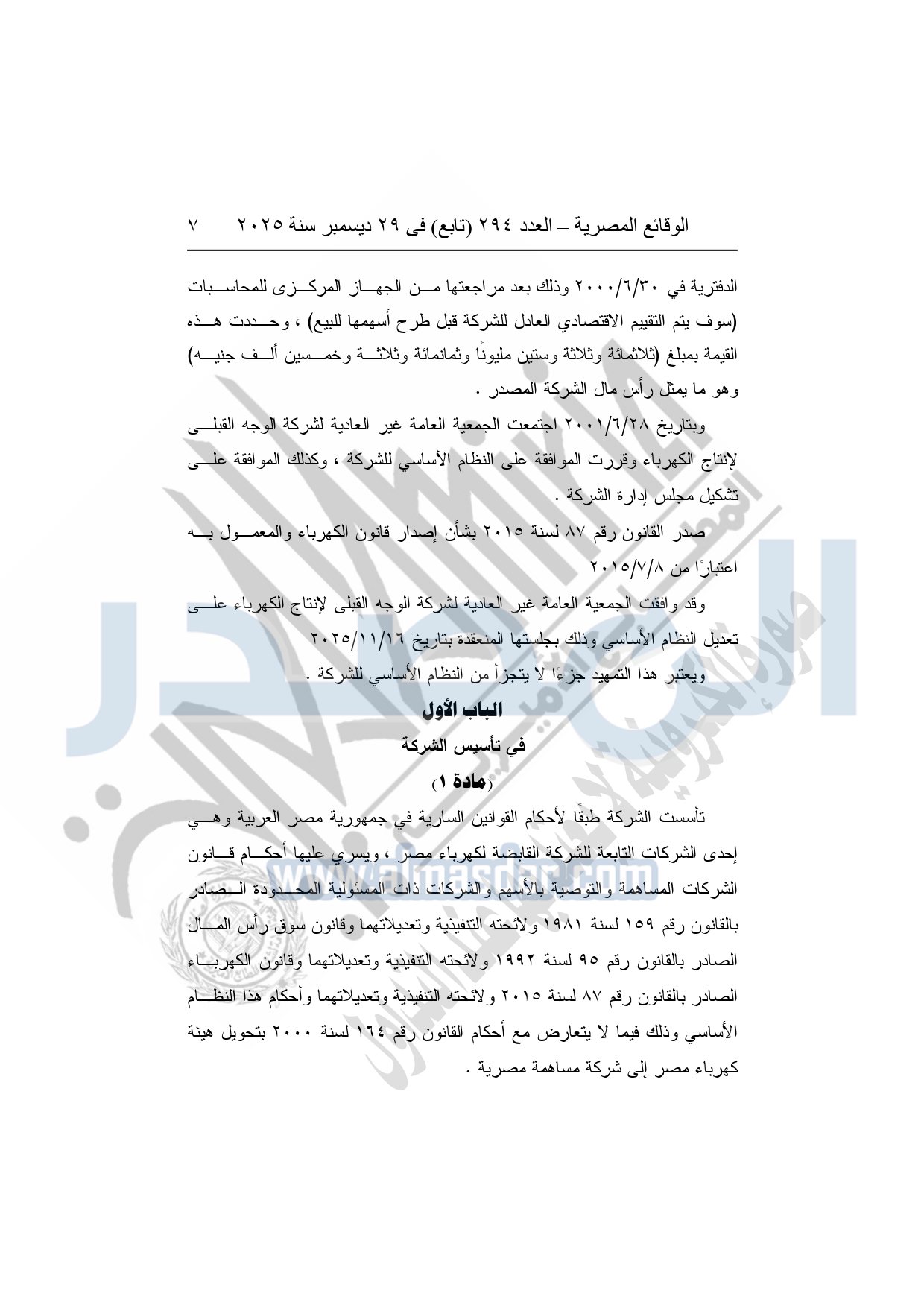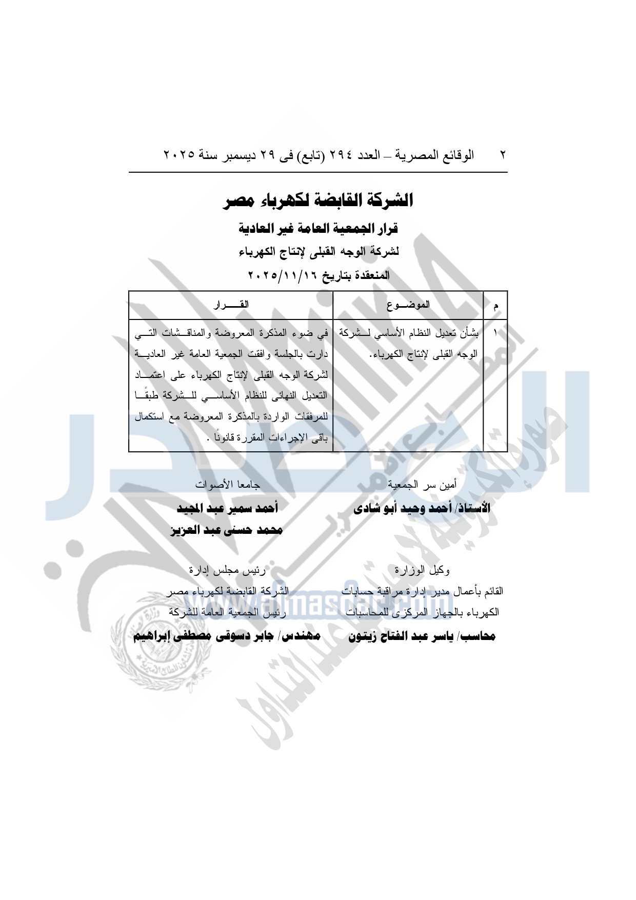 نشرت الوقائع المصرية في العدد 294 "تابع"، الصادر في 25 ديسمبر سنة 2025، الشركة القابضة لكهرباء مصر، قرار الجمعية العامة غير العادية لشركة الوجه القبلي لإنتاج الكهرباء، المنعقدة بتاريخ 16-11-2025