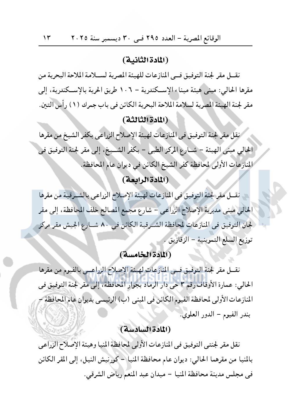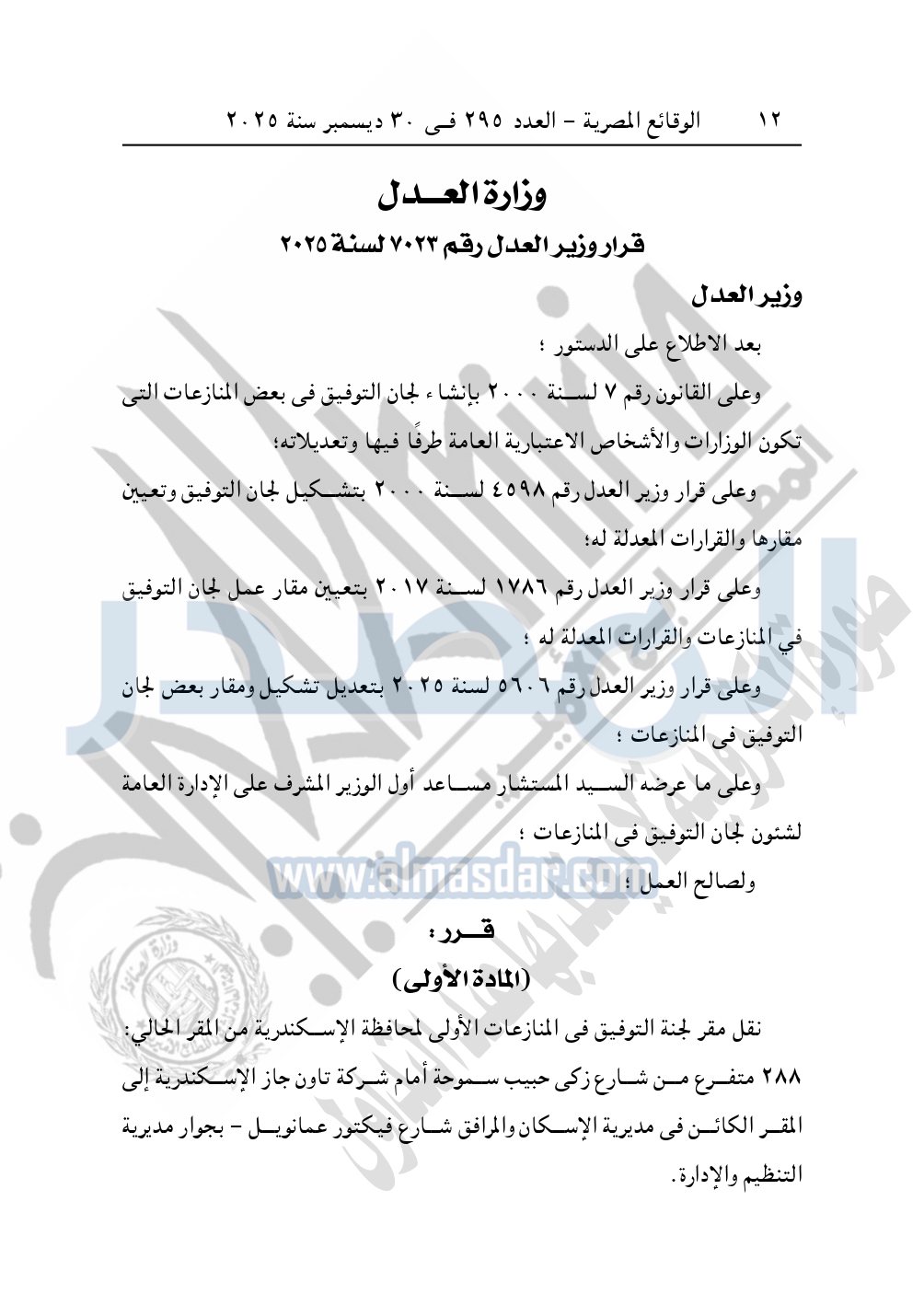 نشرت الوقائع المصرية في العدد 295، بتاريخ 30 ديسمبر 2025، قرار وزارة العدل، رقم 7023 لسنة 2025، بشأن نقل مقر لجنة التوفيق في المنازعات الأولى لمحافظة الإسكندرية.