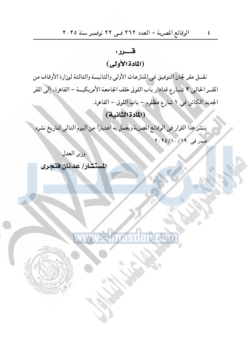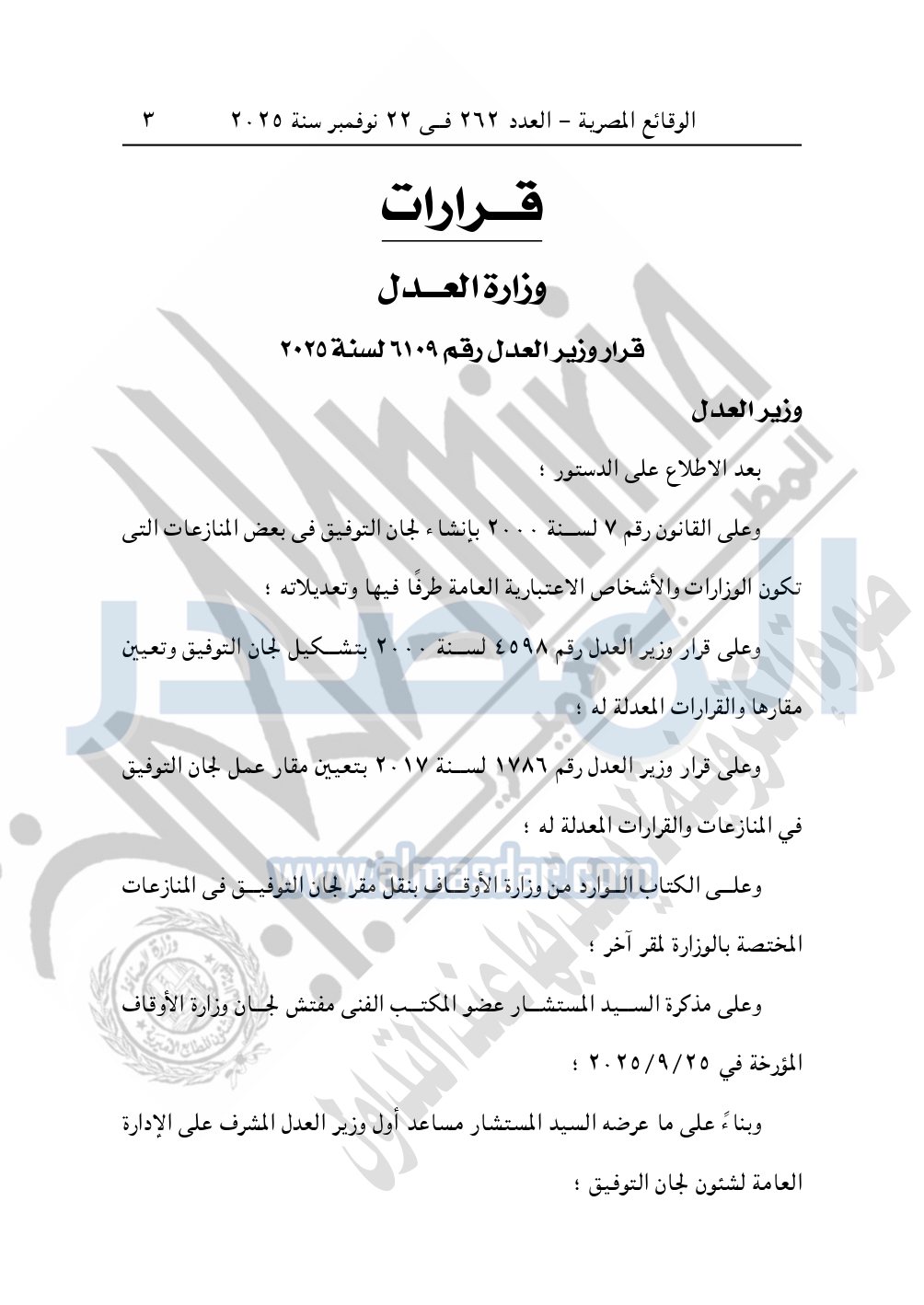 كما نشرت الوقائع المصرية في العدد 262، بتاريخ 22 نوفمبر 2025، قرار وزارة العدل، رقم 6109 لسنة 2025، بشأن نقل مقر لجان التوفيق في المنازعات الأولى والثانية والثالثة لوزارة الأوقاف.