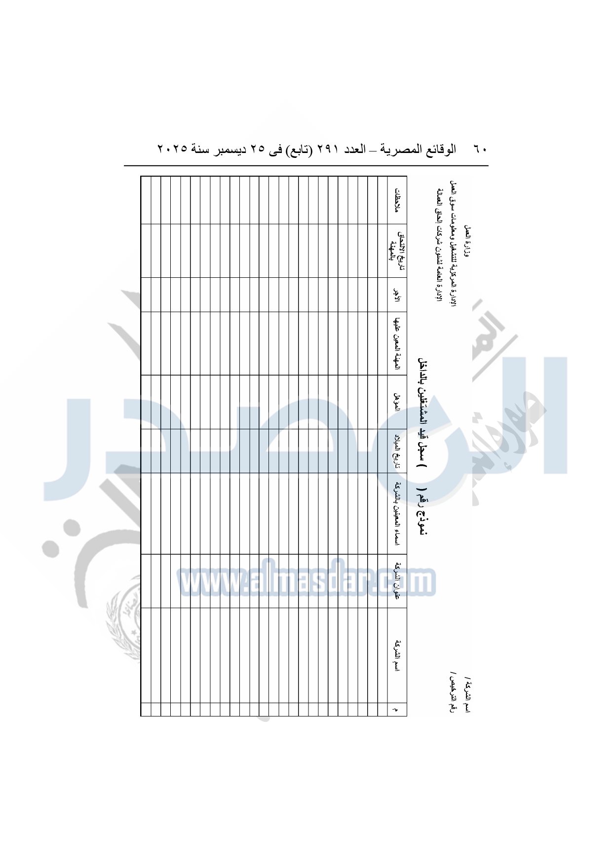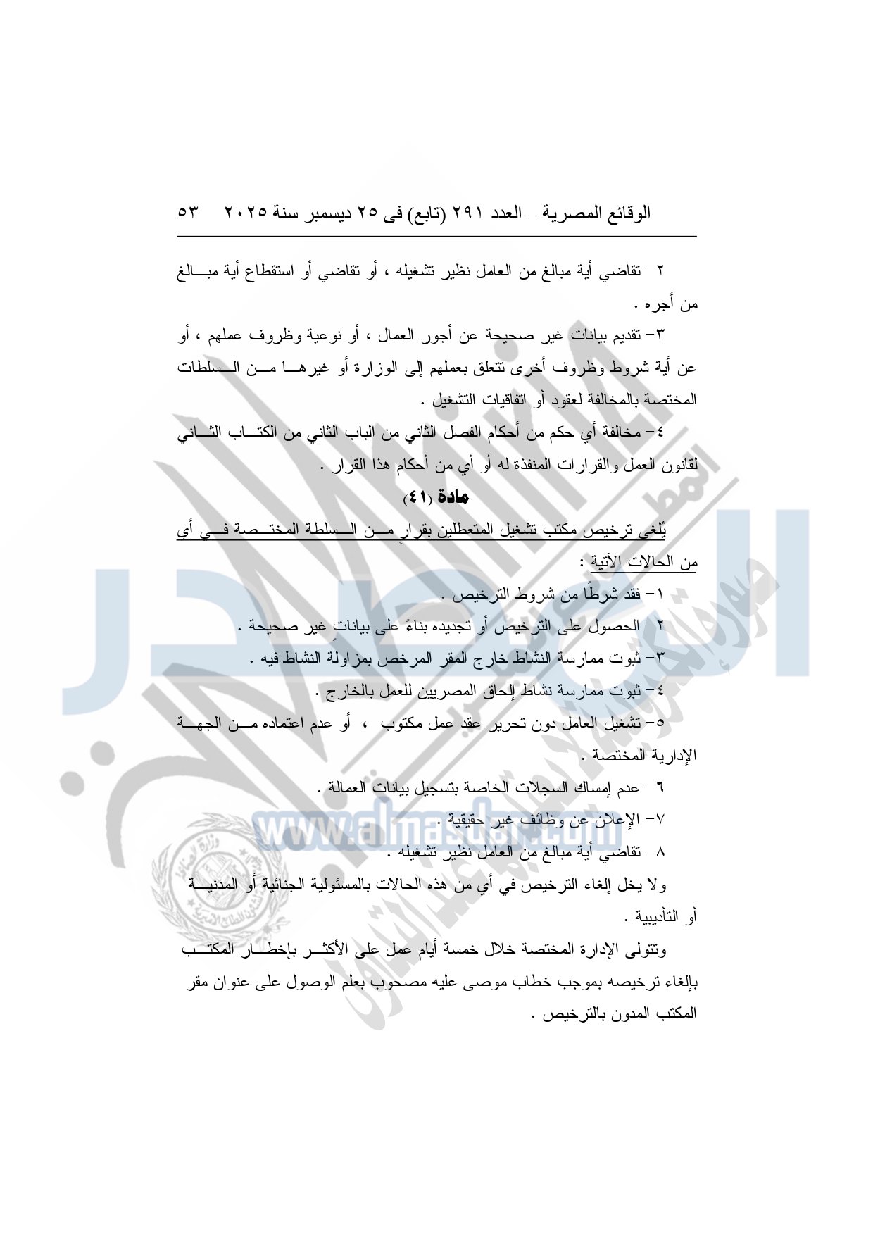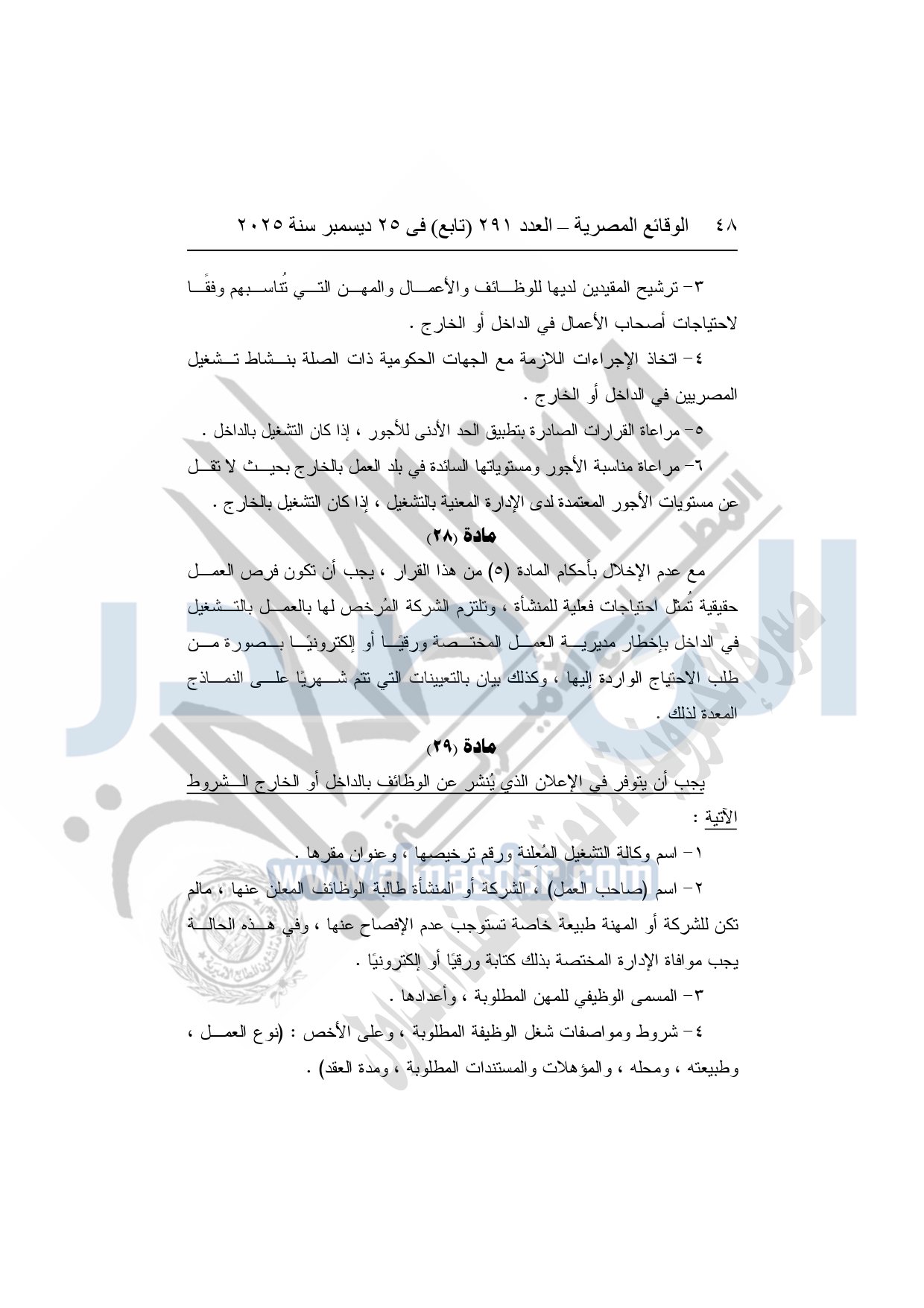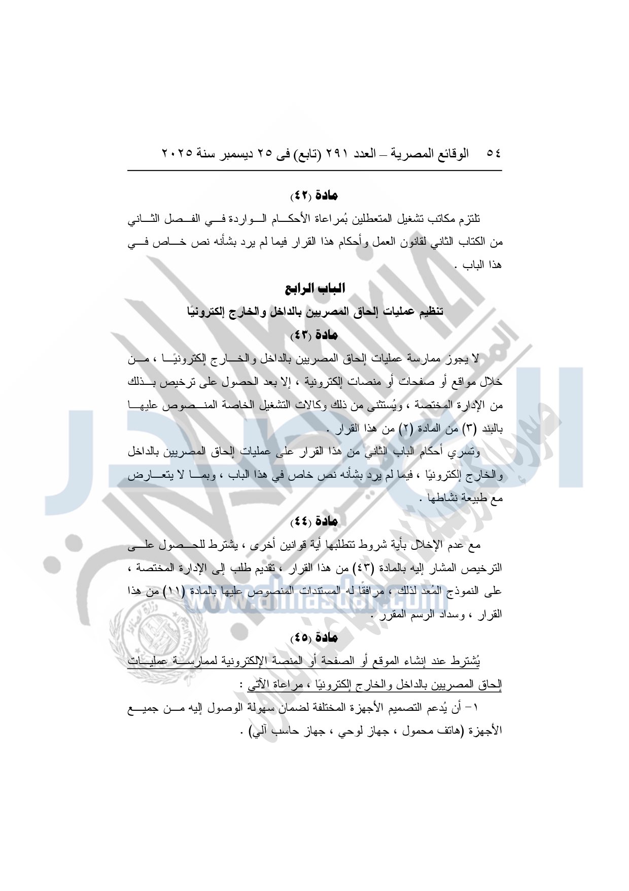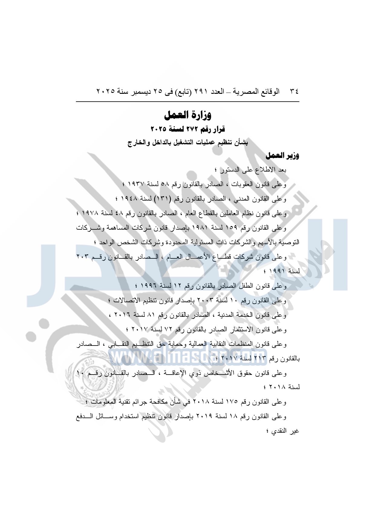 نشرت الوقائع المصرية في العدد 291 "تابع"، بتاريخ 25 ديسمبر 2025، قرار وزارة العمل، رقم 272 لسنة 2025، بشأن تنظيم عمليات التشغيل بالداخل والخارج.