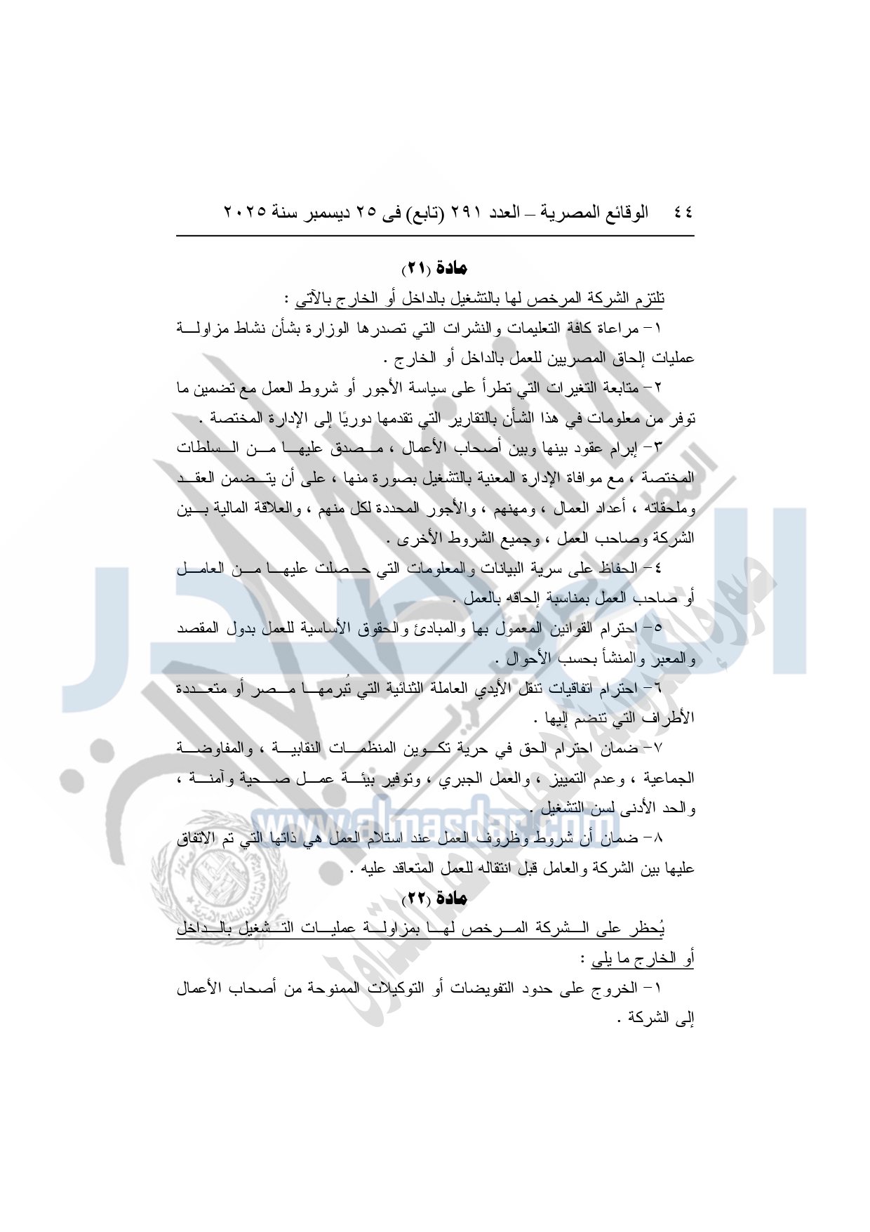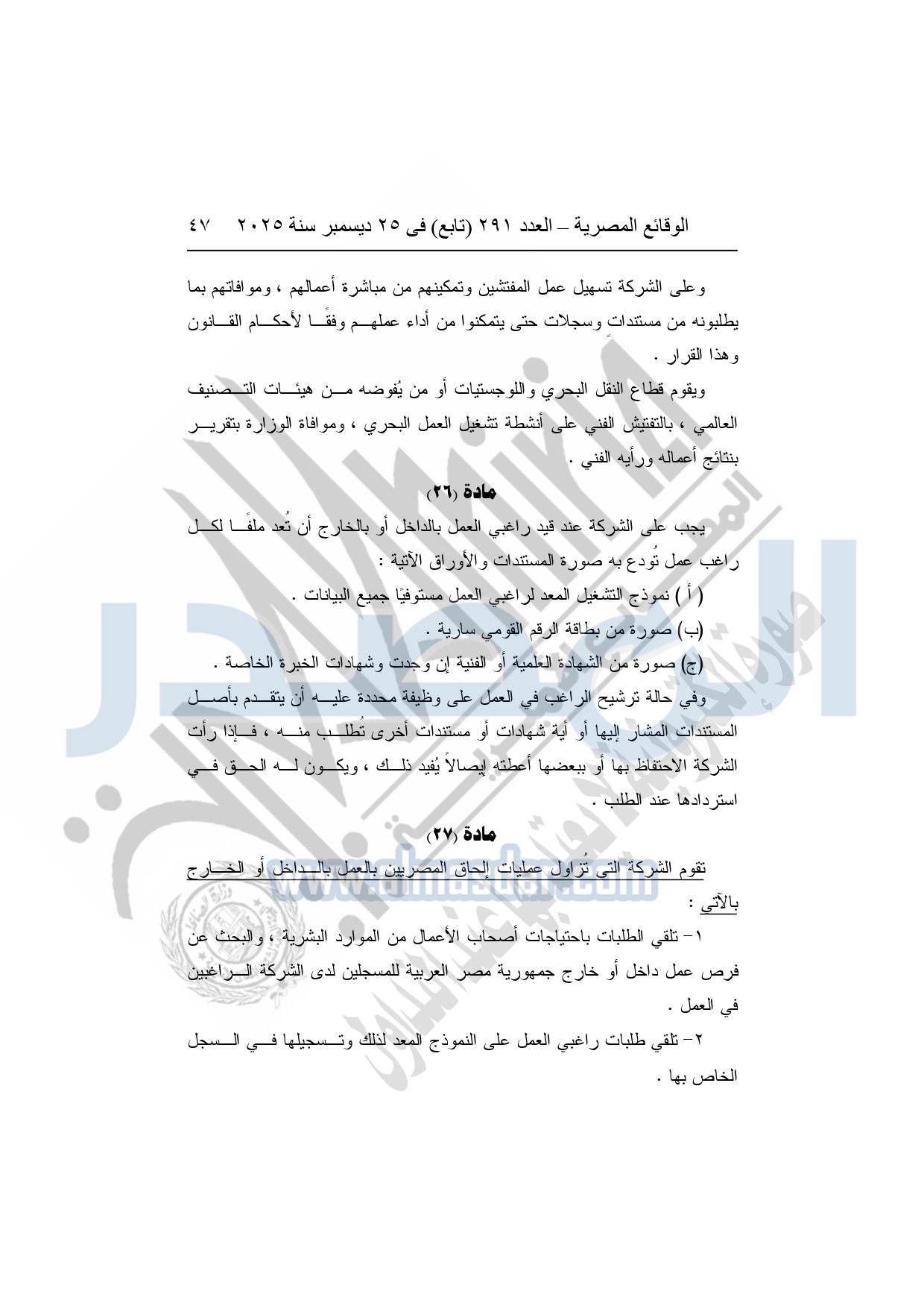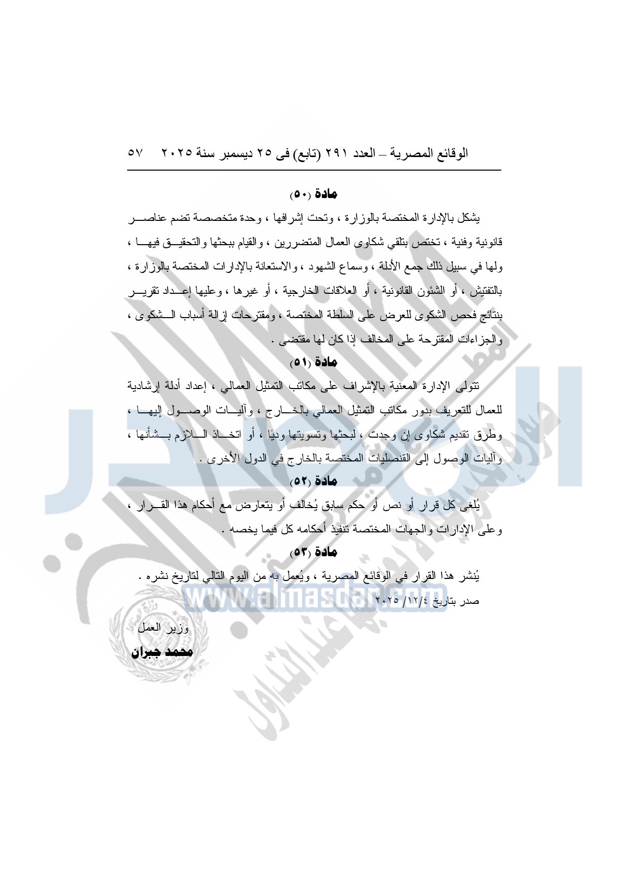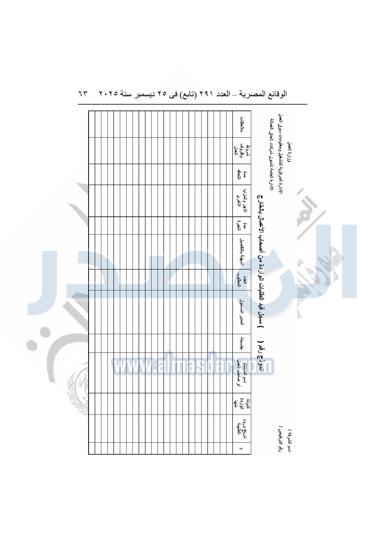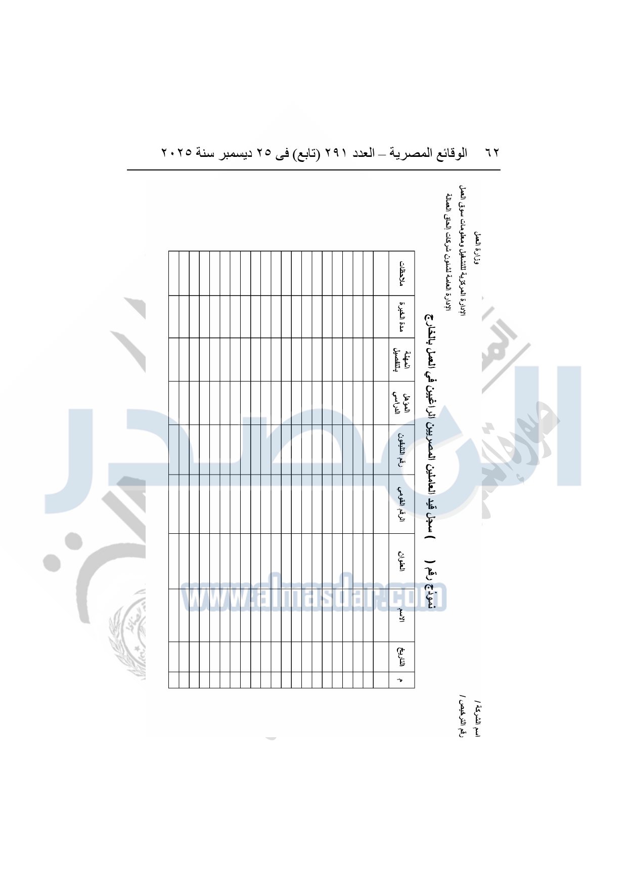 نشرت الوقائع المصرية في العدد 291 "تابع"، بتاريخ 25 ديسمبر 2025، قرار وزارة العمل، رقم 272 لسنة 2025، بشأن تنظيم عمليات التشغيل بالداخل والخارج.
