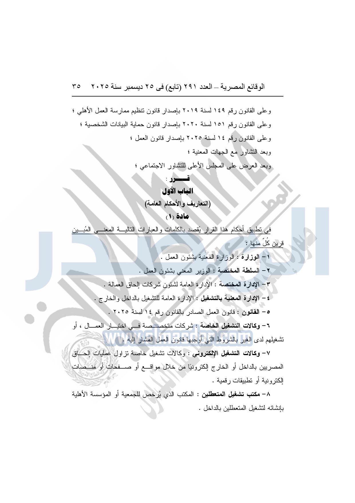 5- القانون: قانون العمل الصادر بالقانون رقم 14 لسنة 2025.